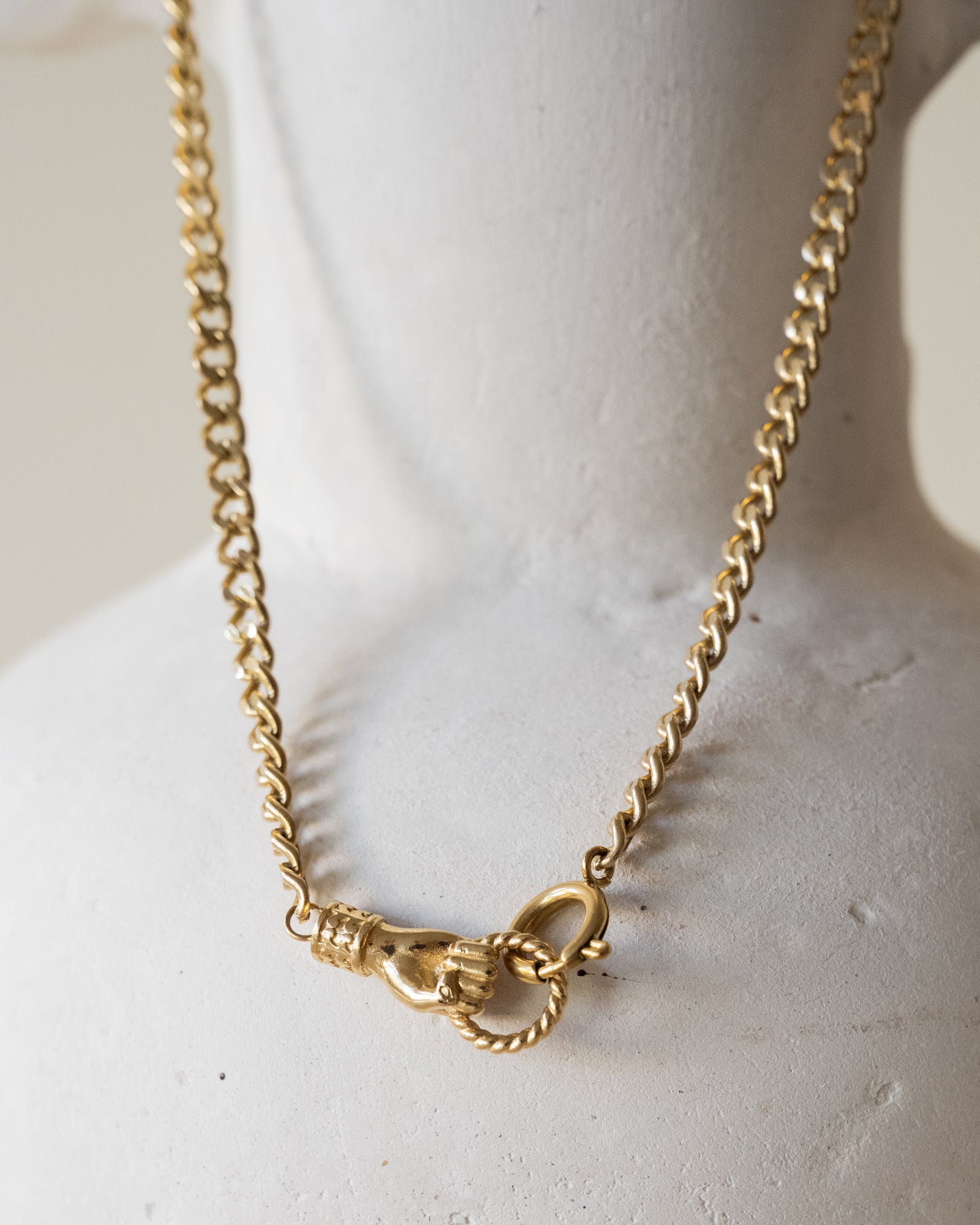 Gold chain with special hand clasp.