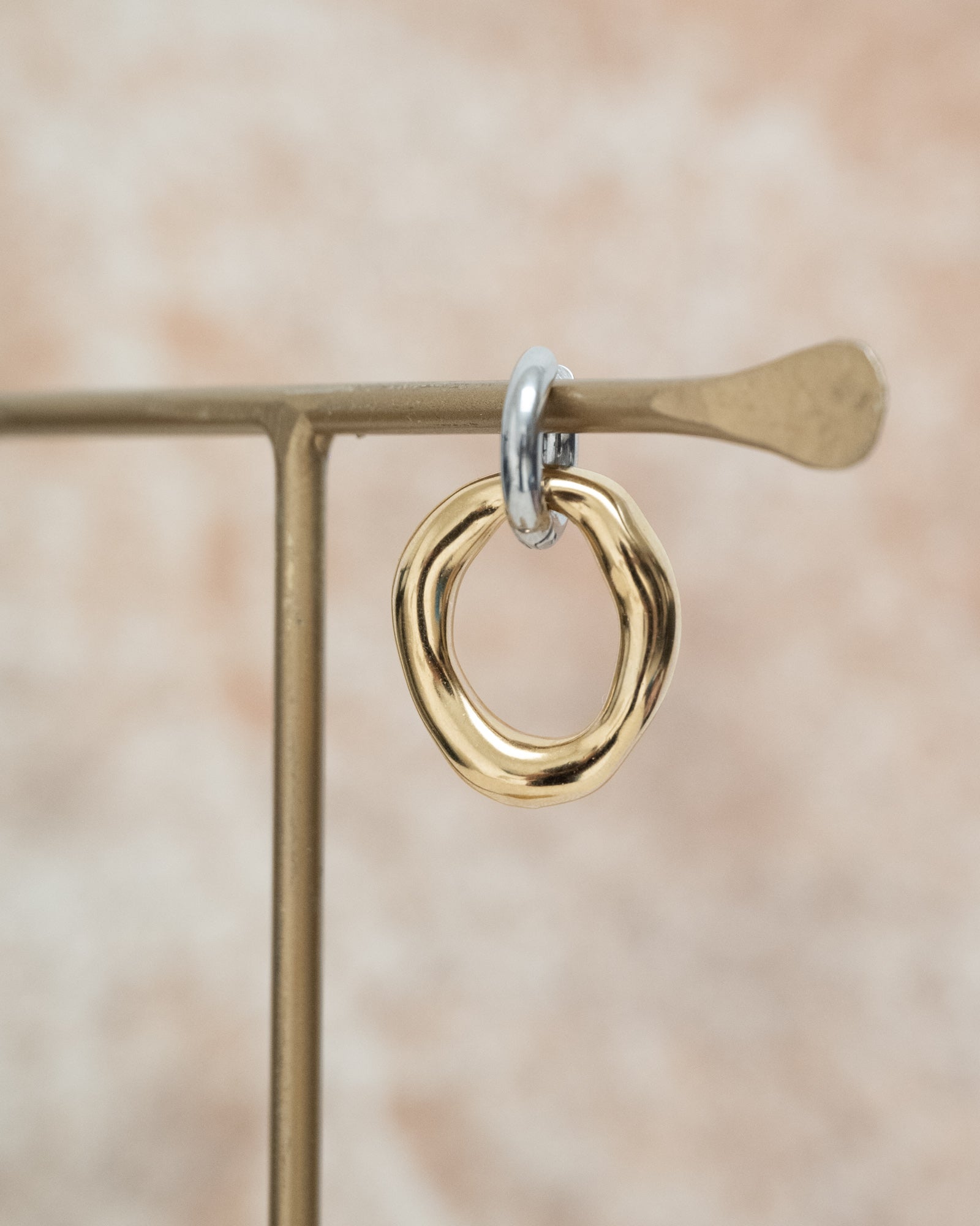 A silver hoop with a gold organic pendant. We love the combination of gold & silver!