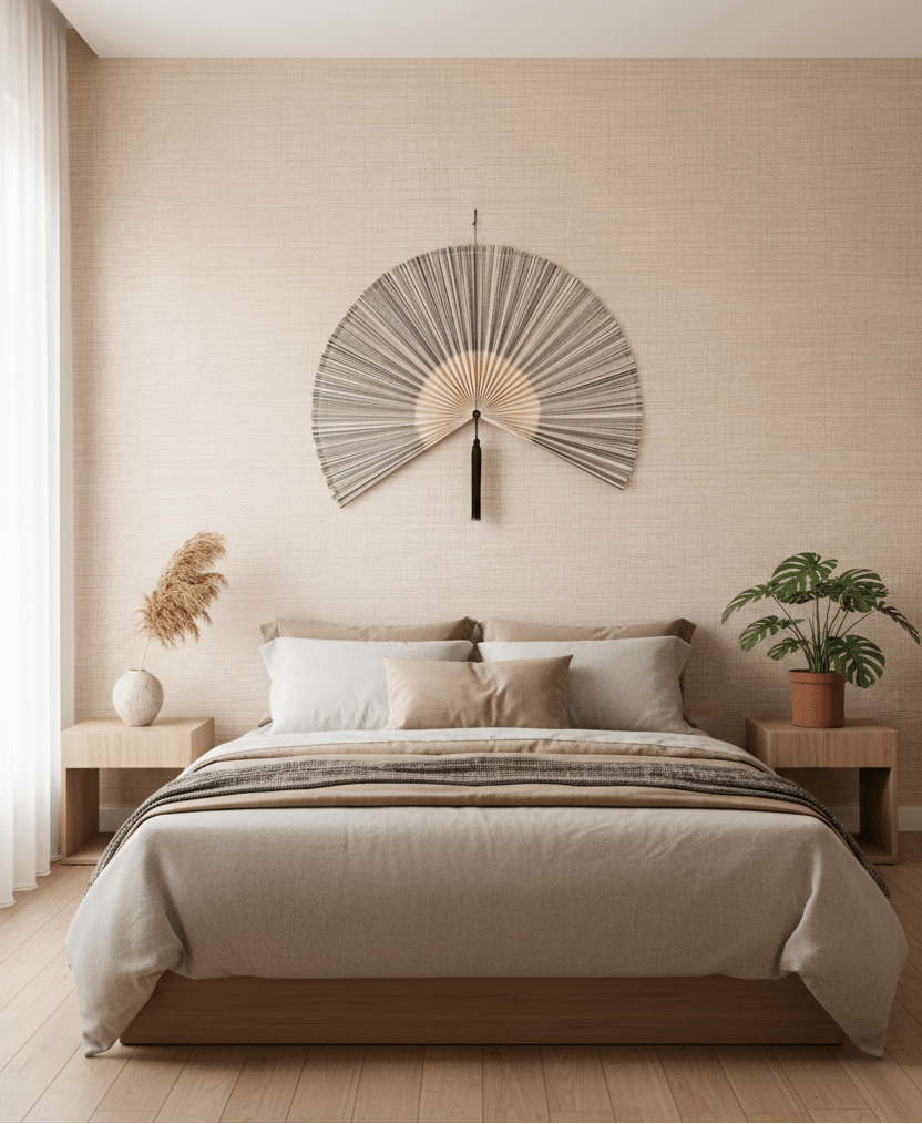A unique bamboo and cotton wall decoration that instantly brings warmth and ambiance to your interior. With an impressive 1.45-meter diameter, this fan is the perfect eye-catcher above a double bed, sofa, or in the hallway.