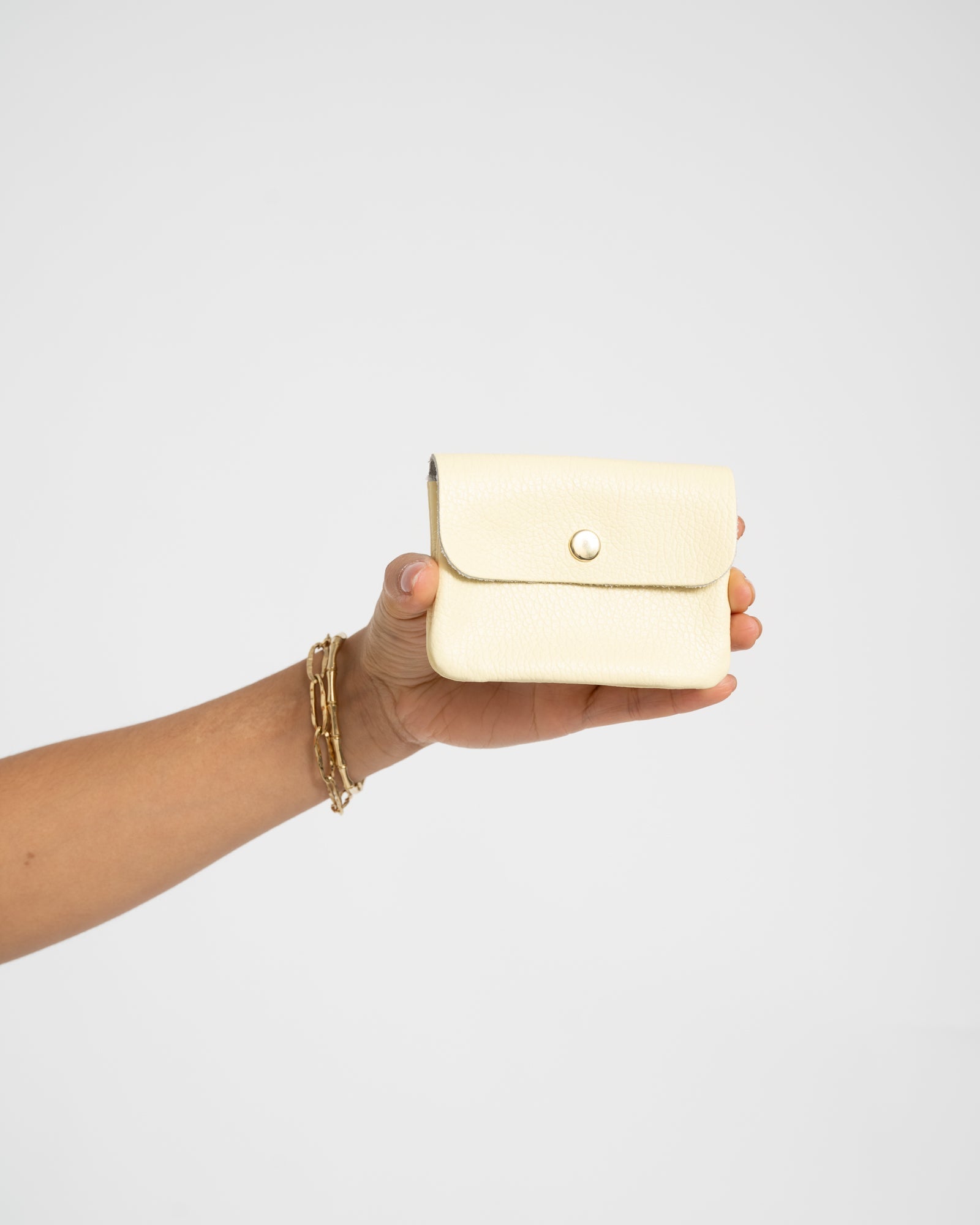 Compacte portemonnee in een zachte gele tint met een drukknoopsluiting. Praktisch formaat voor pasjes en muntgeld.