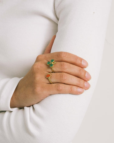 Goudkleurige ring met een klavertje vier van donkergroene resin. Een speels en betekenisvol design dat staat voor geluk en stijl. Perfect om solo te dragen of te combineren met andere ringen. 💚✨