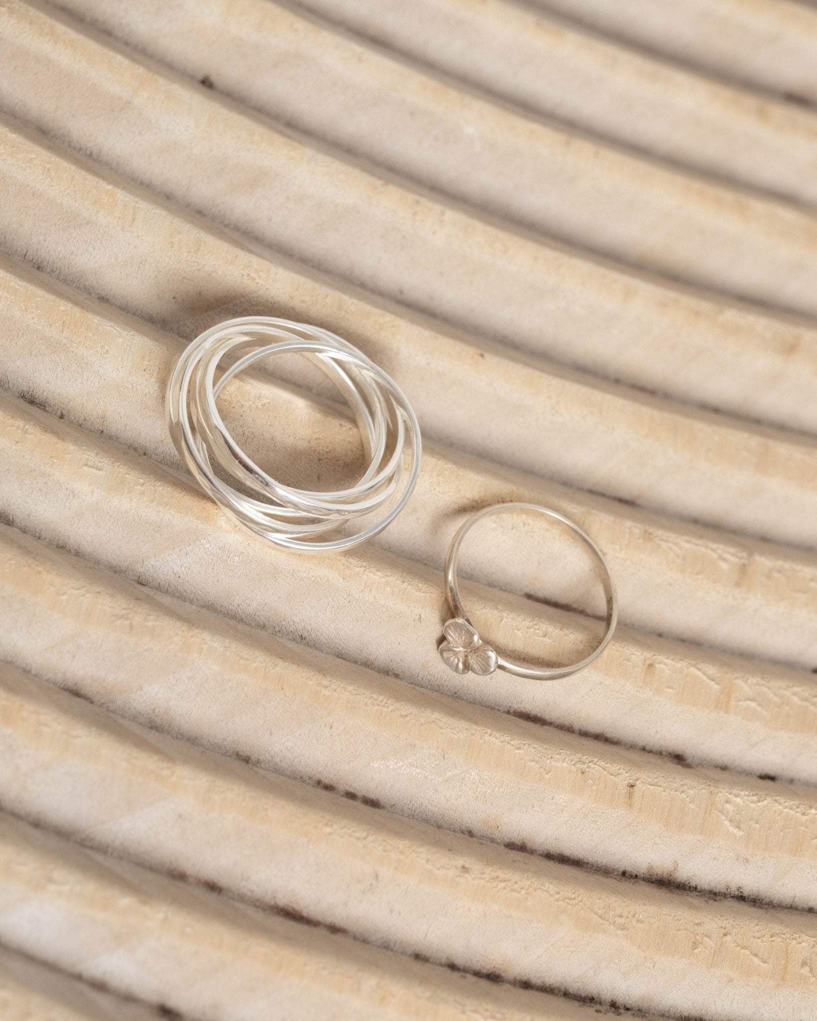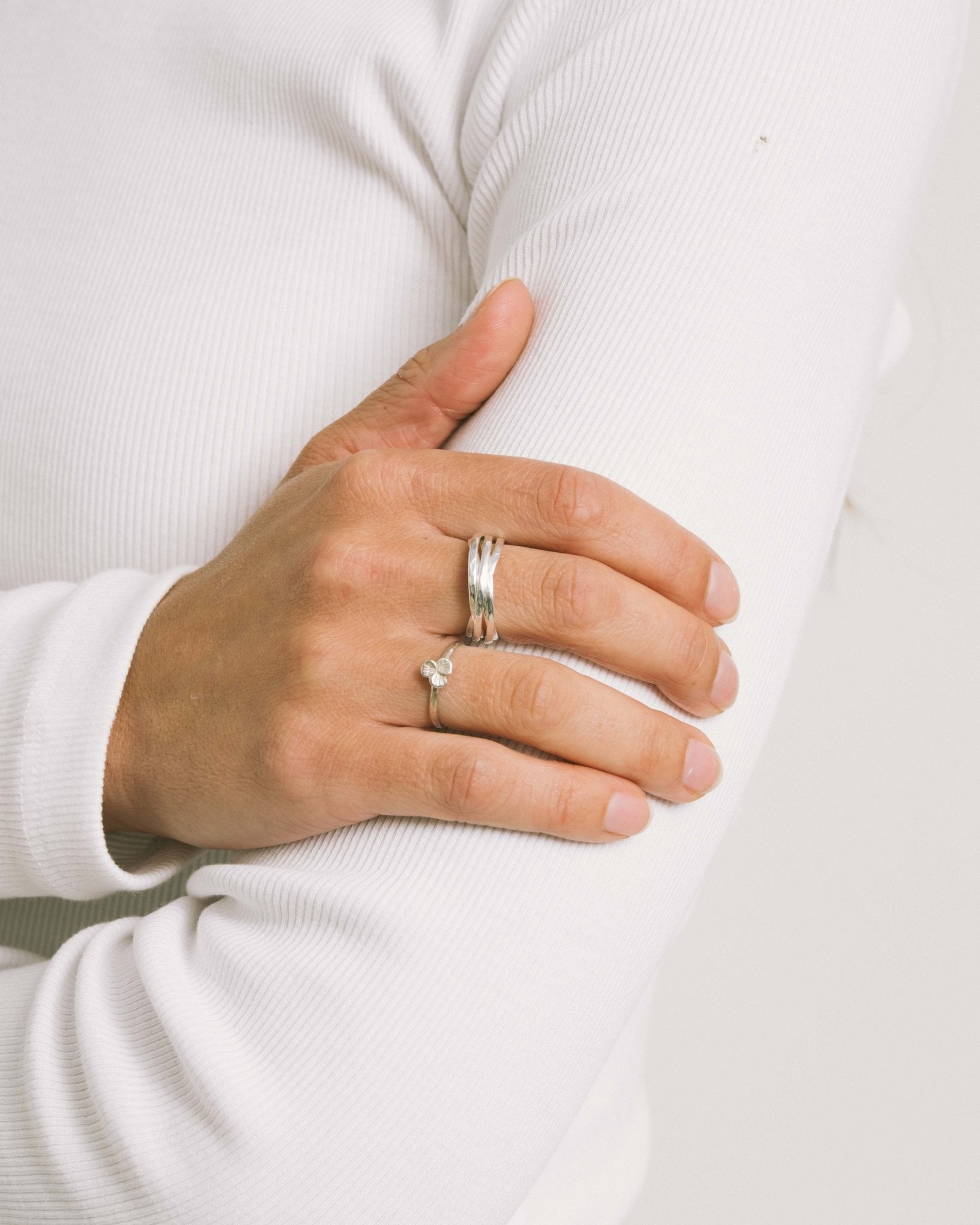 Silver-colored ring with a subtle clover detail. Timeless and elegant, perfect for wearing solo or layering. ✨