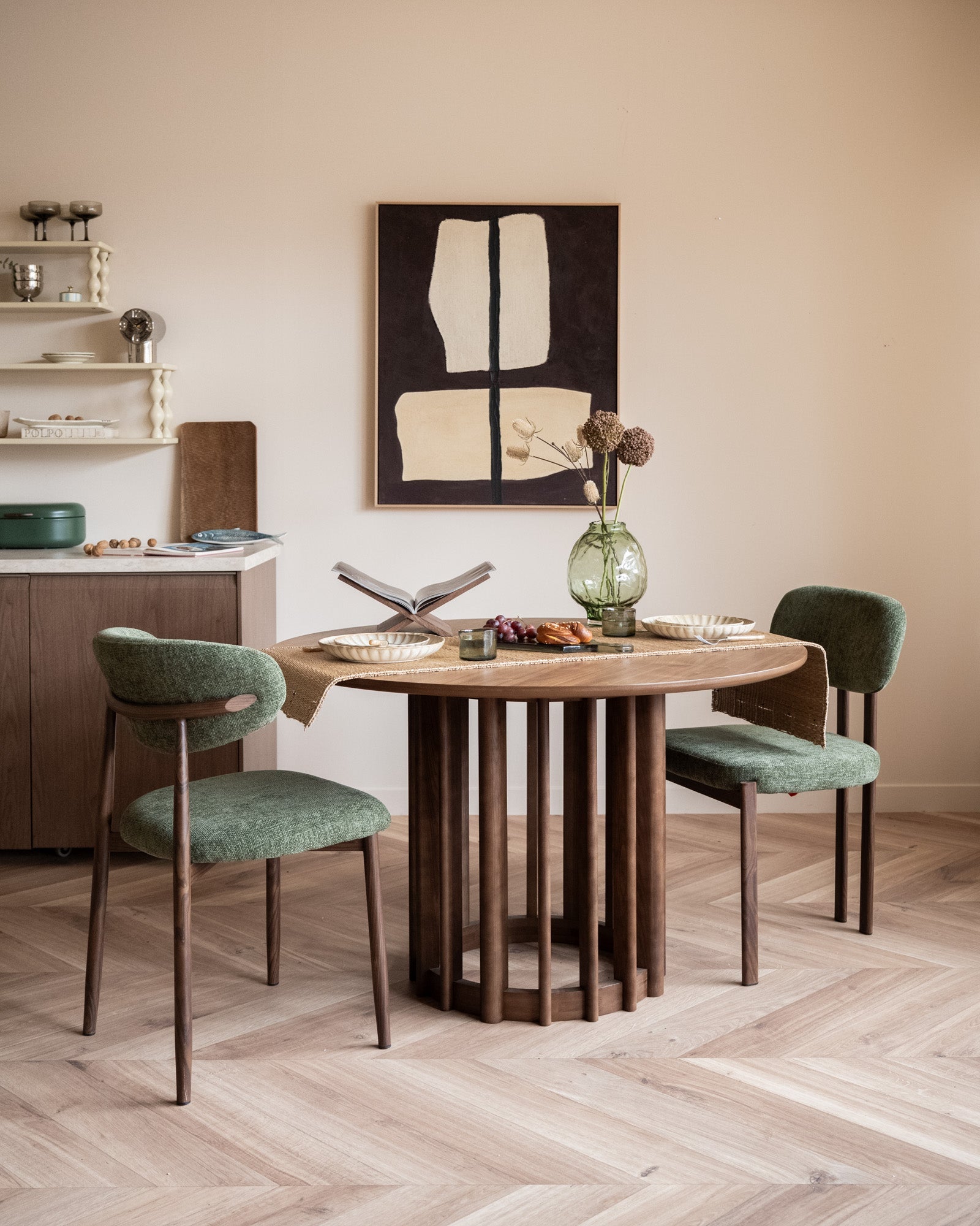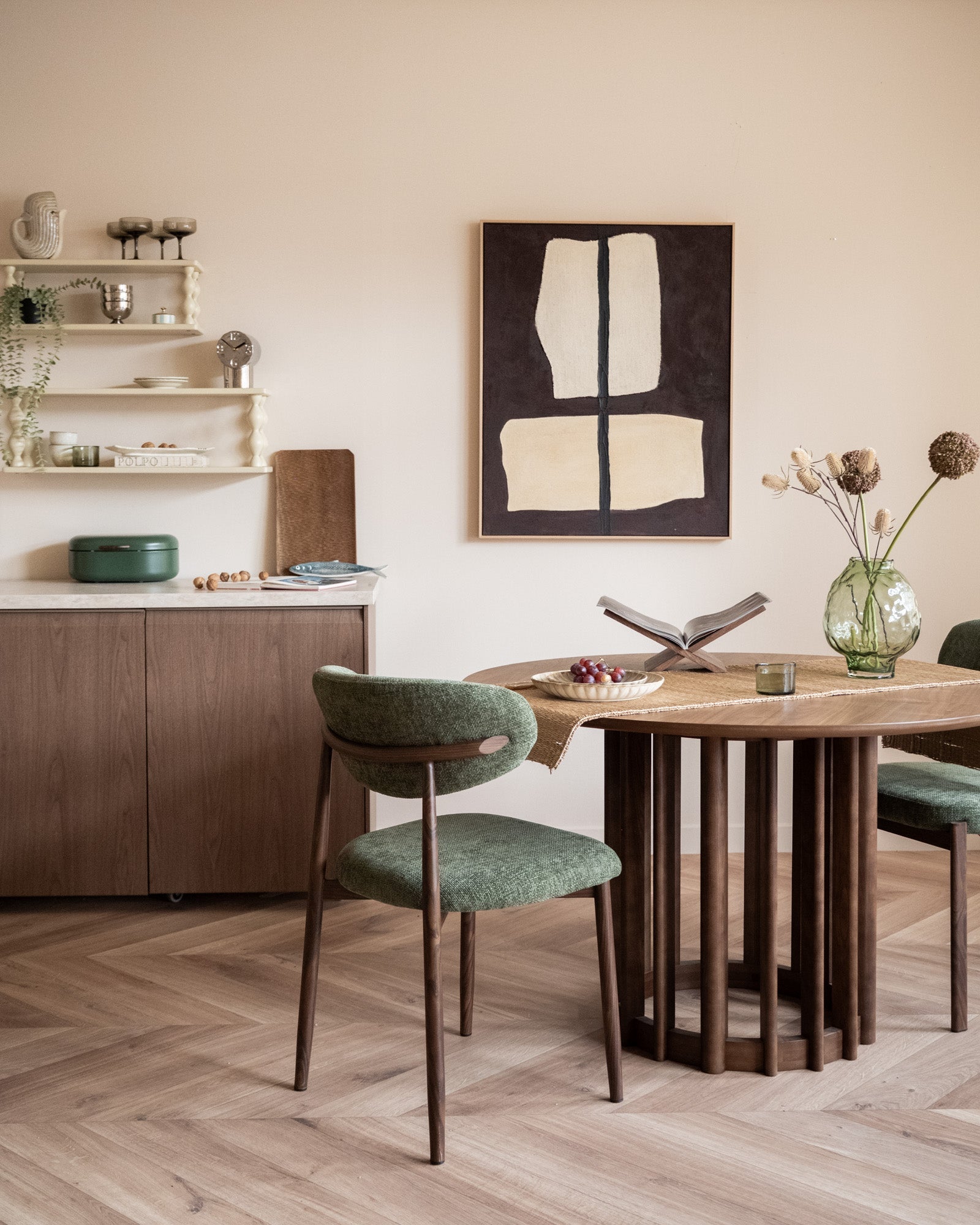 Dining Chair Kumo Green heeft een zachte, moderne uitstraling dankzij de comfortabele groene zitting en het elegante frame van metaal met houtlook. De open rugleuning zorgt voor een luchtig silhouet, terwijl de ergonomische vorm prettig zit tijdens lange diners of gezellige avonden aan tafel. Een tijdloze eetkamerstoel die moeiteloos past in moderne, Japandi en Scandinavische interieurs.