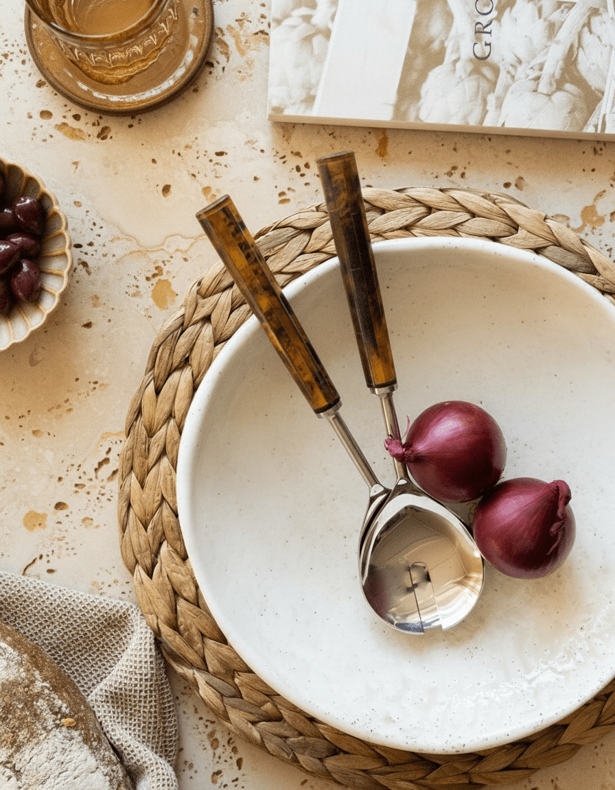 Deze stijlvolle saladebestekset geeft een luxe touch aan elke tafelsetting. Met glanzende metalen lepels en warme, amberkleurige handvatten combineert de Sabaï set elegantie met functionaliteit. Perfect voor zowel een chique diner als een casual lunch – een musthave voor wie houdt van mooi tafelen!
