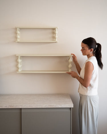 Bloomingville – Wall Shelf Salino is een stijlvolle wandplank met een speels, sculpturaal pootdesign en een zachte, tijdloze kleur. Perfect voor het stylen van je favoriete accessoires, servies of boeken in de keuken, woonkamer of hal. Verkrijgbaar in small en medium, leuk om los te gebruiken of te combineren voor een speels effect aan de muur.
