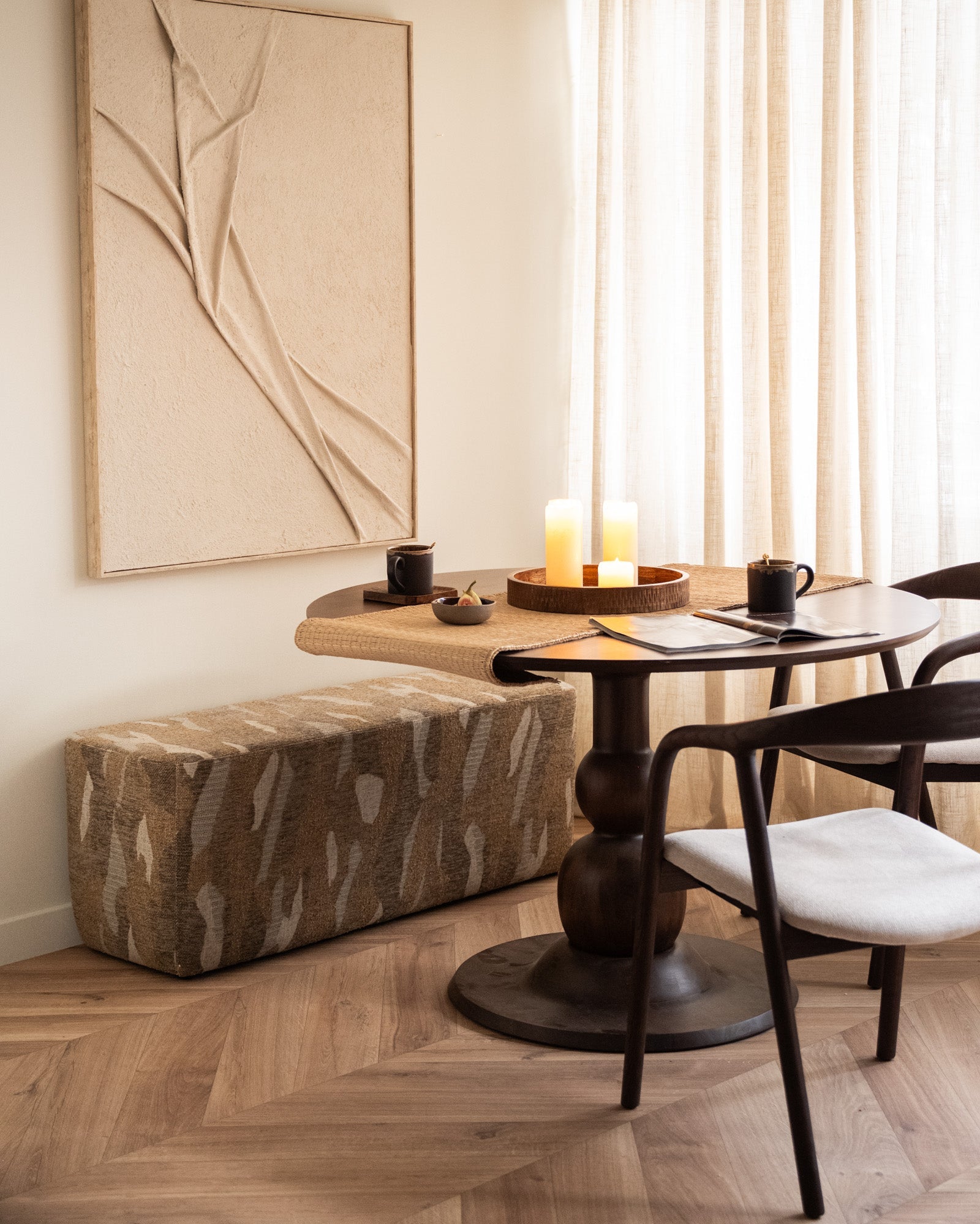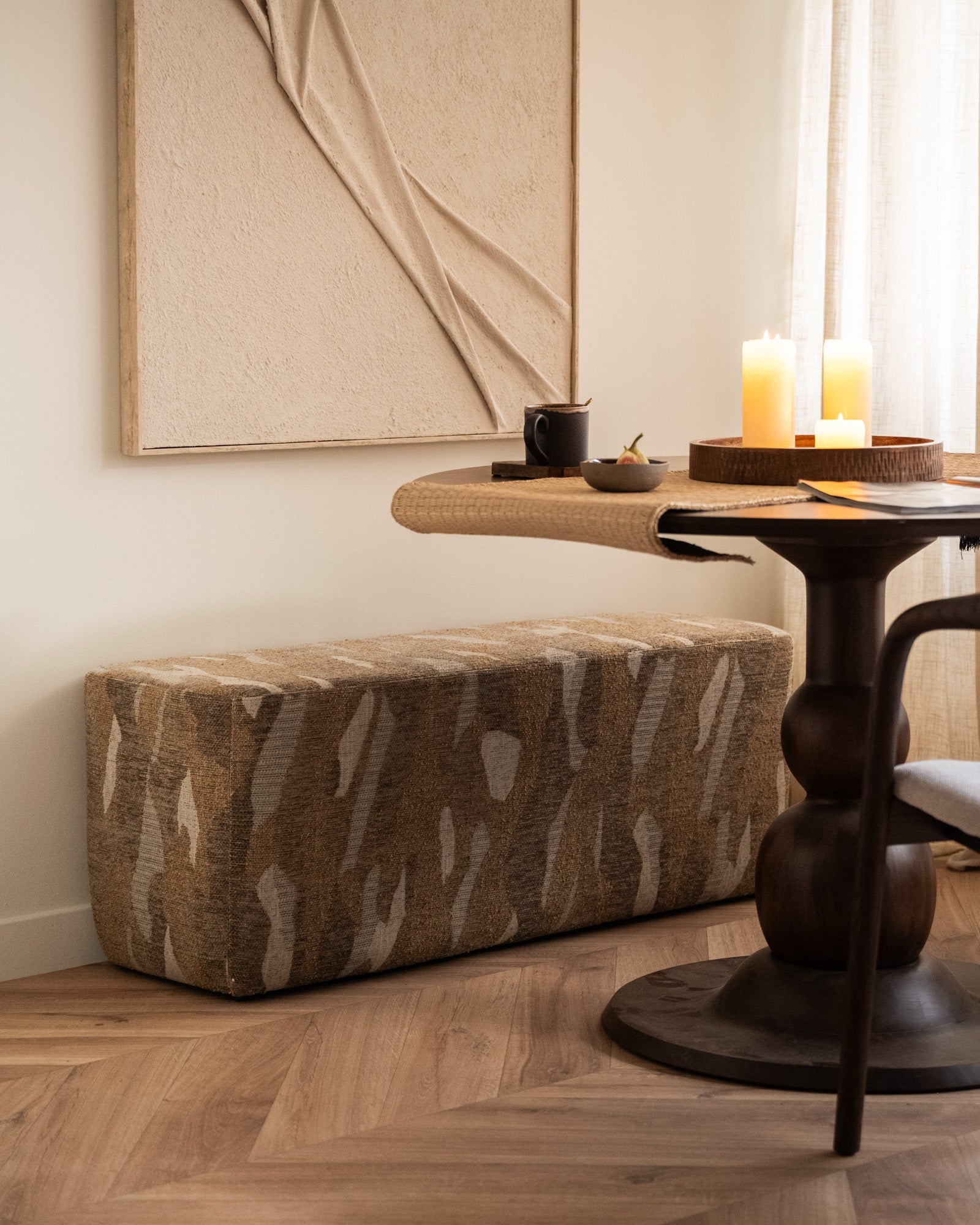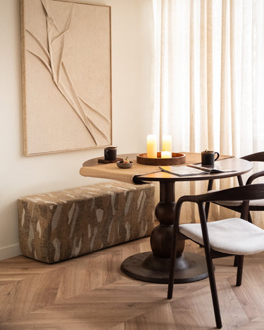 Bench Rytm is een stijlvolle en veelzijdige zitbank die elk interieur een warme, moderne uitstraling geeft. Met zijn unieke patroon en zachte bekleding is hij perfect voor in de hal, aan het voeteneind van het bed of als extra zitplek aan de eettafel. Een functioneel én sfeervol meubelstuk dat zich moeiteloos laat combineren met diverse woonstijlen.
