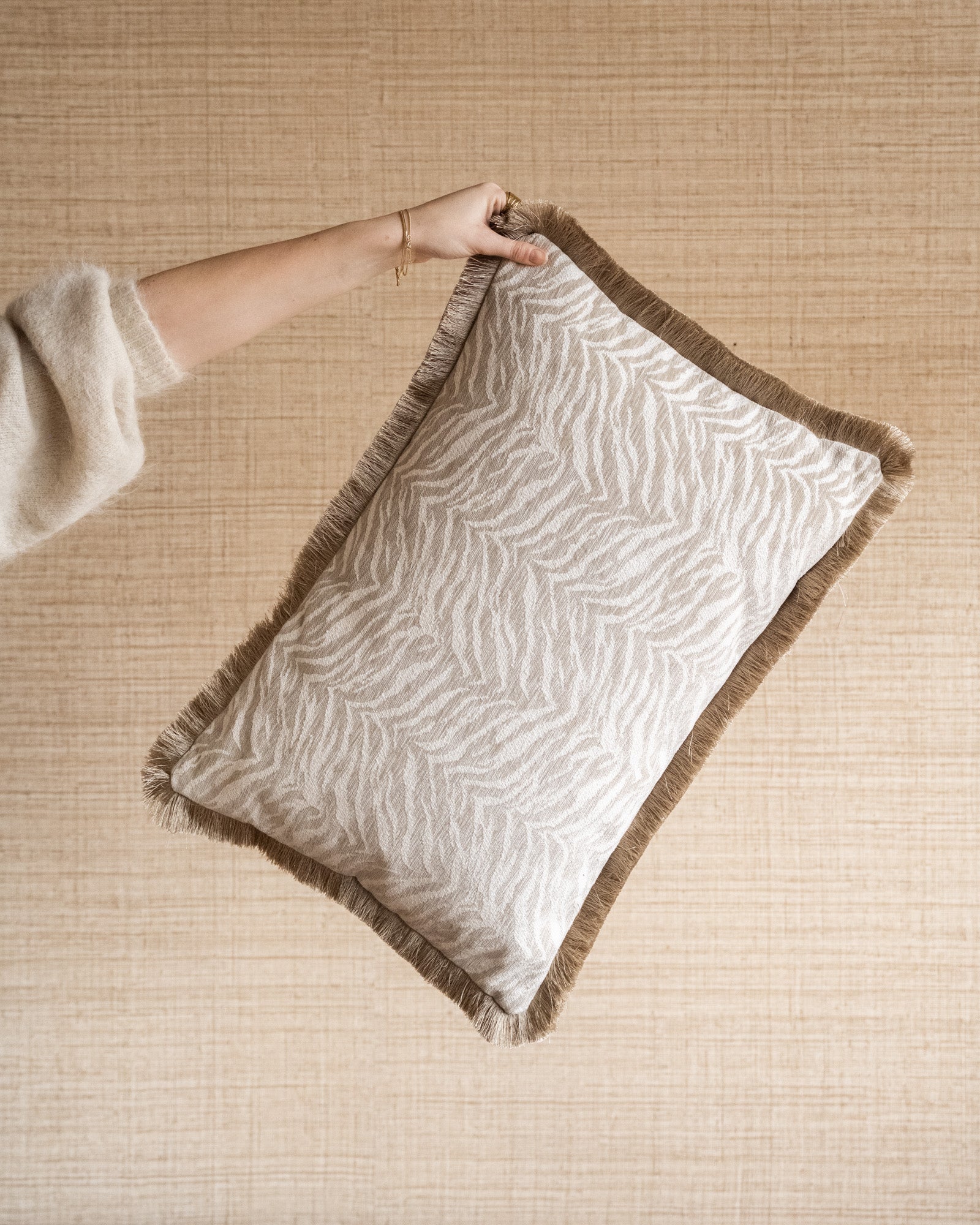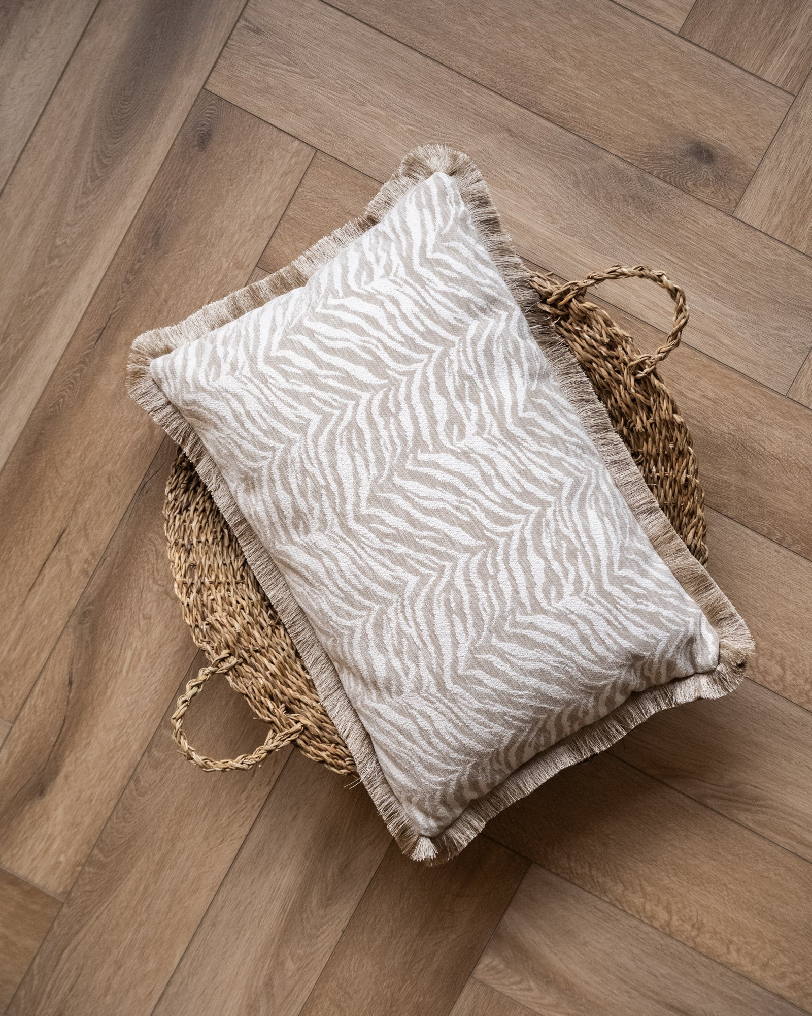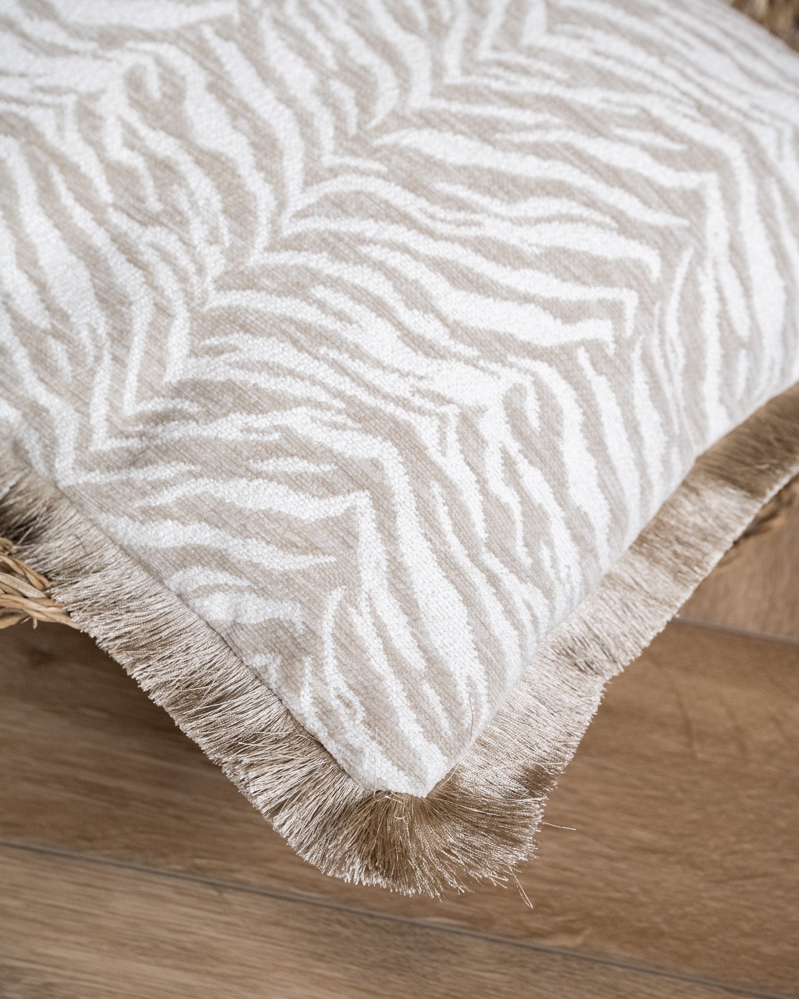 Voeg een subtiele touch van jungle chic toe aan je bank of fauteuil met het Cushion Tigra Beige. De elegante zebraprint in zachte beige- en zandtinten zorgt voor een rustige maar speelse uitstraling. De franjerand geeft het kussen een extra boho vibe, perfect om textuur en warmte toe te voegen aan je zithoek.