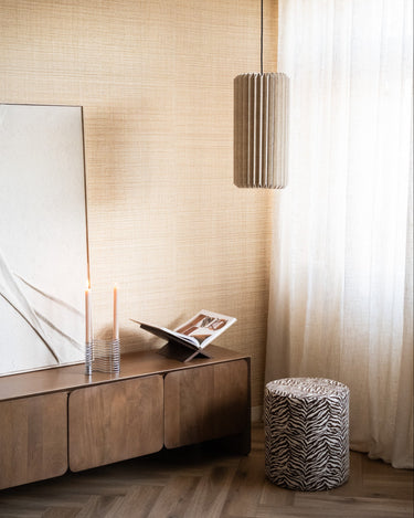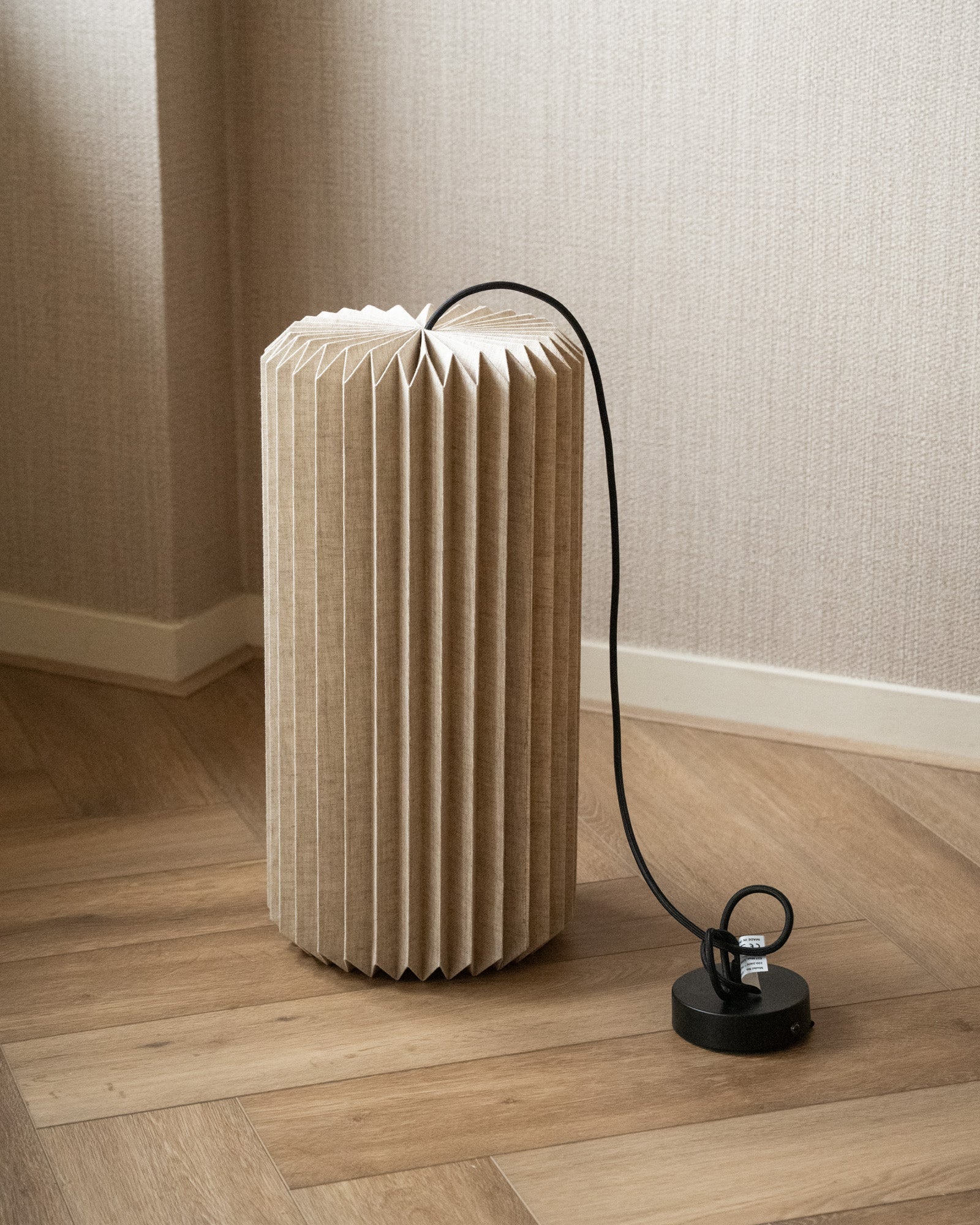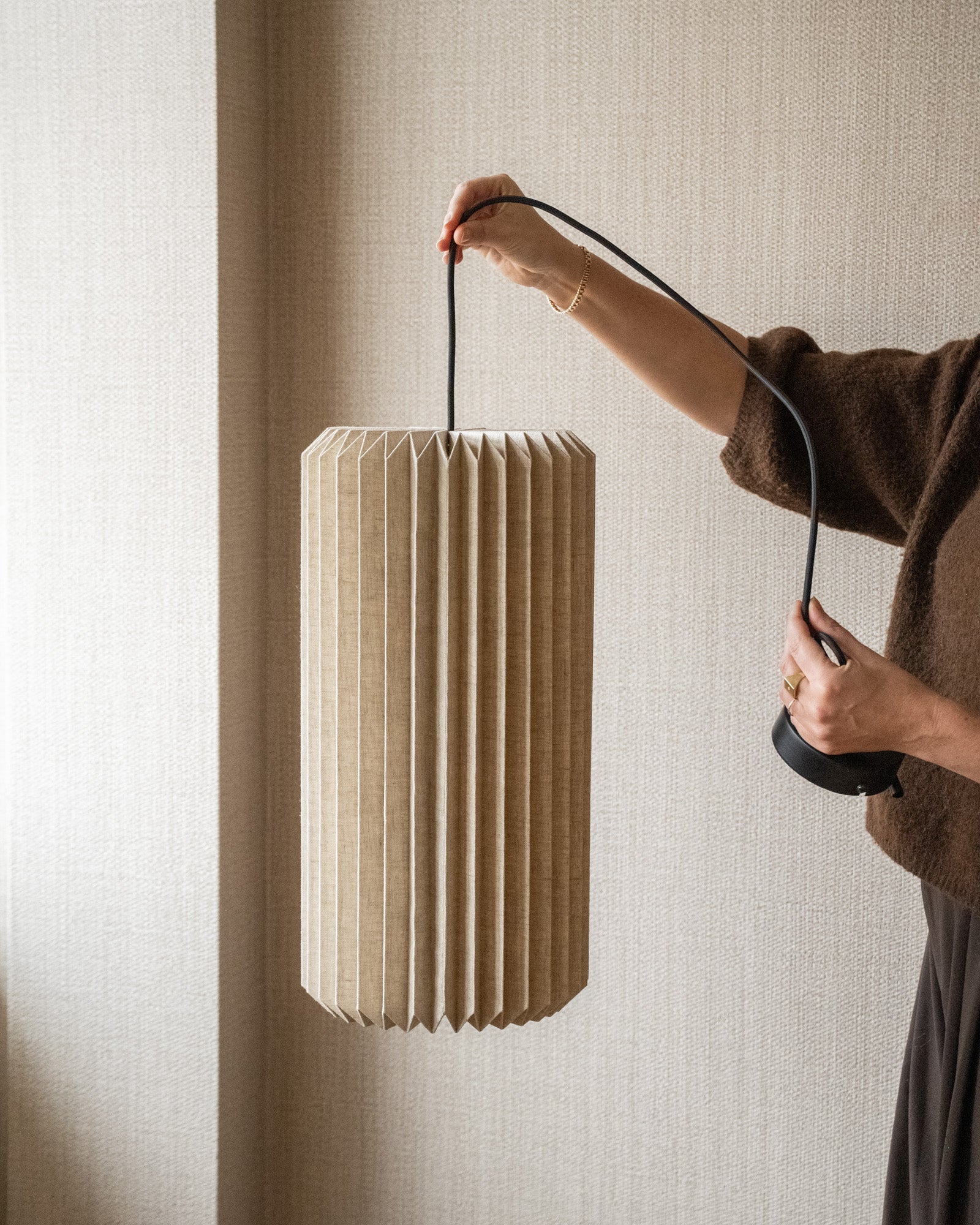 Een natuurlijke eyecatcher boven je zithoek. Deze hanglamp van geplooid linnen voegt warmte en structuur toe aan je interieur, en verspreidt een zacht diffuus licht. Minimalistisch design met een rustige uitstraling, perfect voor liefhebbers van serene, Japandi geïnspireerde sferen.