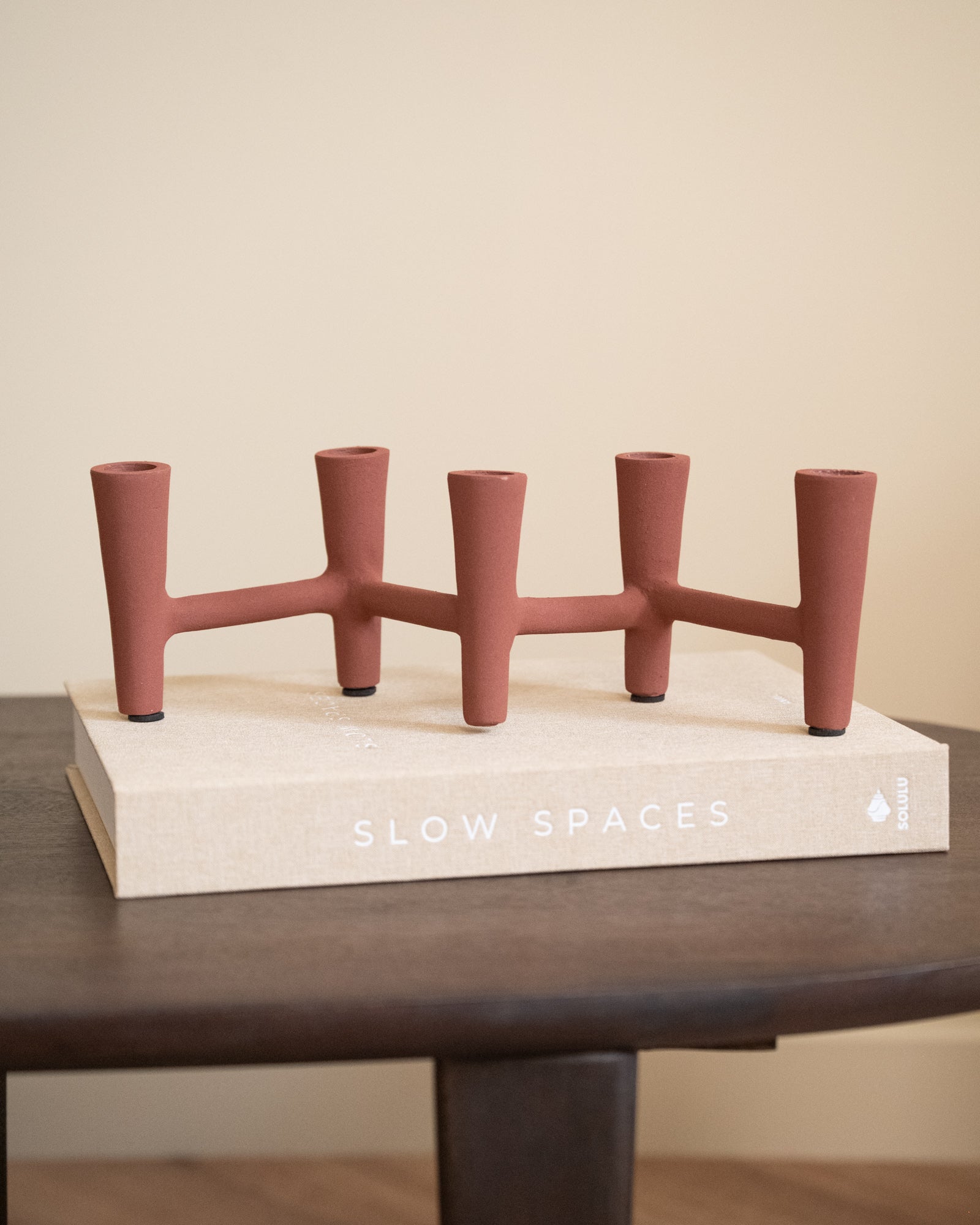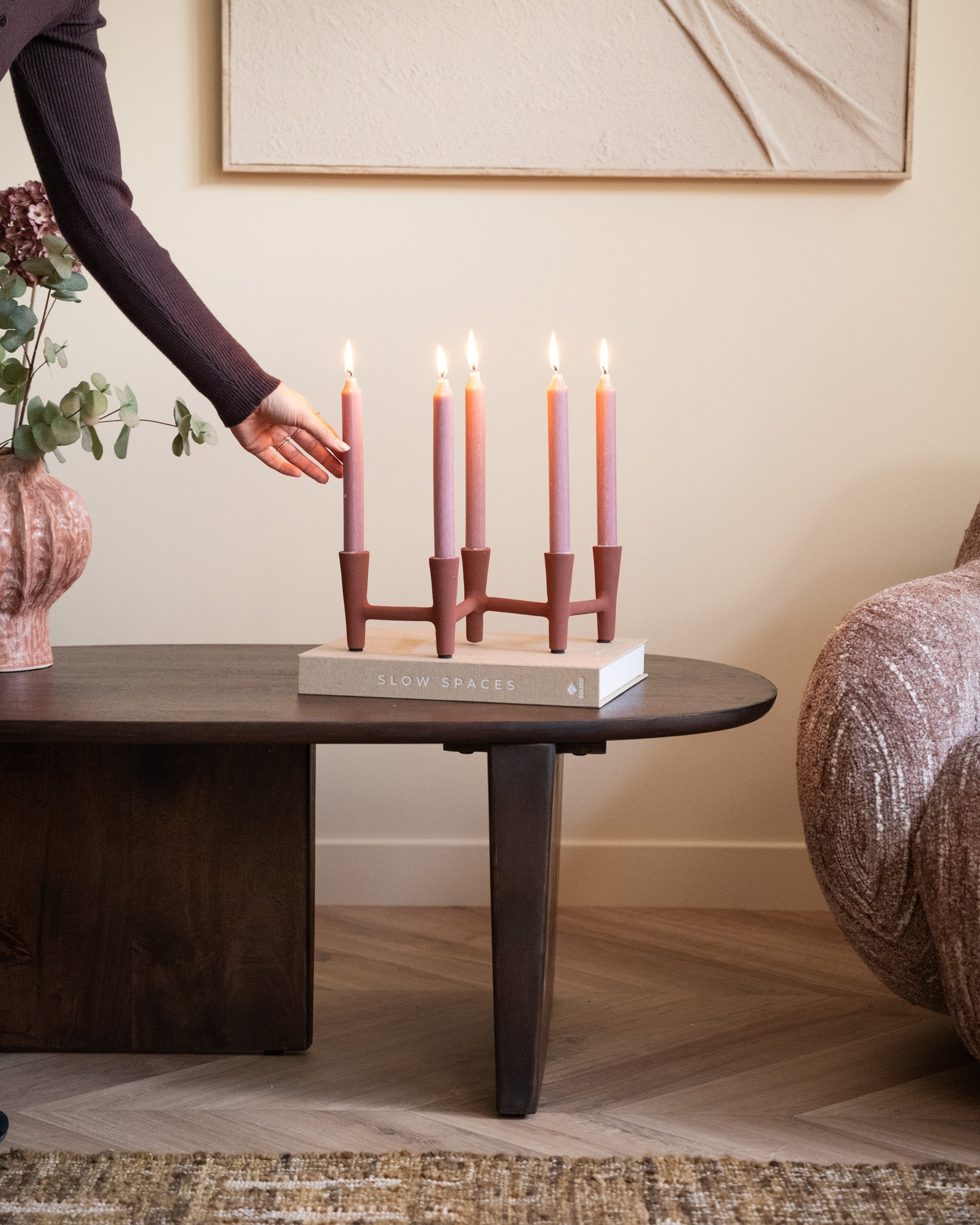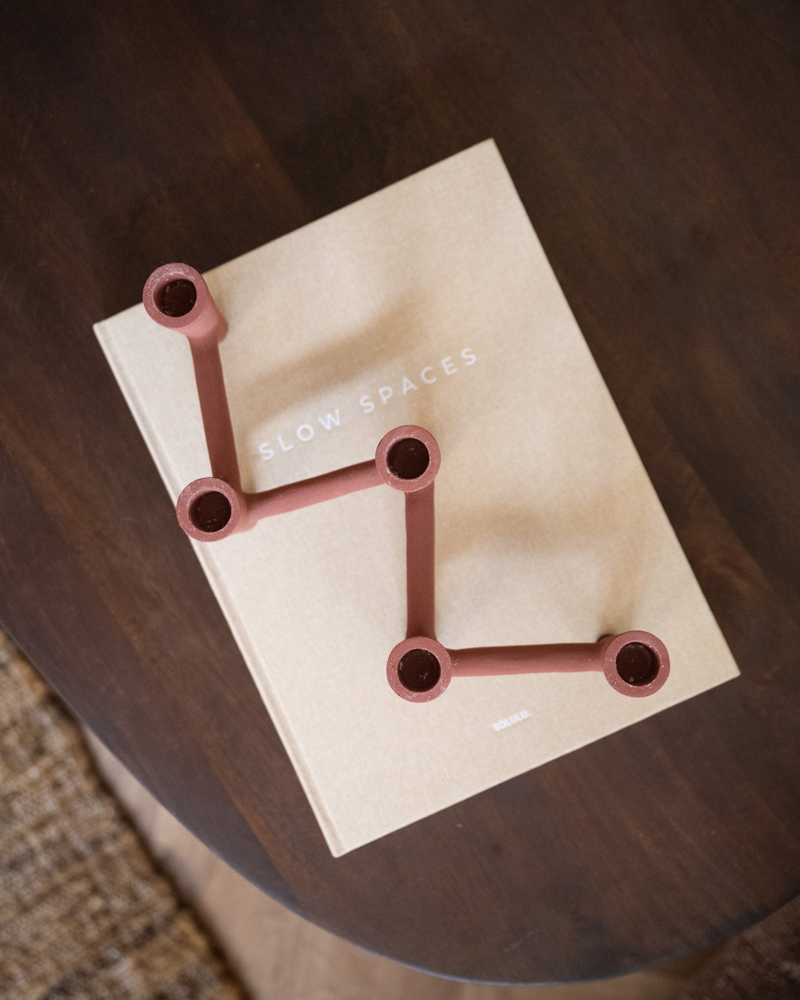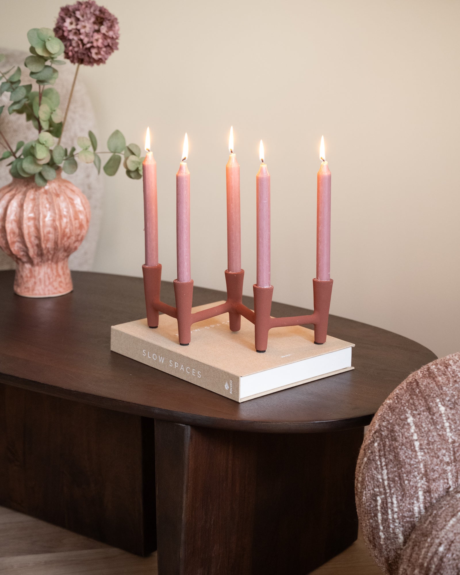 De Candle Holder Candelarum Terra is een echte statement piece dat warmte en design samenbrengt. De aardse terracotta tint en het sculpturale design geven je interieur een moderne, rustige uitstraling. Perfect voor lange kaarsen en cozy avonden, of als eyecatcher op je salontafel, dressoir of eettafel.