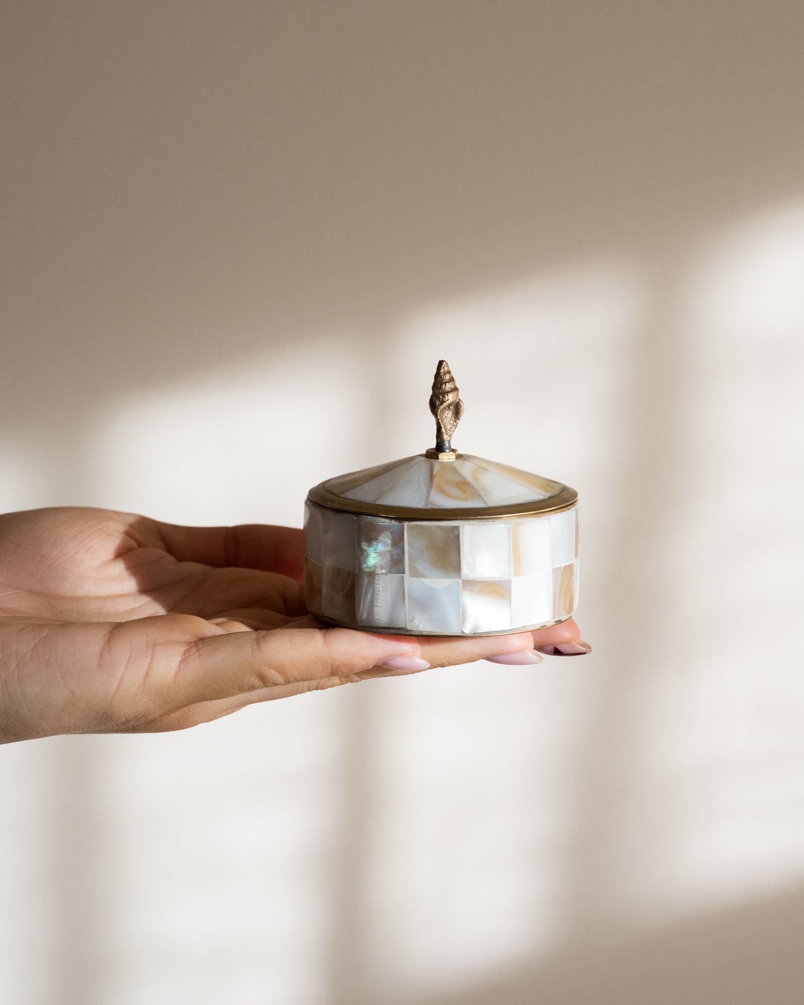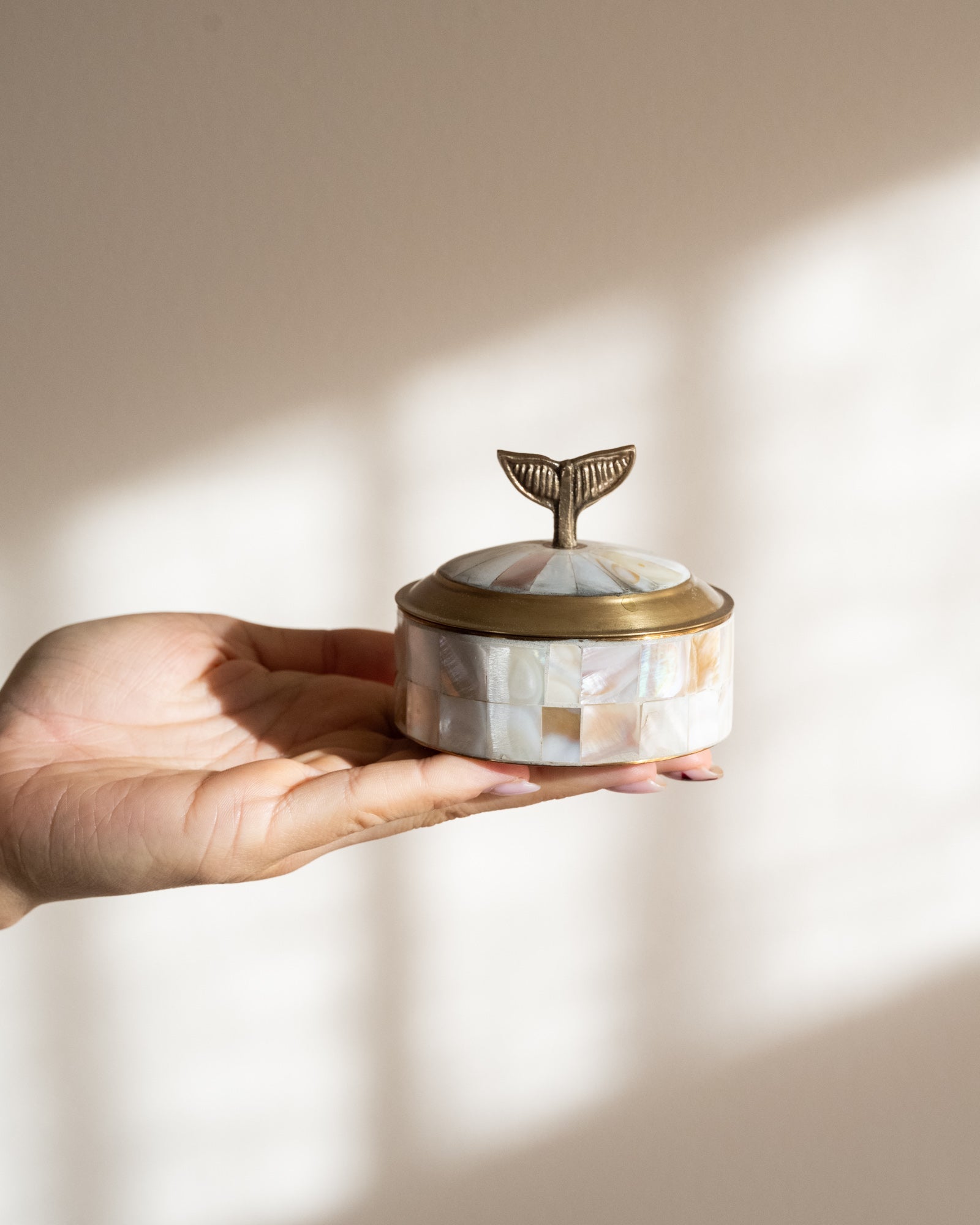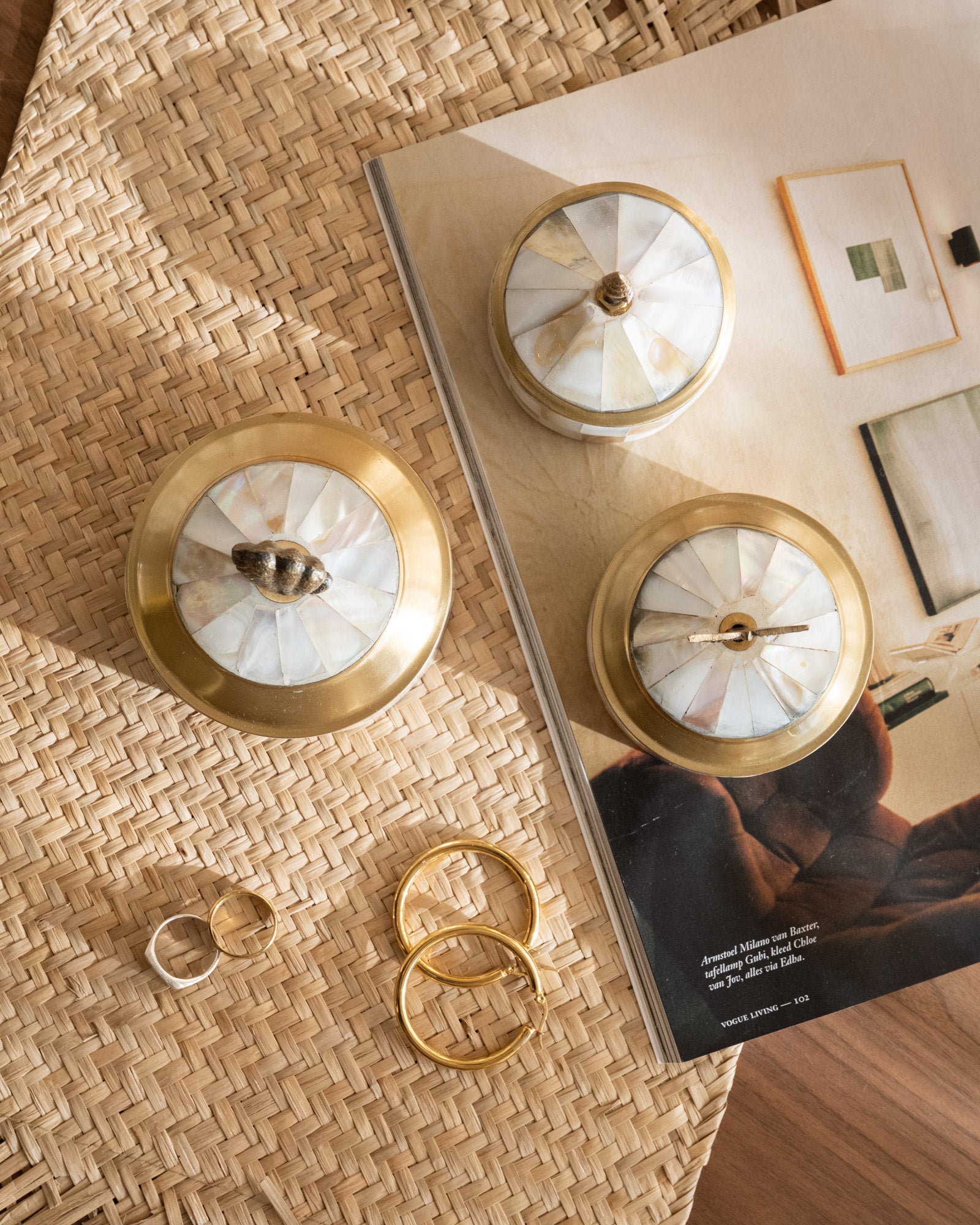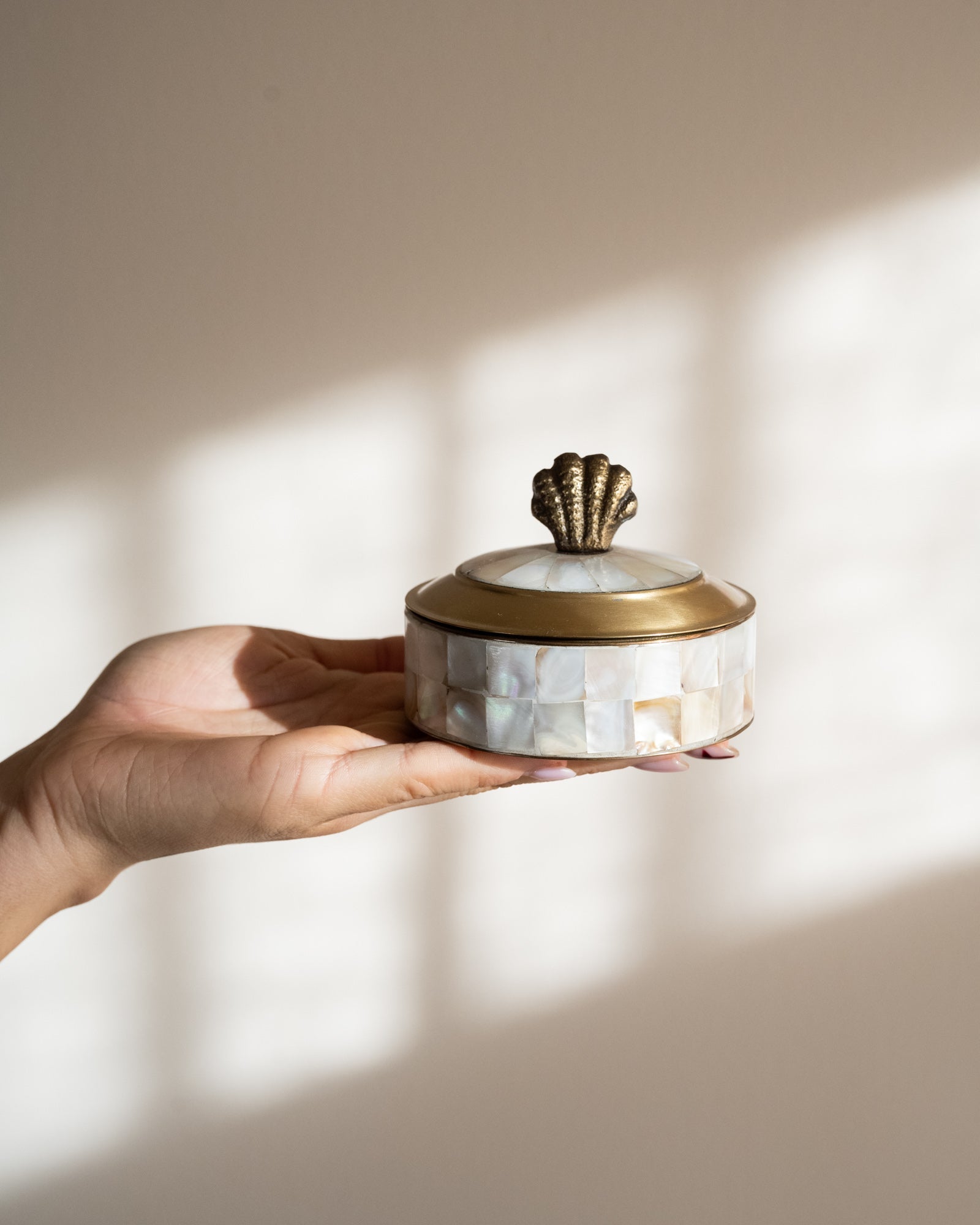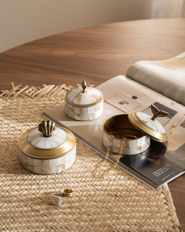 Deze set doosjes met zeethema, uitgevoerd in parelmoer en brass, brengt een verfijnde, natuurlijke sfeer in je interieur. Perfect om sieraden, kleine schatten of dagelijkse essentials stijlvol in op te bergen. Mooi samen op een dressoir, nachtkastje of in de badkamer, en ook geschikt als decoratief accent of als cadeau.