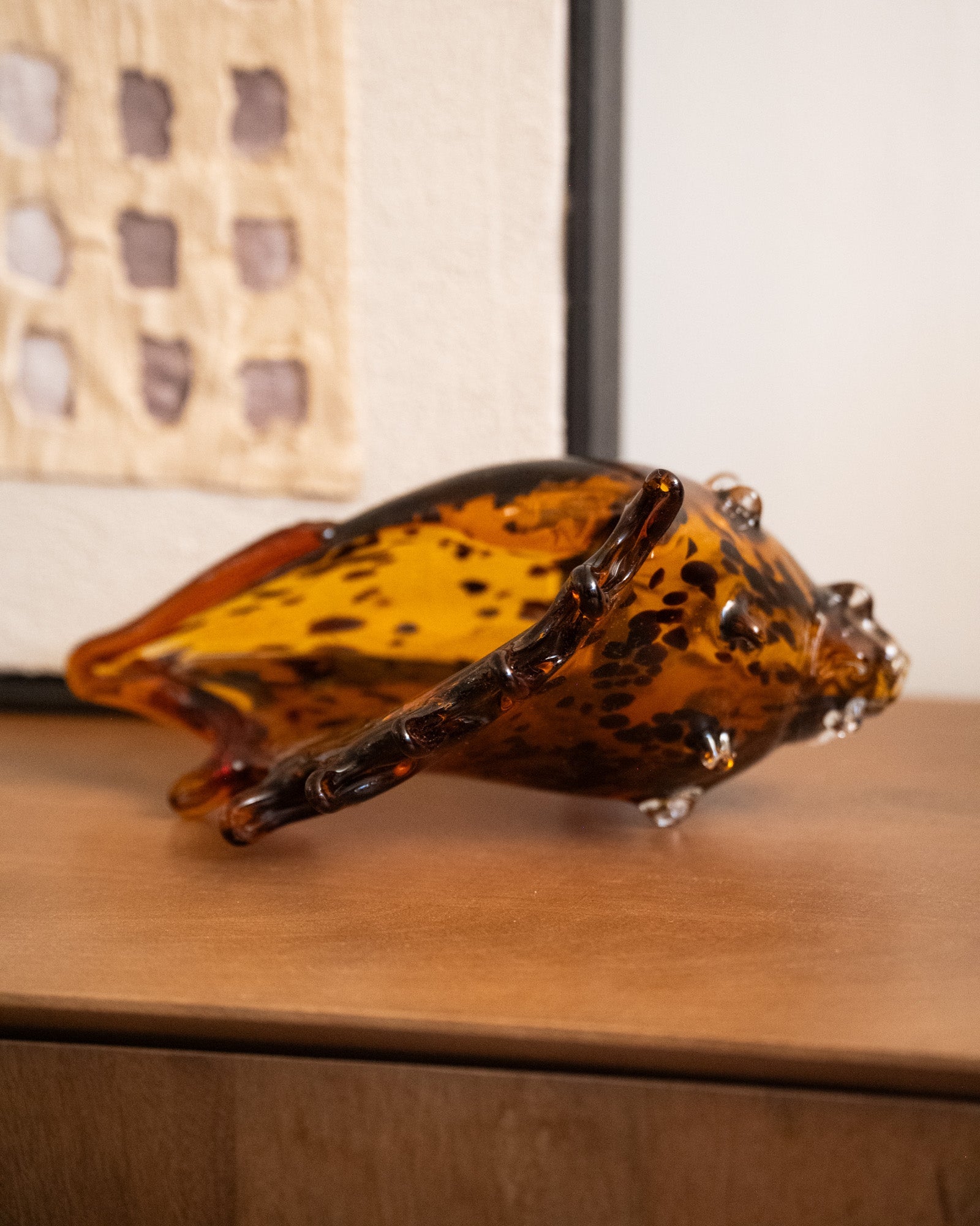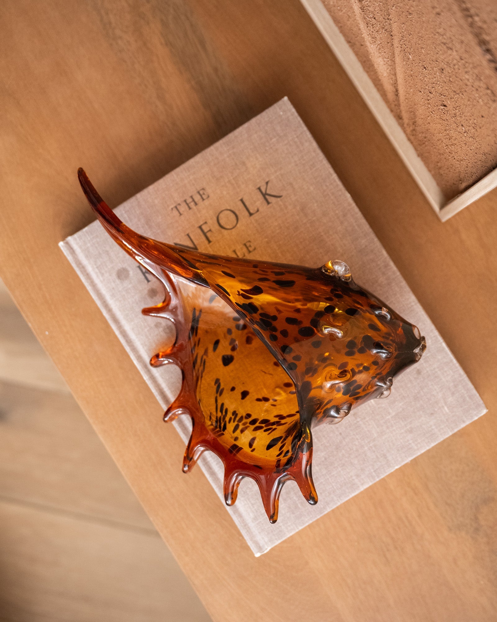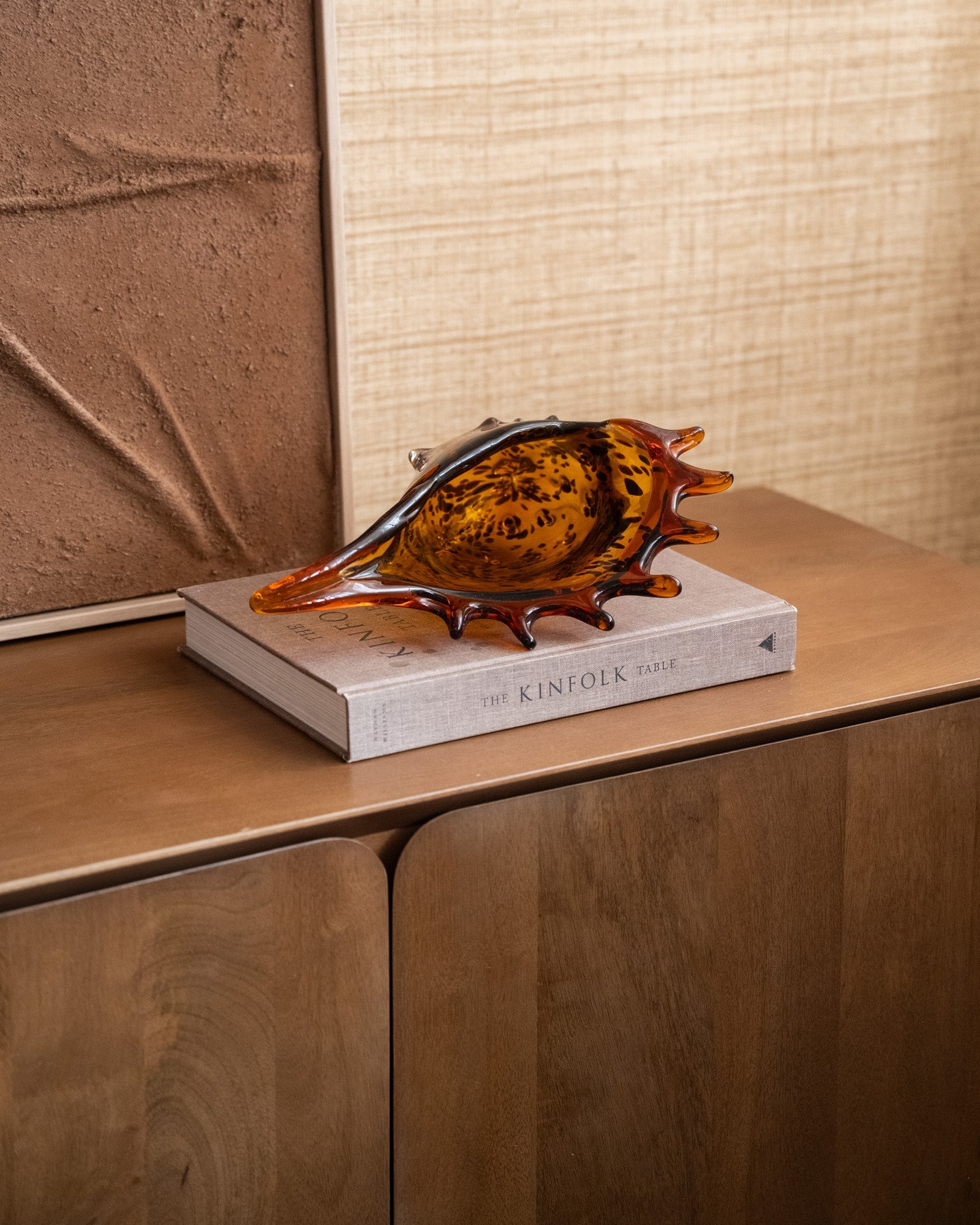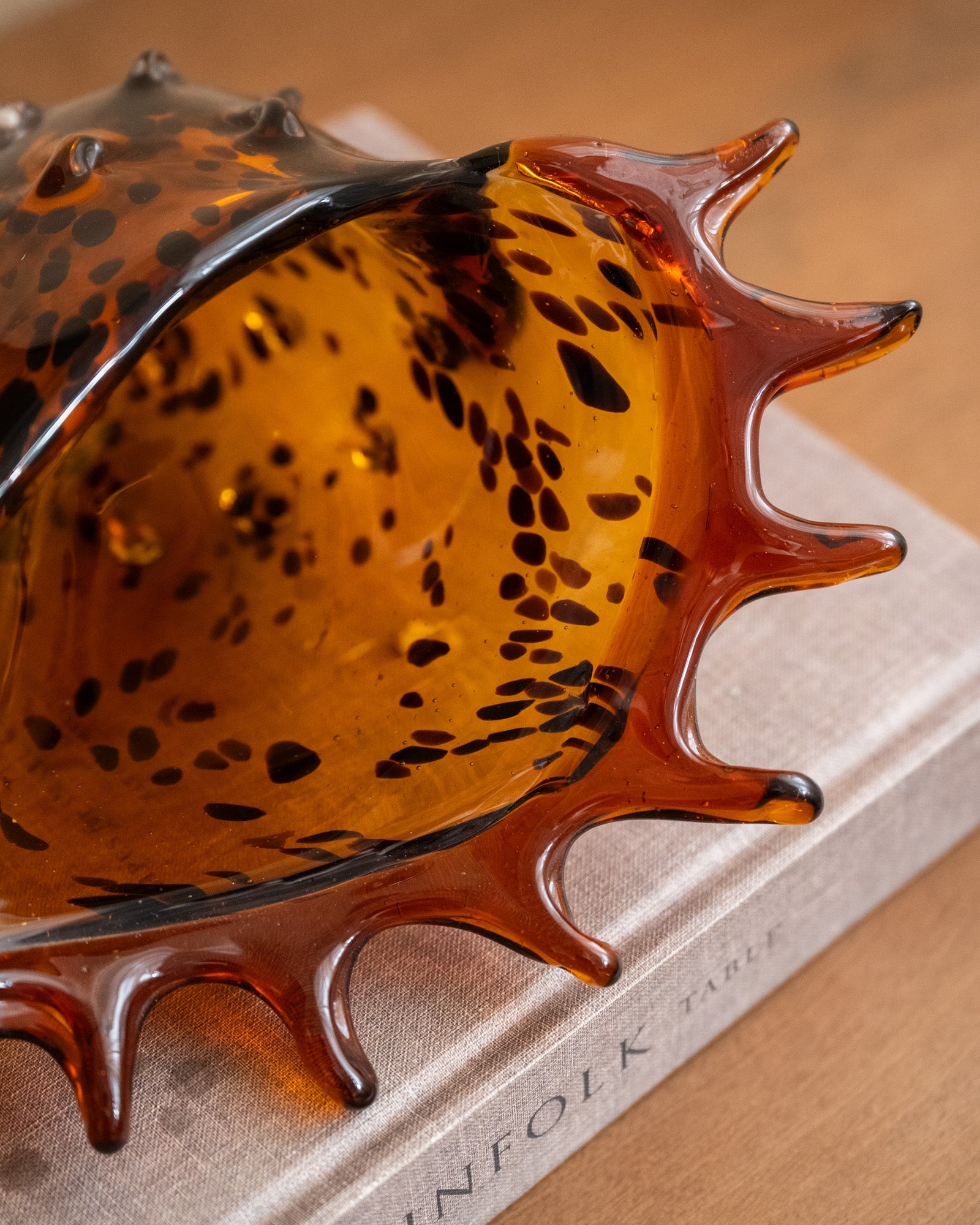 De Ornament Shell Feline Glass is een opvallend decorstuk in schelpvorm, gemaakt van amberkleurig glas met subtiele donkere spikkels. De organische lijnen en warme glans creëren een luxe lichteffect en brengen een vleugje vintage in elke ruimte. Perfect op een dressoir, salontafel of open kast als stijlvolle eyecatcher.