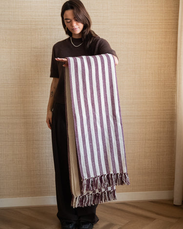 Deze gestreepte plaid in burgundy en beige is een stijlvolle toevoeging aan ieder interieur. De warme kleurcombinatie en het tijdloze streeppatroon zorgen voor een luxe en gezellige uitstraling. Ideaal als plaid voor op de bank, het bed of als decoratief woonaccessoire over een stoel of fauteuil
