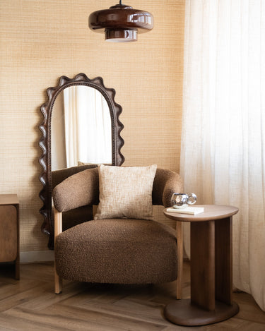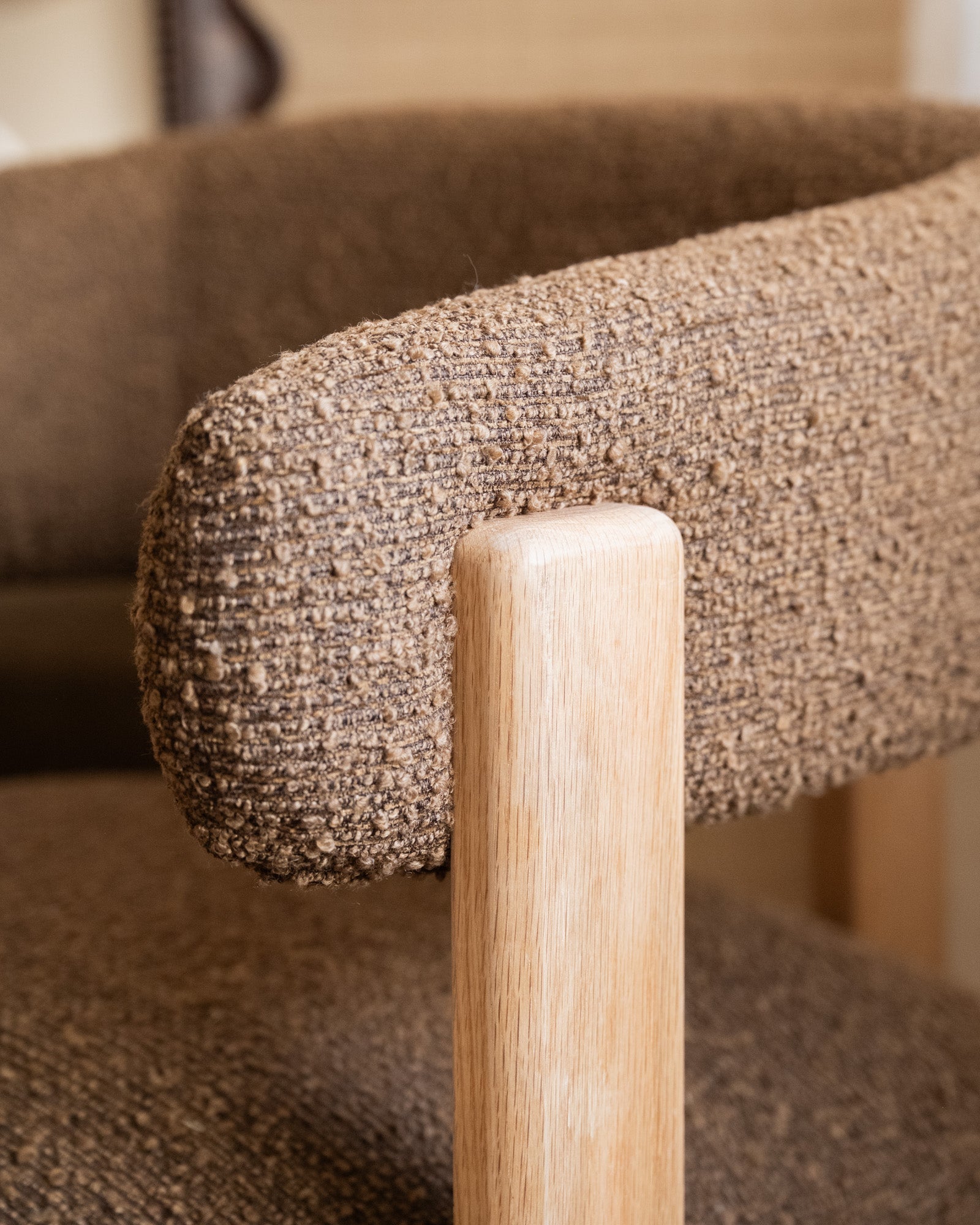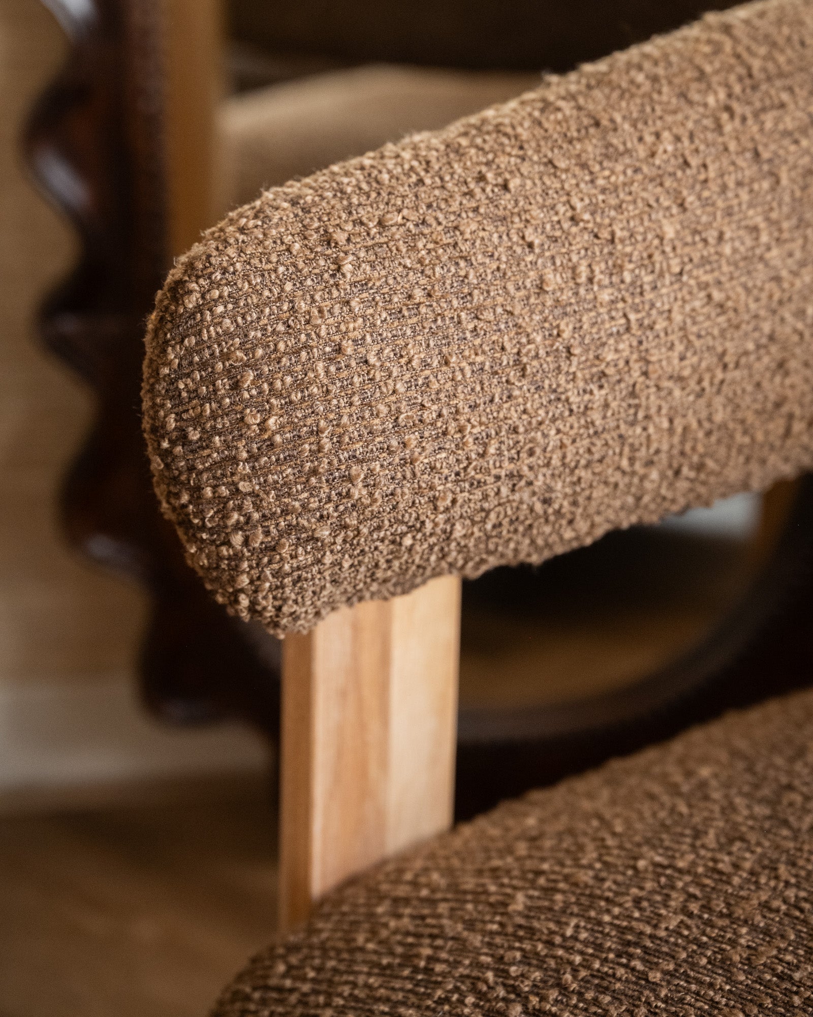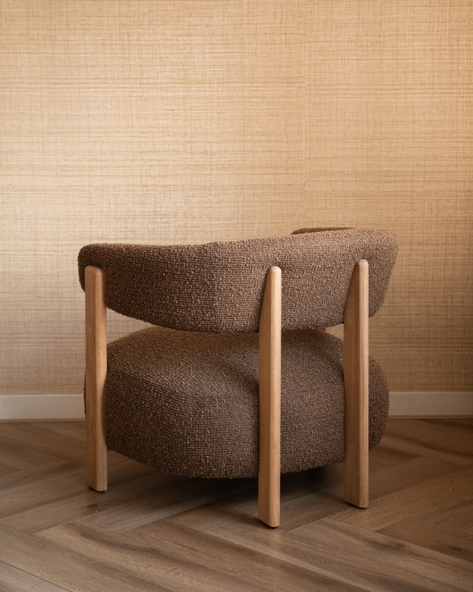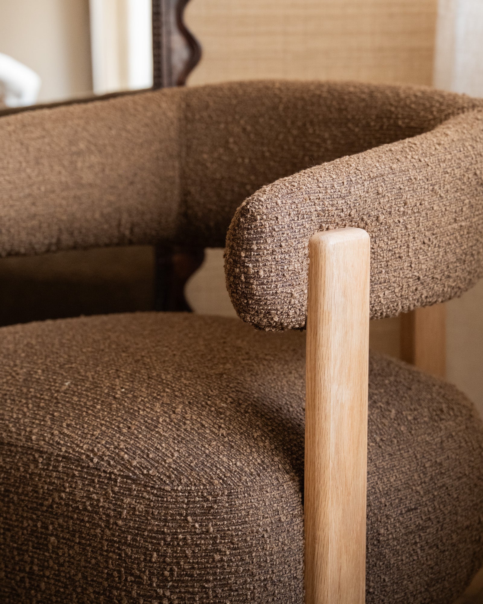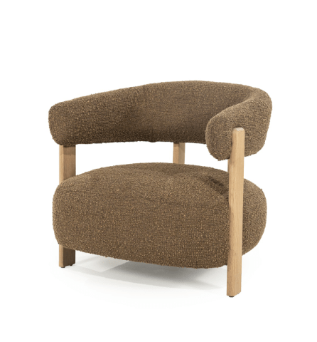 Armchair Lora Brown combineert een stijlvolle, organische vorm met warme materialen en ultiem zitcomfort. De zachte, rijk getextureerde stof en het eikenhouten onderstel geven deze fauteuil een luxe, natuurlijke uitstraling. Perfect als statement chair in de woonkamer, slaapkamer of leeshoek.