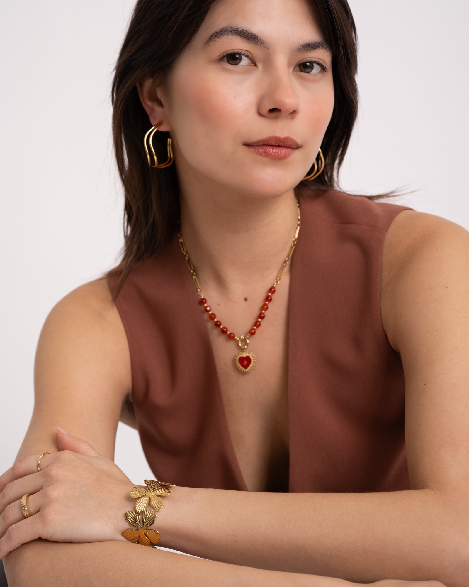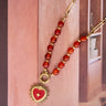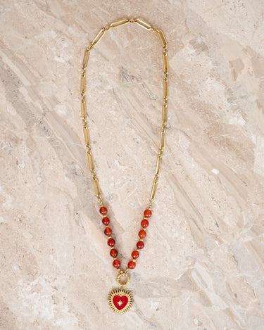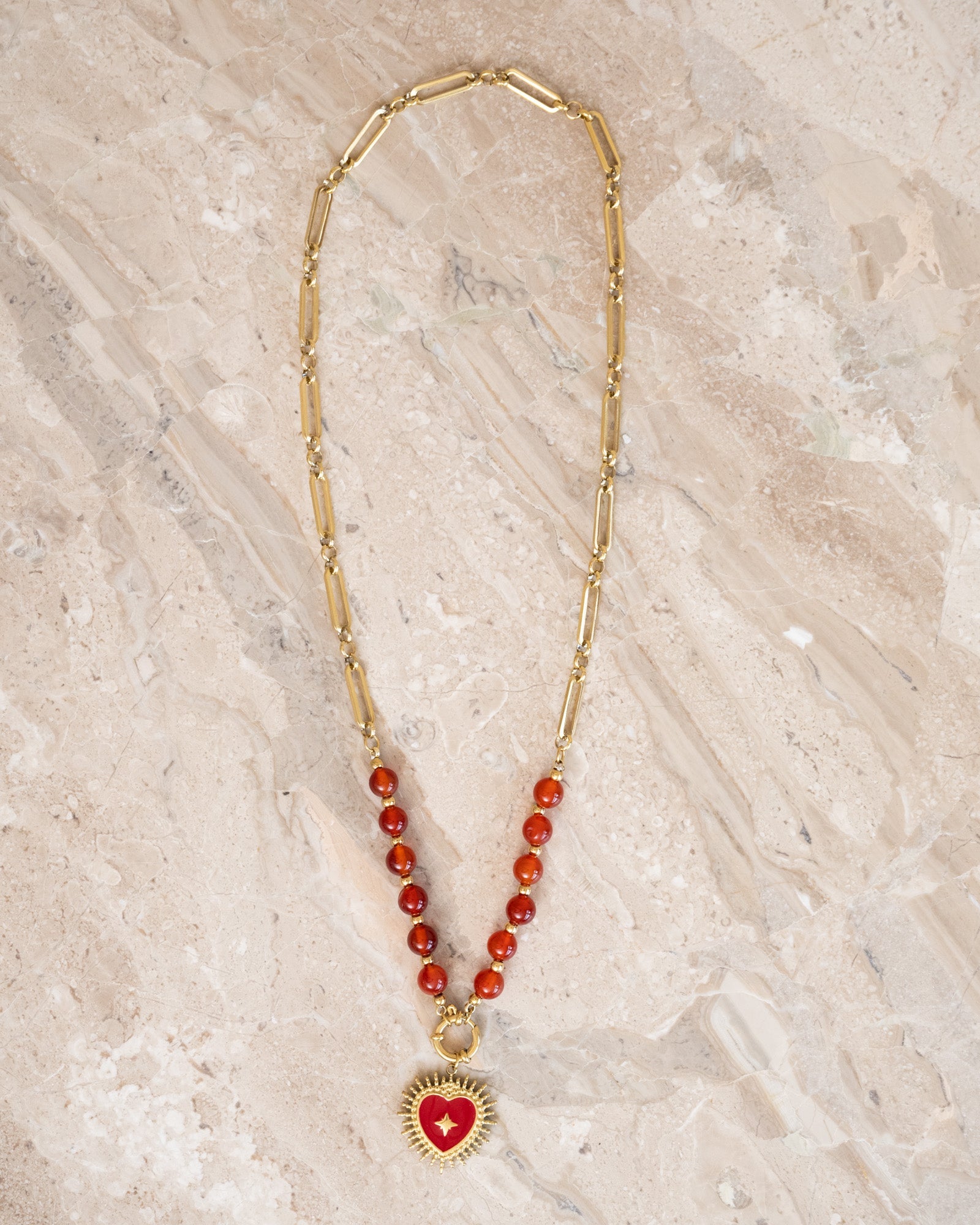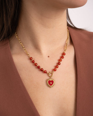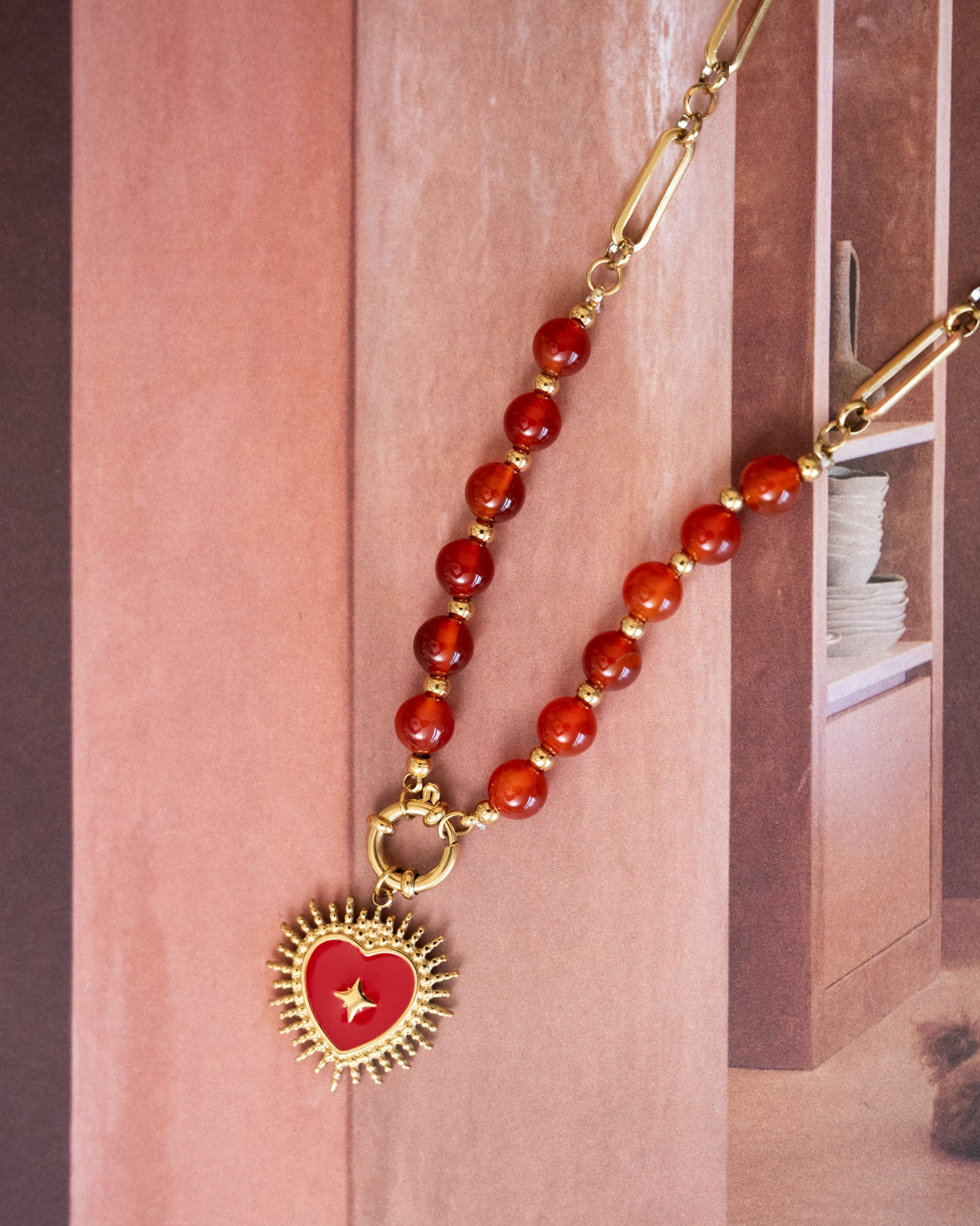 Stainless steel schakelketting met stenen kralen en hanger in vorm van hartje met emaille.