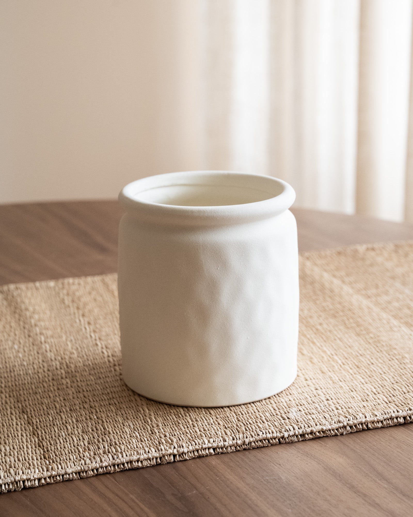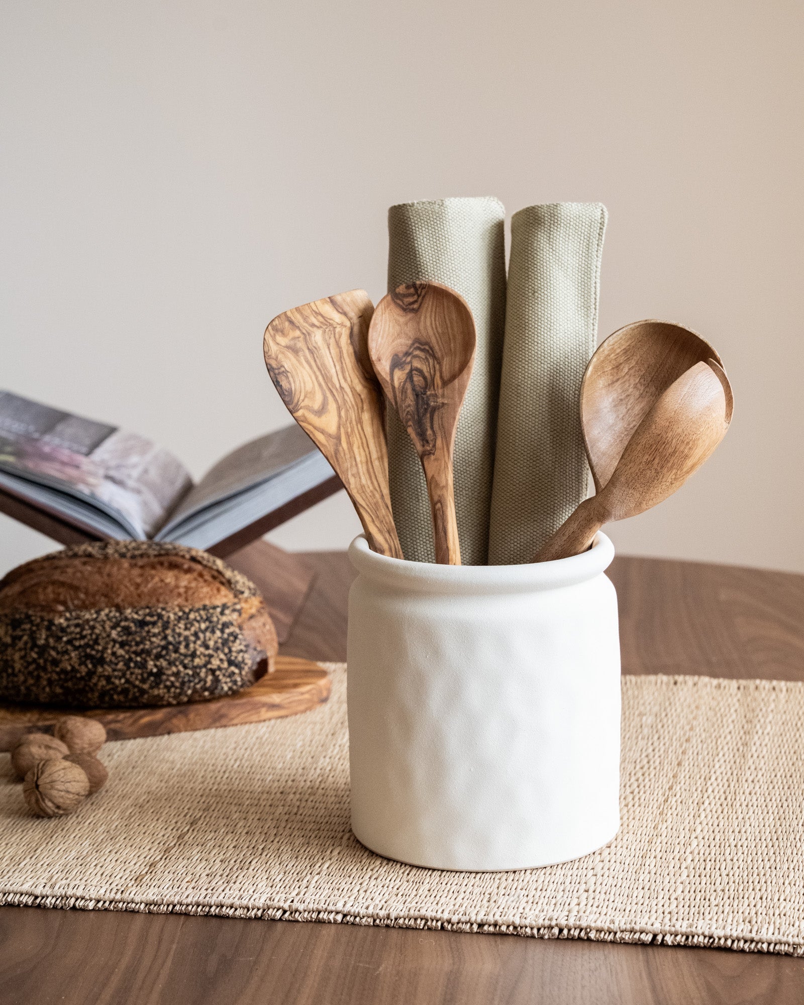 Breng rust en warmte in je keuken met de Cutlery Jar Koen Off White. Deze stijlvolle keramieken pot heeft een subtiel organische vorm en een zachte, matte afwerking in een warme tint. Perfect voor het stijlvol opbergen van je kookgerei, zoals lepels, placemats en bestek, op je aanrecht of tafel.