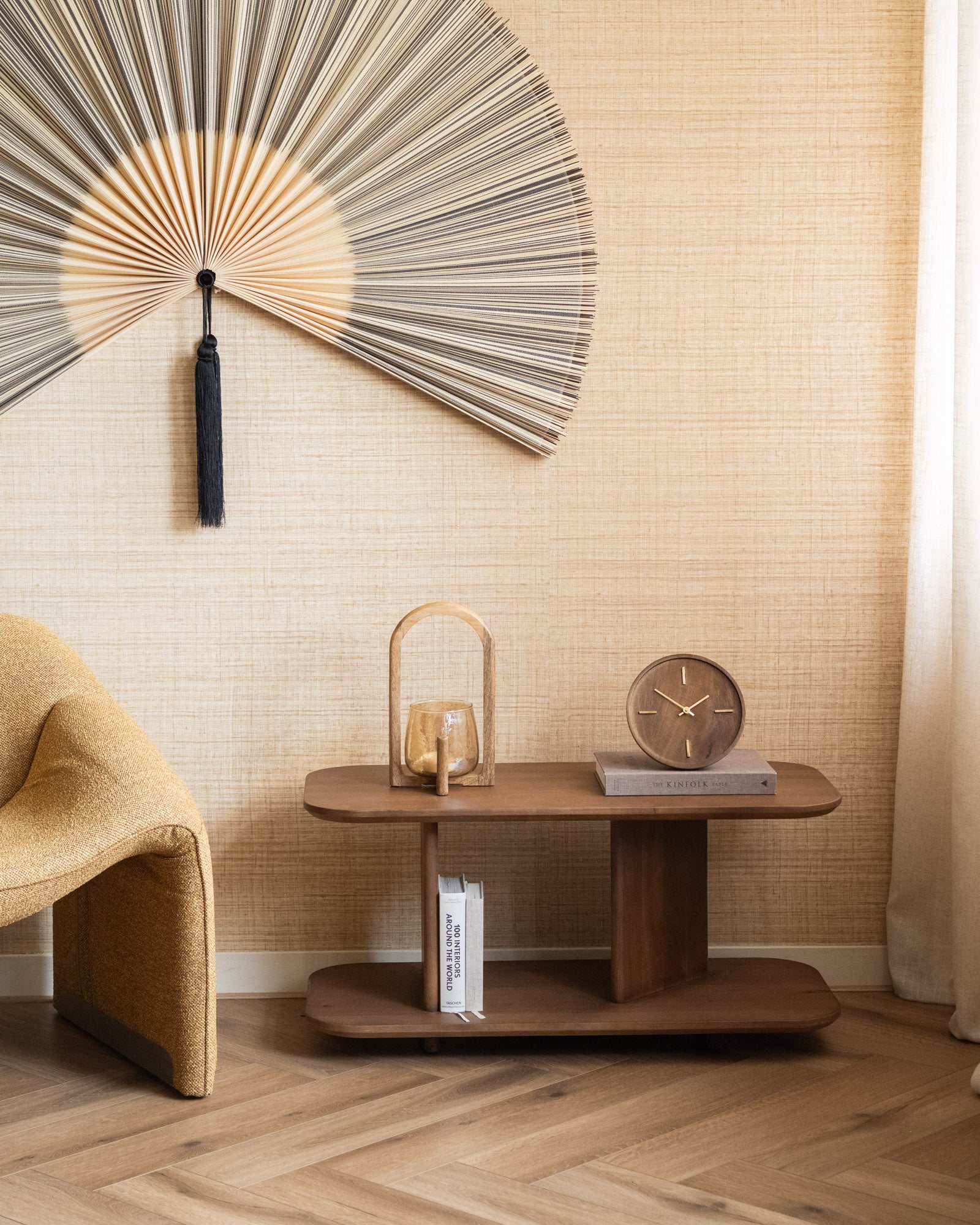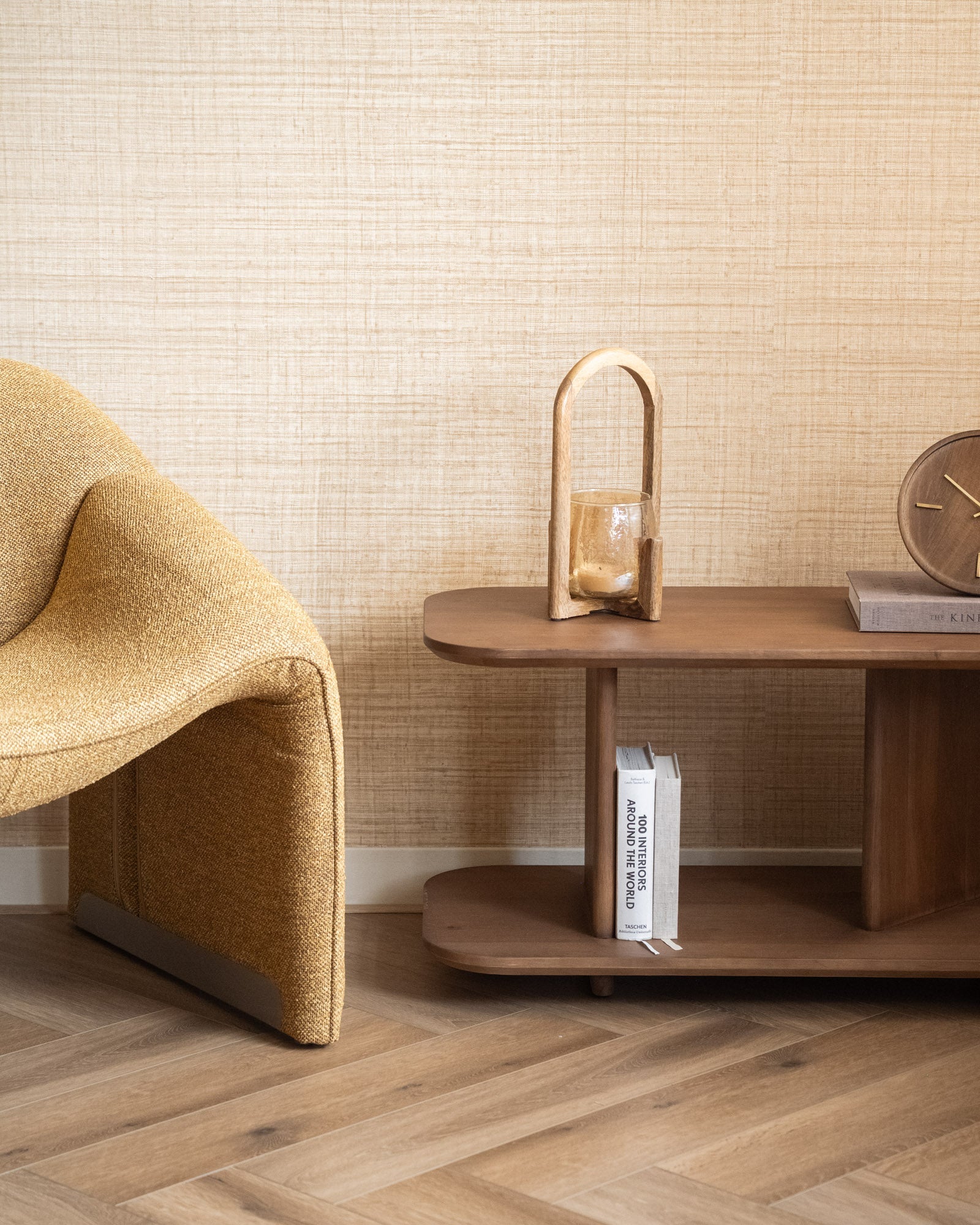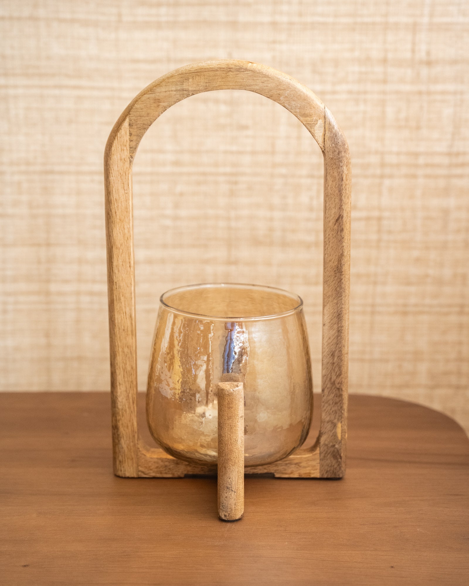 Deze sfeervolle theelichthouder combineert warm amberkleurig glas met een elegant gebogen houten frame. Het licht wordt subtiel verspreid door het glas en zorgt voor een gezellige gloed in elke hoek van je interieur. Perfect voor een ontspannen avond of als stijlvolle toevoeging op je dressoir, kast of tafeltje.