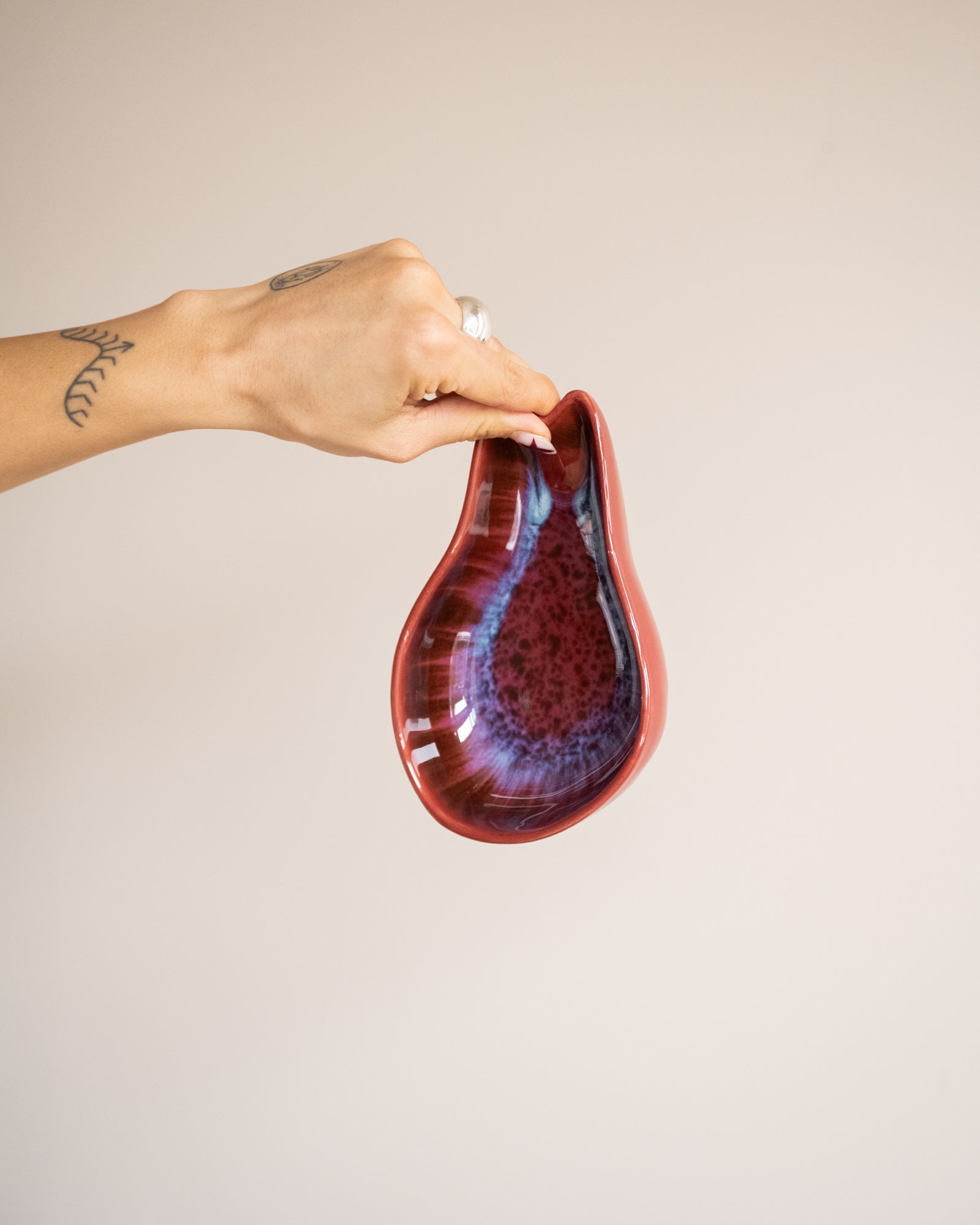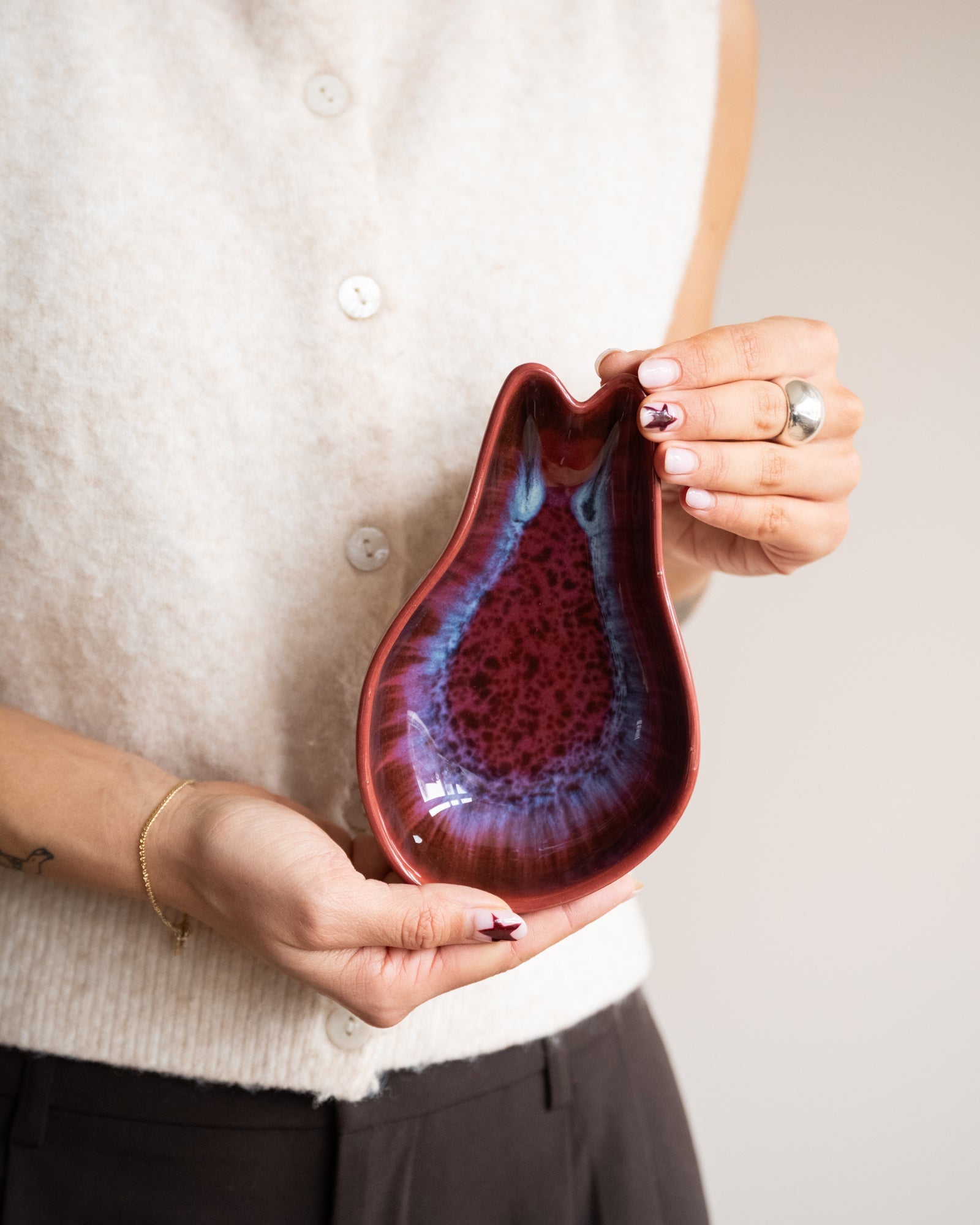 De HKLIVING Small Bowl Shell Dragon Fruit is een keramische schaal met een organische schelpvorm en een opvallend rood-paars glazuur met subtiele blauwe nuances, geïnspireerd op de kleuren van drakenfruit. Perfect voor kleine snacks zoals olijven of druiven, maar ook prachtig als decoratief schaaltje. Een echte eyecatcher die kleur en karakter toevoegt aan je tafel.