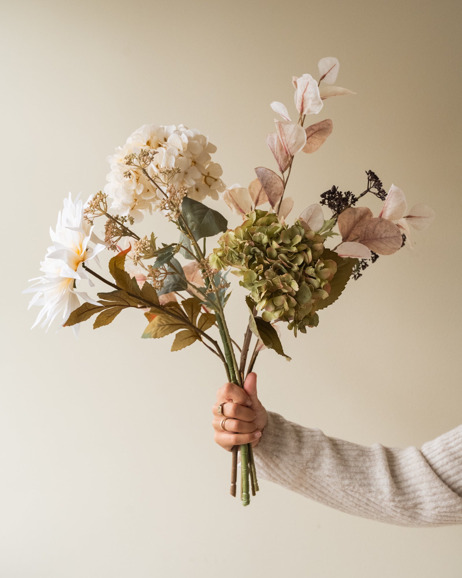Breng kleur en warmte in huis met dit kunstboeket met hortensia, dahlia en eucalyptus. Het boeket blijft altijd mooi en is ideaal als eyecatcher in een vaas op tafel of dressoir. Perfect om sfeer te creëren zonder onderhoud.