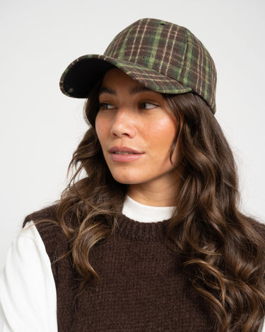 Een zachte, geblokte baseballpet met een warm ruitpatroon in bruin, groene tinten.