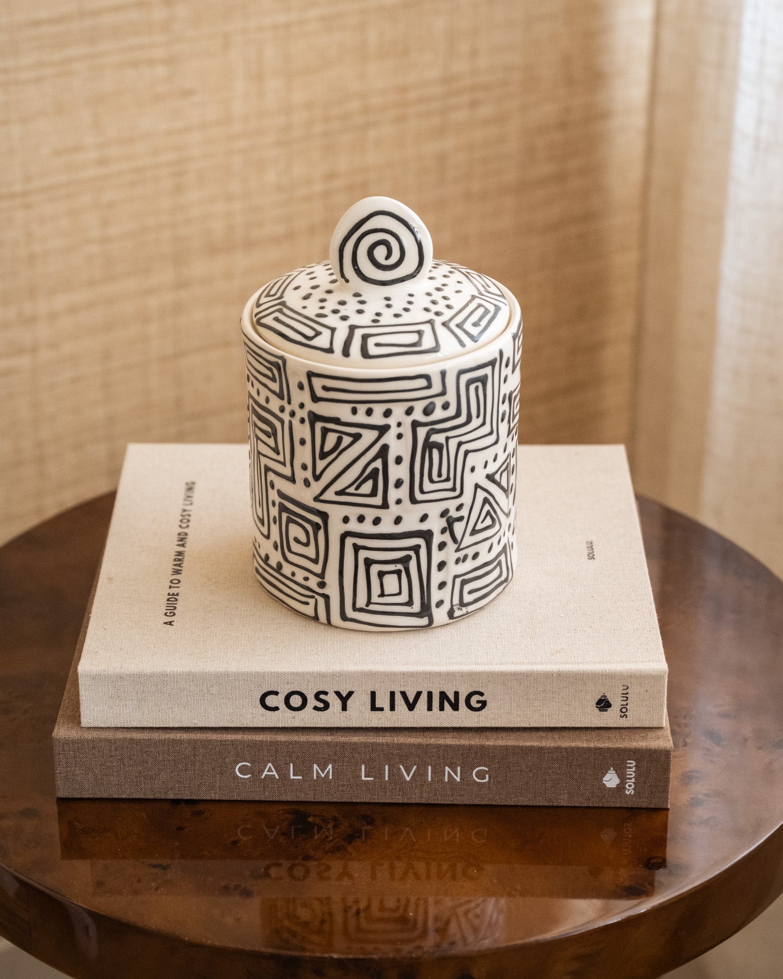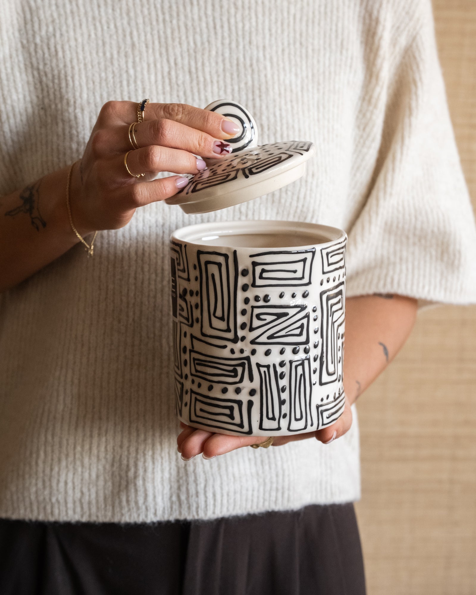 Storage Jar Pattern Ceramic is een keramieken opbergpot met een grafisch zwart-wit patroon. Perfect voor het opbergen van kleine items en een stijlvolle eyecatcher op tafel, plank of dressoir.