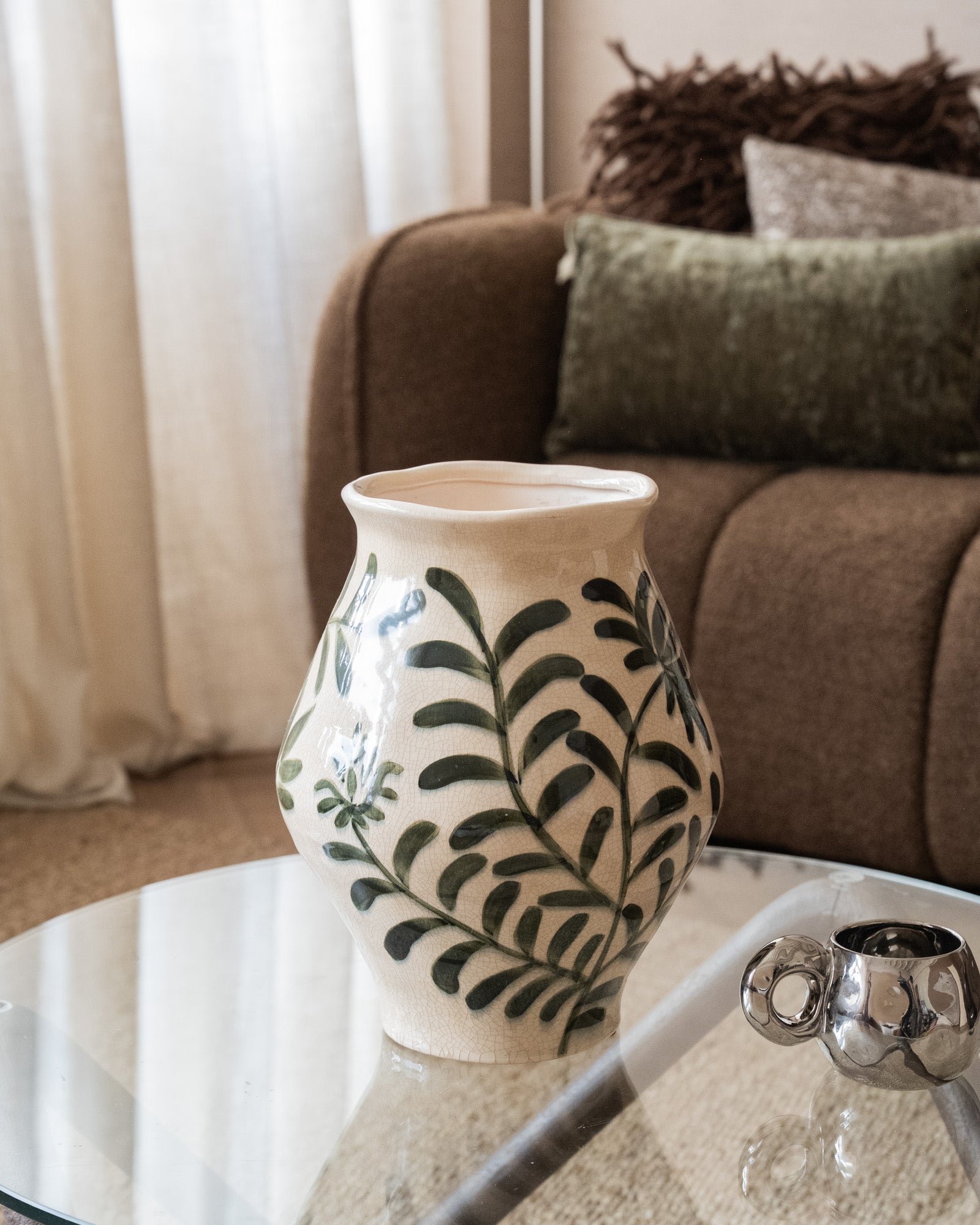 Breng een frisse en natuurlijke touch in je interieur met de handgeschilderde Large Deco Vase Leaf Green. Het groene bladmotief en de organische vorm geven de vaas een speelse en stijlvolle uitstraling. Mooi als eyecatcher op een salontafel, dressoir of eettafel, zowel met als zonder bloemen.