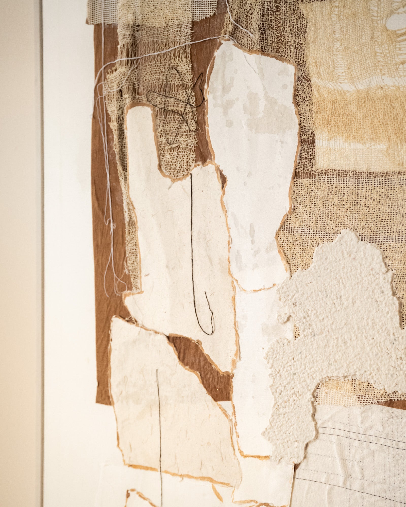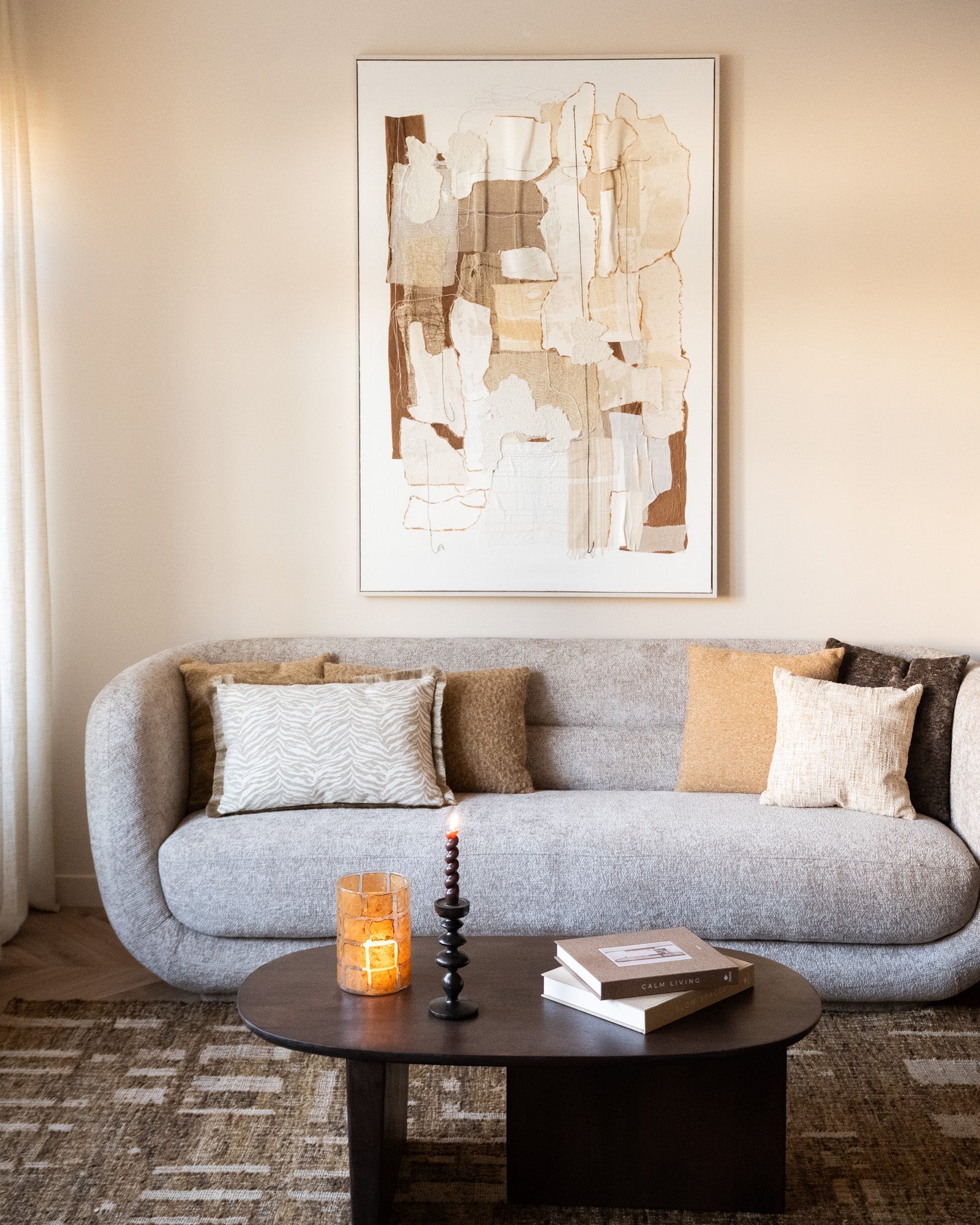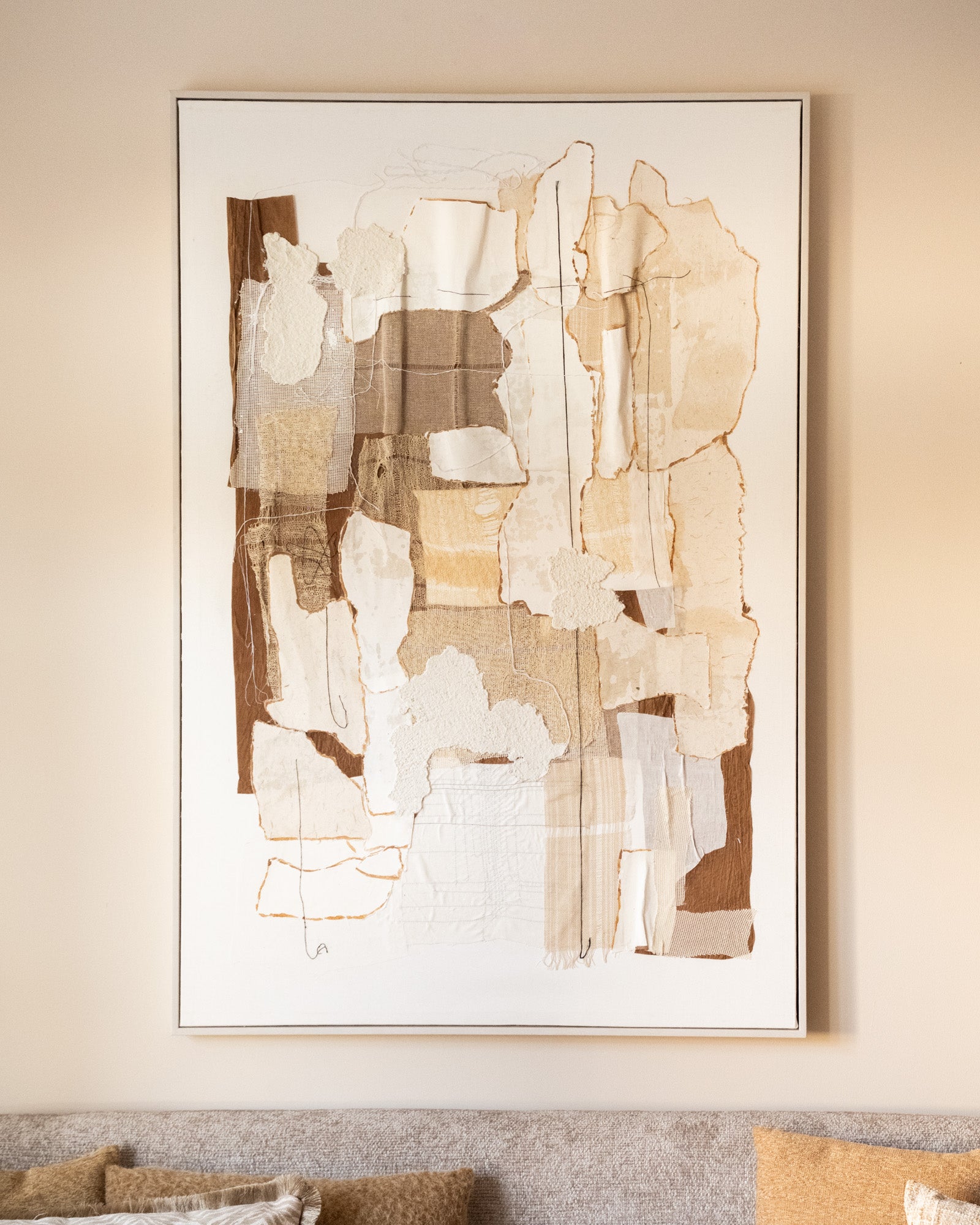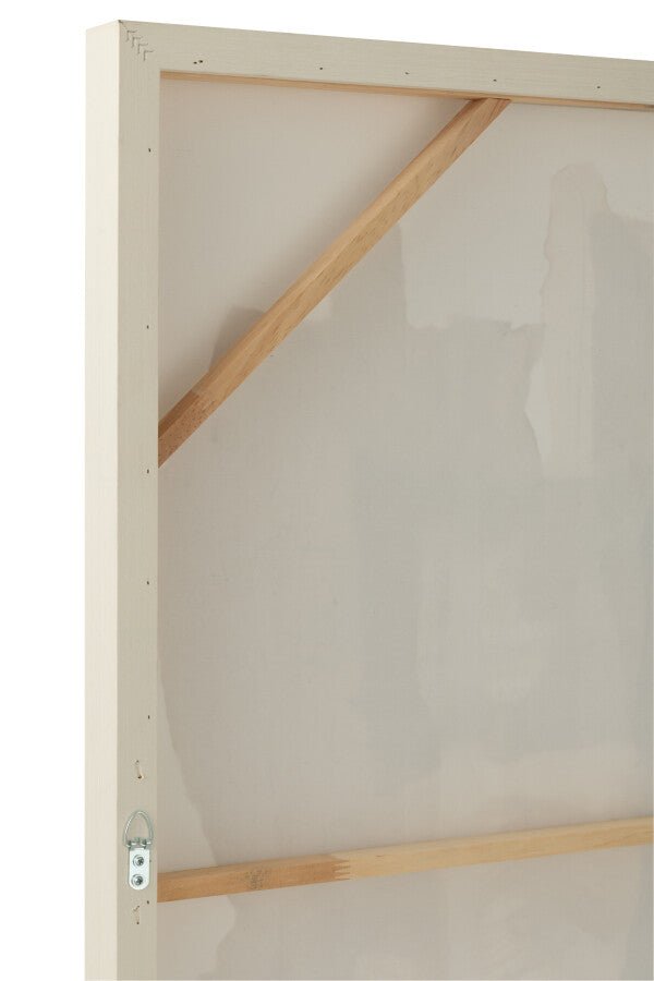 Deze grote wall art combineert verschillende structuren, stoffen en neutrale tinten tot één modern kunstwerk. Door de zachte aardetinten past hij moeiteloos in elk stijlvol en rustig interieur. Gemaakt op een dennenhouten frame en helemaal ready om jouw muur extra sfeer te geven!