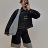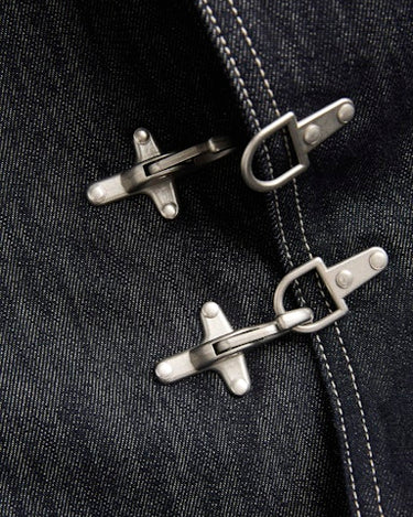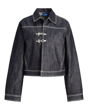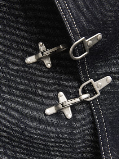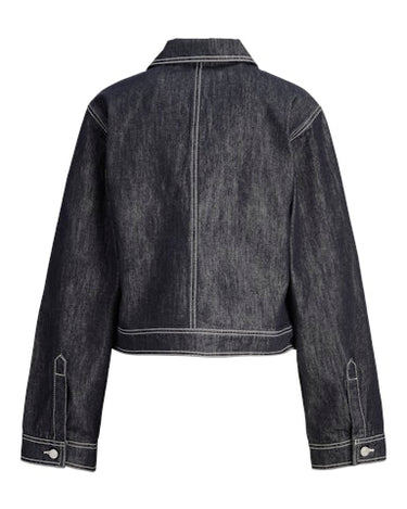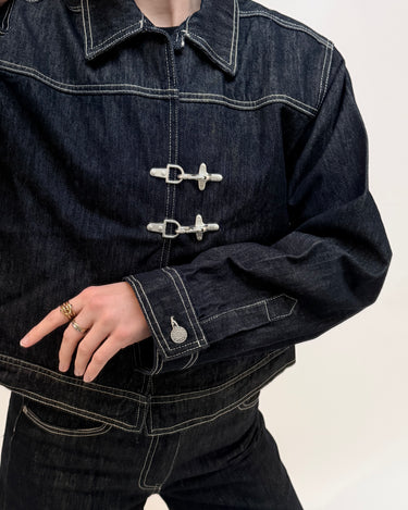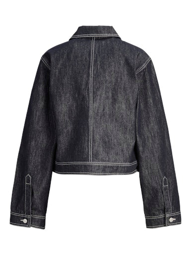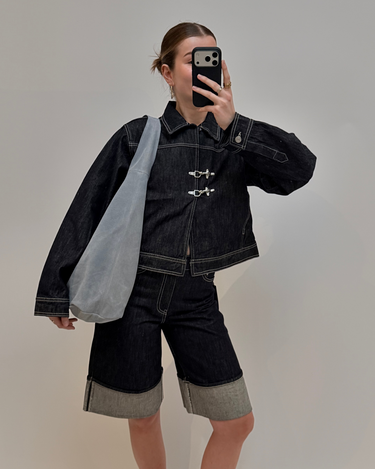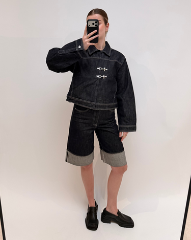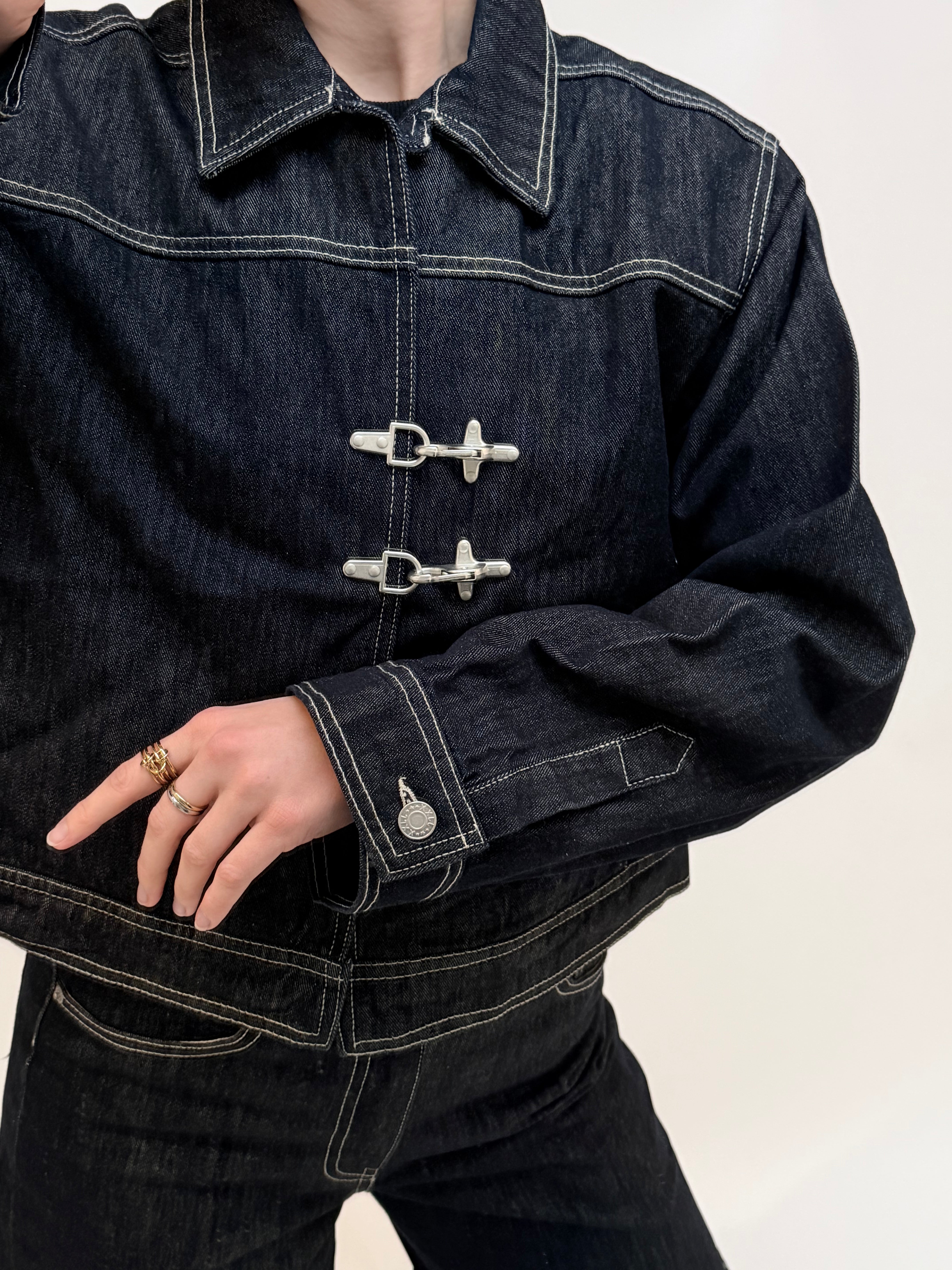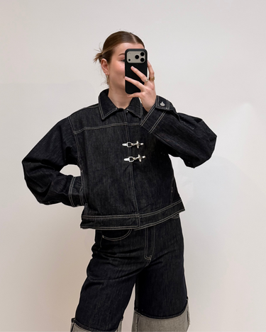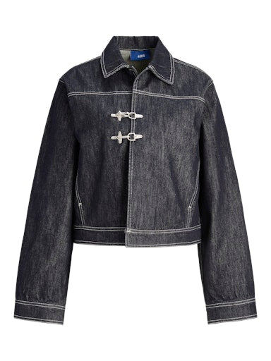 Dit boxy fit denim jasje is een echte must-have en onderdeel van een stijlvolle set, maar ook perfect los te dragen. De unieke metalen trenssluiting geeft het jasje een stoere en onderscheidende look. Voorzien van praktische steekzakken en een comfortabele pasvorm, ideaal voor een casual maar trendy outfit.