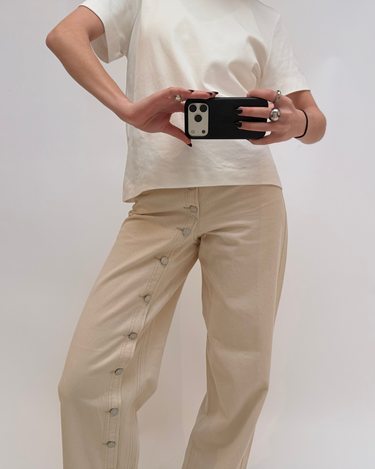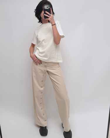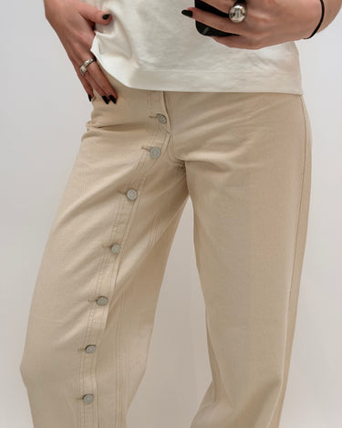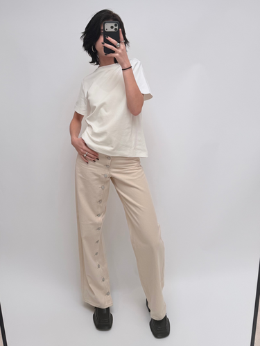 Deze stijlvolle broek is voorzien van een opvallende knoopsluiting die doorloopt tot aan de pijp. De broek heeft een comfortabele straight leg / wide leg fit, waardoor hij zowel casual als chic gedragen kan worden.