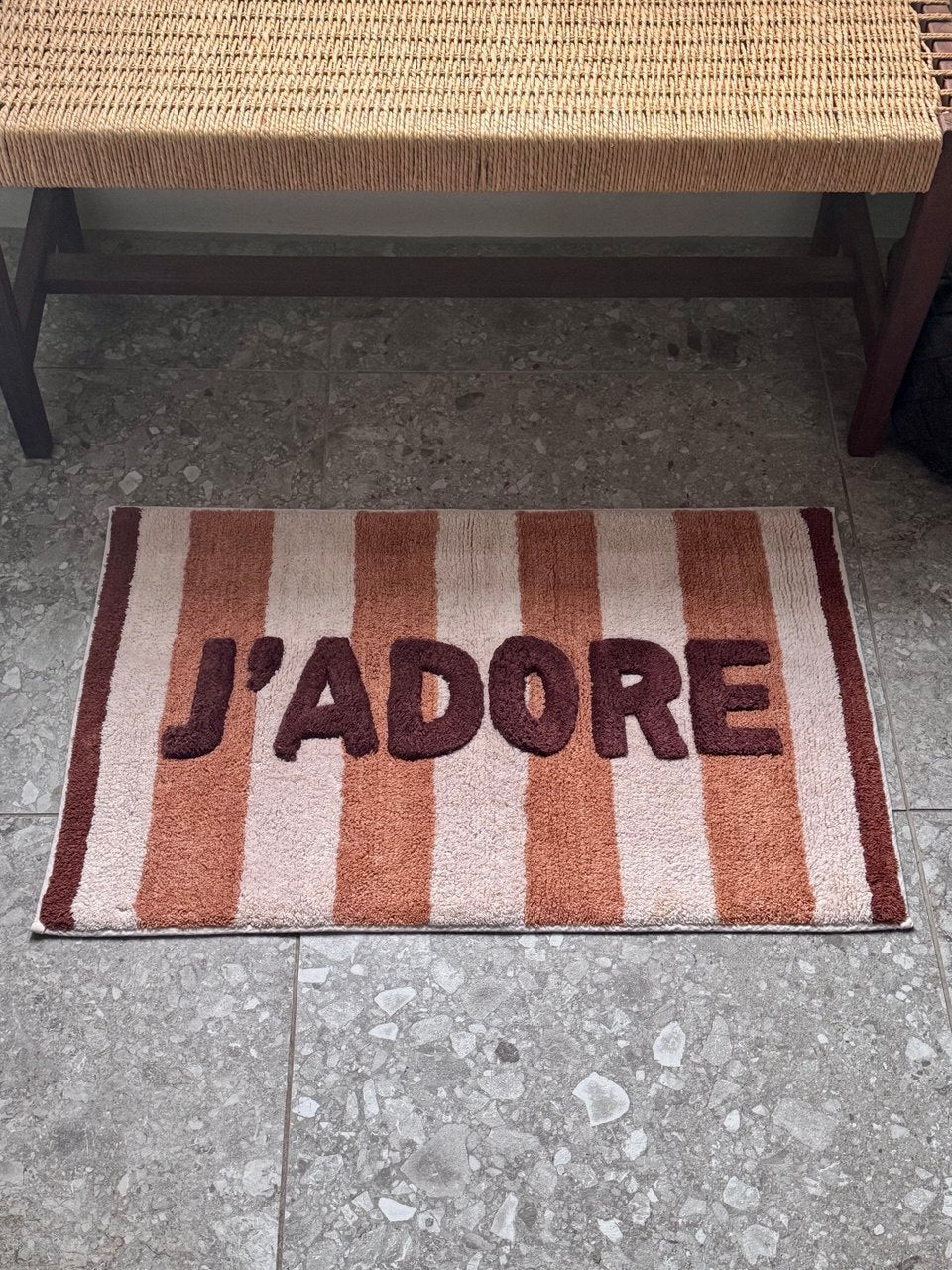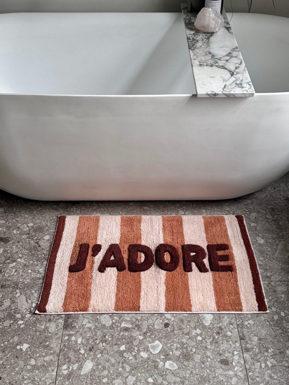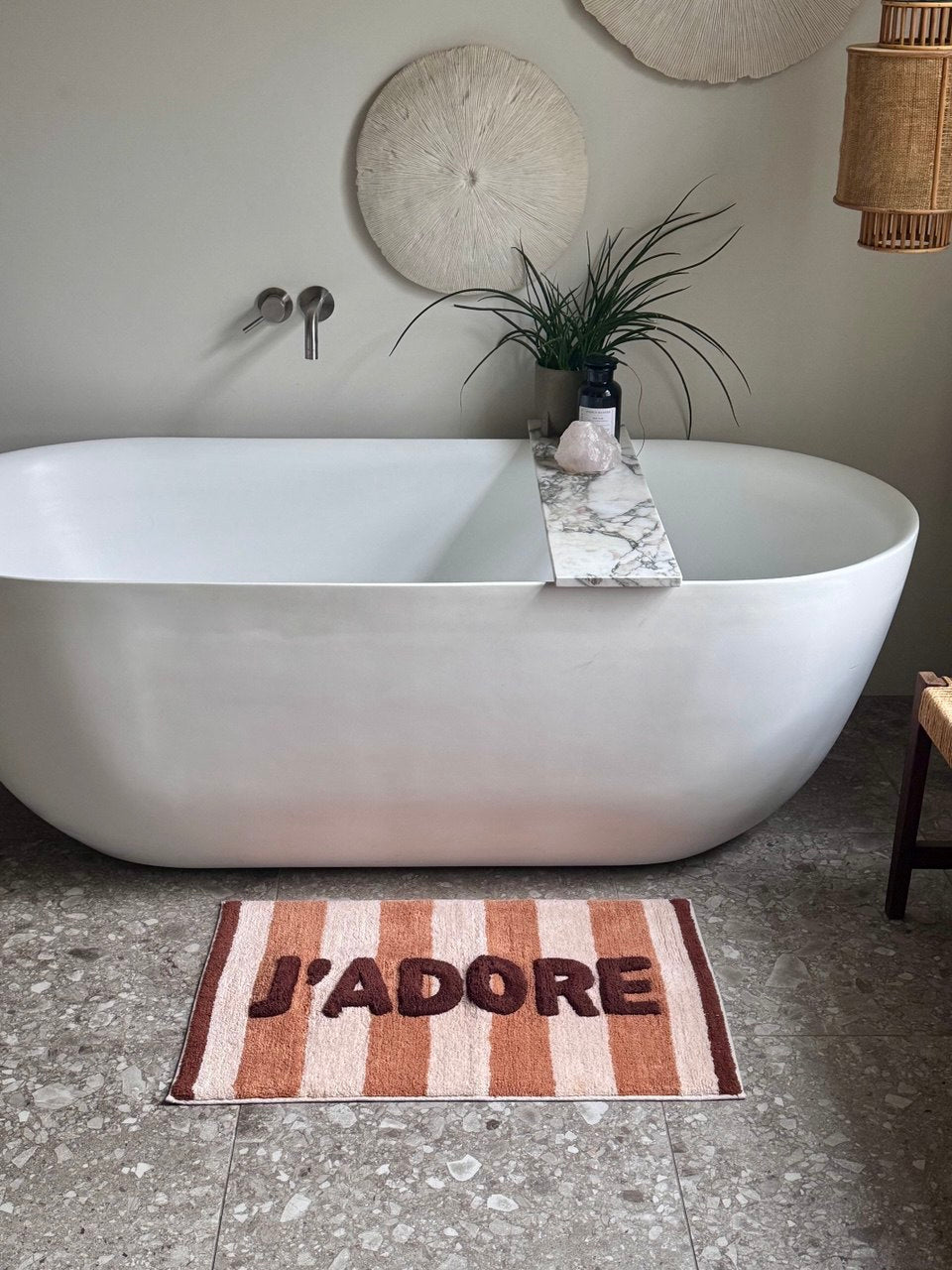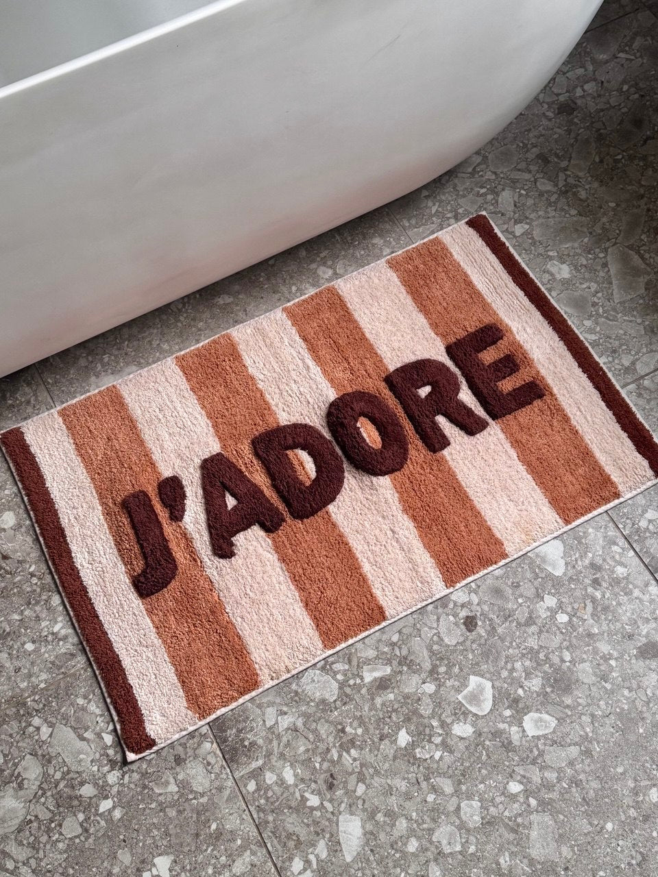 Bath Mat J’adore Stripes geeft je badkamer direct een warme, speelse upgrade. De zachte badmat met grafische strepen en ‘J’adore’ detail voelt heerlijk aan onder je voeten en brengt instant sfeer. Perfect om te combineren met neutrale tinten of als statement in je badkamer.