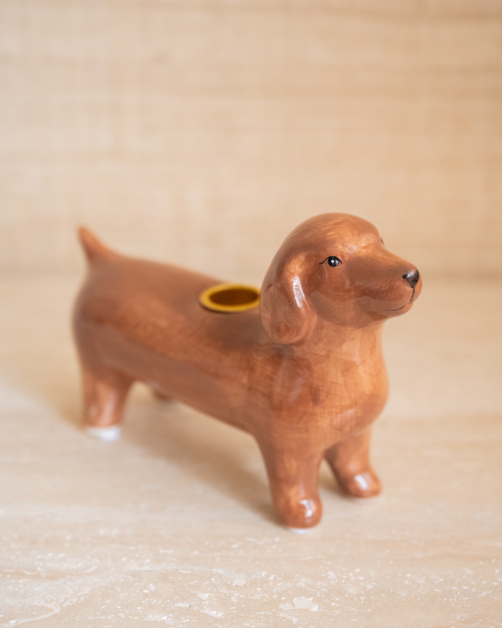 Deze cutie van een teckel is misschien wat lang van stuk, maar juist dat maakt ‘m perfect als kandelaar! Met een kaars op z’n rug zorgt hij voor een gezellige gloed én een knipoog in je interieur. Een verrassend leuk detail op je eettafel, vensterbank of dressoir – ideaal voor hondenliefhebbers met gevoel voor stijl.
