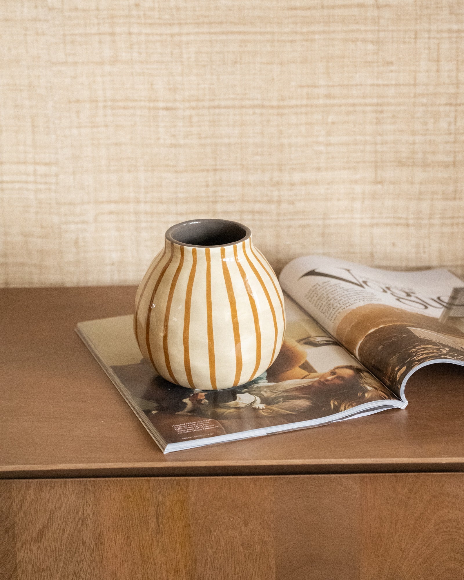 Handmade Vase Mia Stripe brengt warmte en karakter in je interieur met haar zachte, organische vorm en streeppatroon. De combinatie van crème en warme okertinten maakt deze vaas perfect als subtiel statement op een dressoir, tafel of plank. Mooi met een enkele bloem, maar ook op zichzelf een echte eyecatcher.