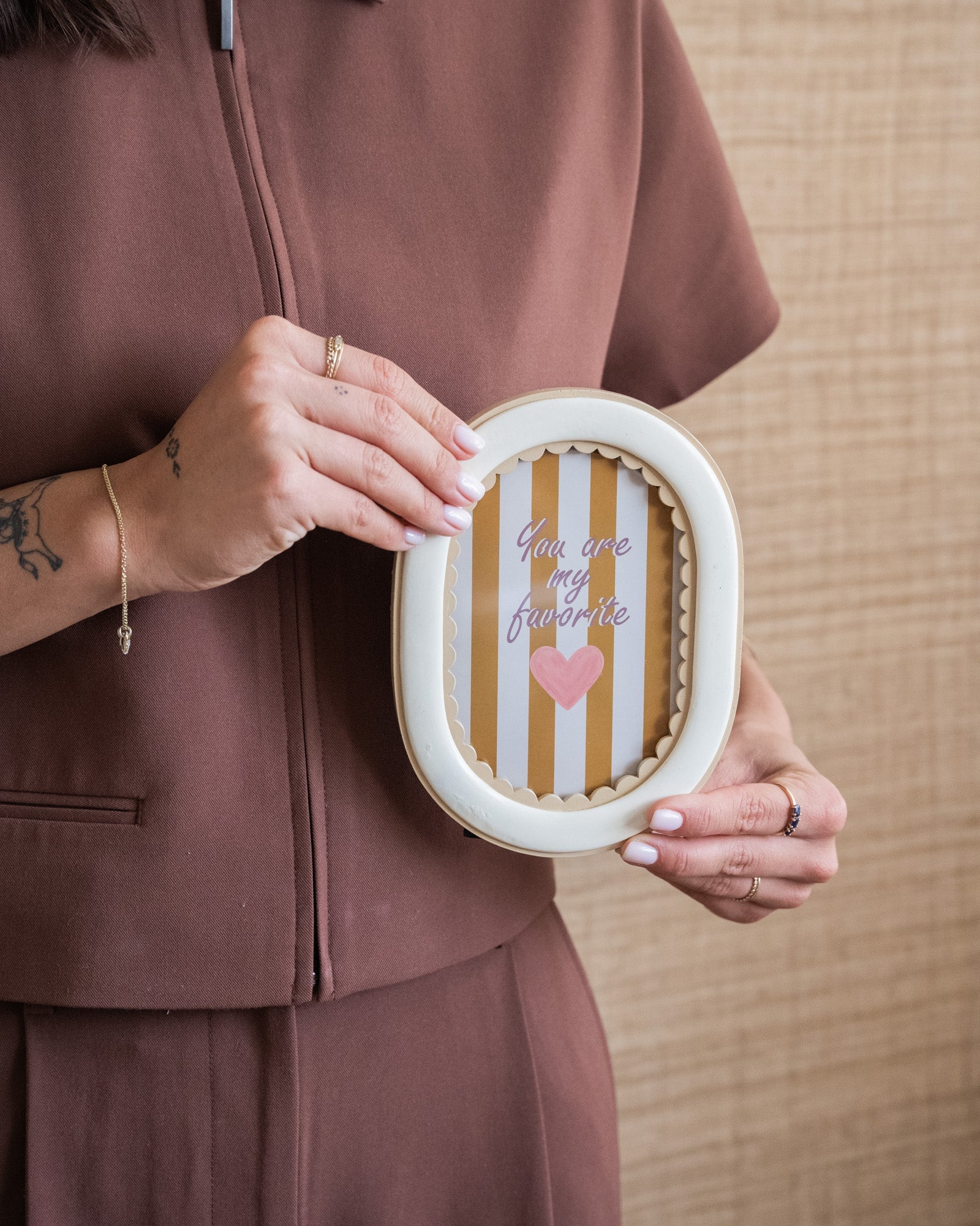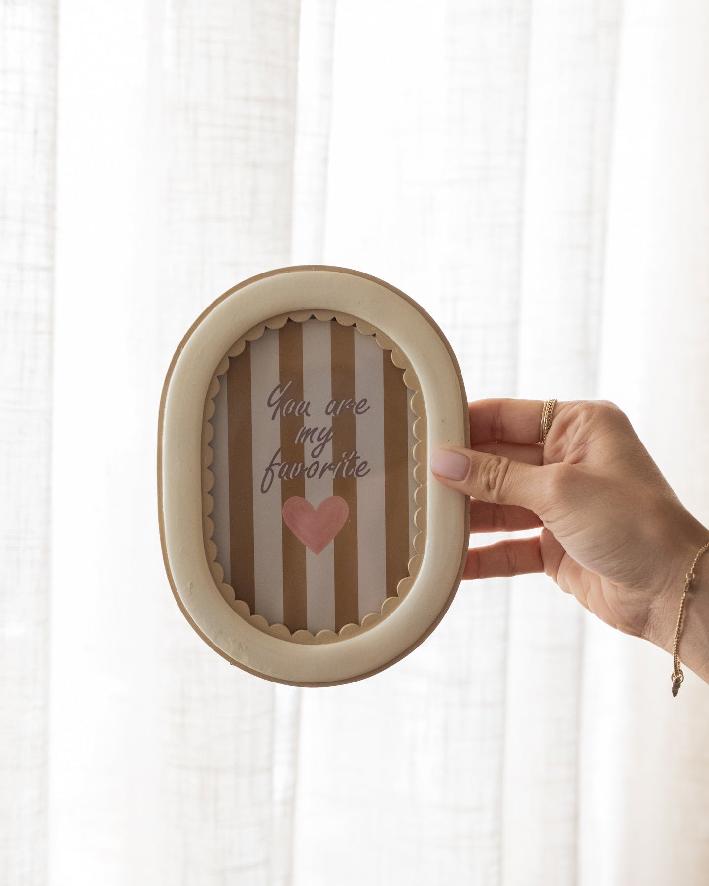 Geef je interieur een zachte en stijlvolle touch met Photo Frame Oval Beige. De elegante ovale vorm en subtiel golvende rand zorgen voor een speelse maar rustige uitstraling. Perfect om je favoriete foto, kaart of quote een mooie plek te geven op een dressoir, nachtkastje of wandplank.