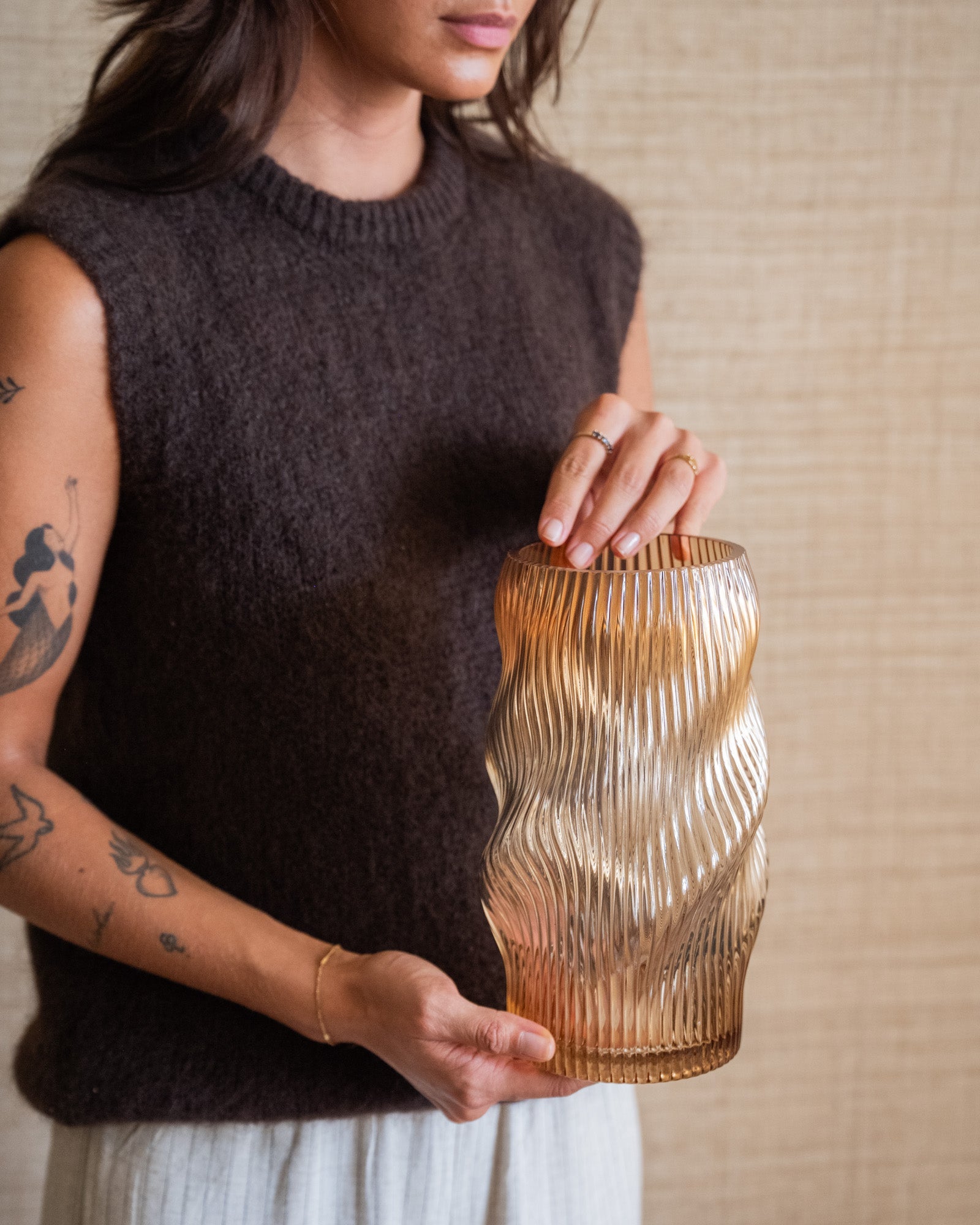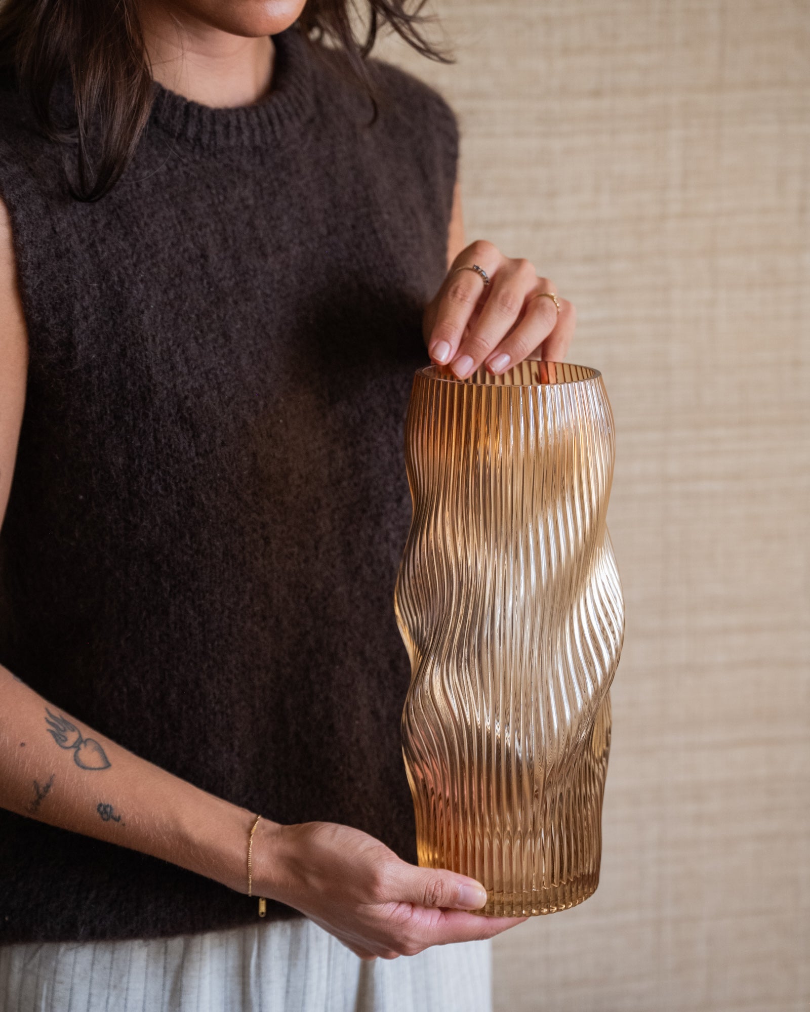 De Vase Glass Clear Brown is dé musthave voor een stijlvol interieur. Met zijn speelse, golvende design en warme bruine tint geeft hij elke ruimte een moderne, cozy vibe. Verkrijgbaar in small en medium, perfect voor bloemen of gewoon als eyecatcher!