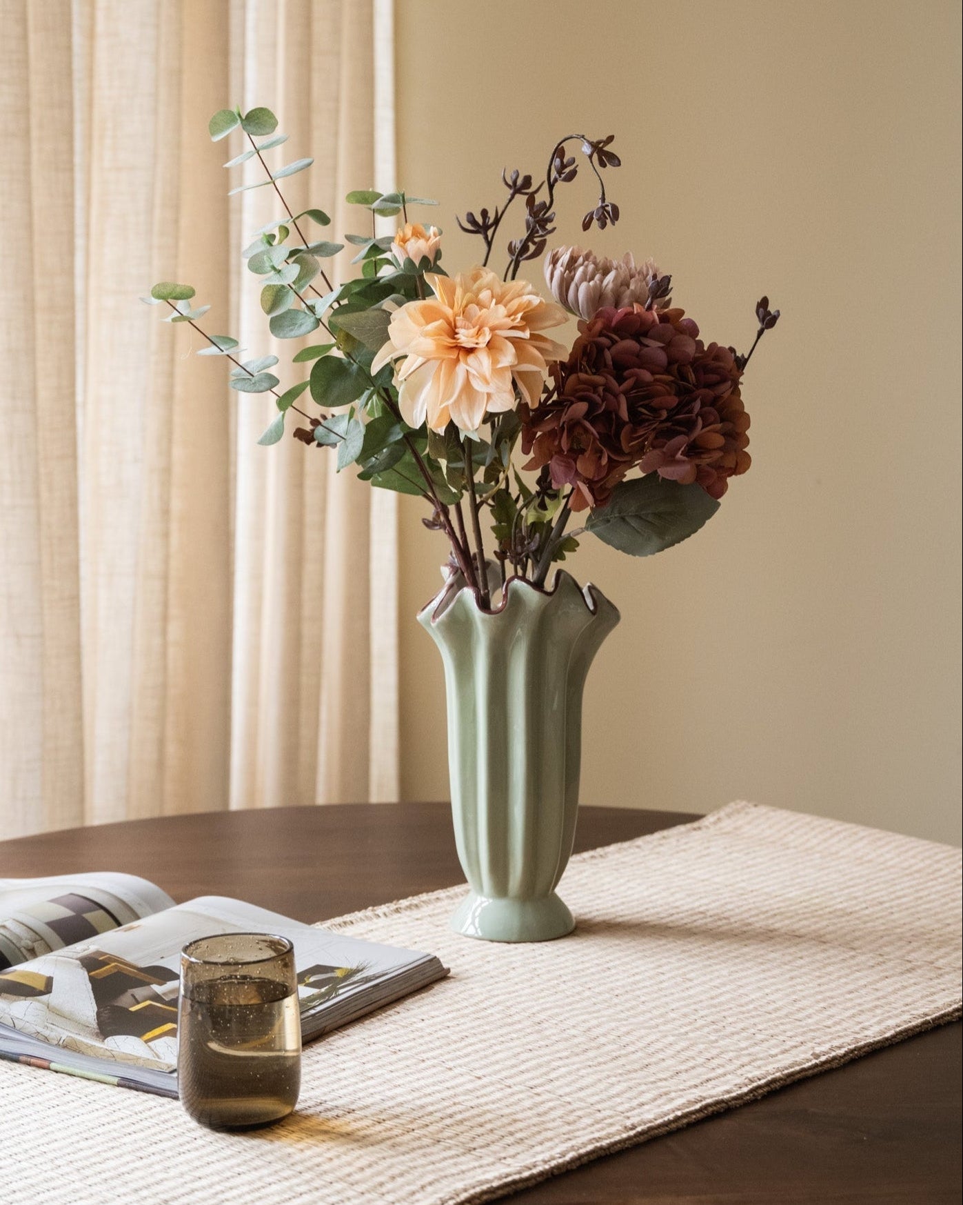 Breng speelse elegantie in je interieur met deze golvende dolomietvaas in zachtgroene tinten. De decoratieve vaas is perfect om te stylen met kunstbloemen, droogbloemen of takken en geeft elke ruimte een frisse en moderne uitstraling. Een echte eyecatcher op tafel, dressoir of vensterbank.