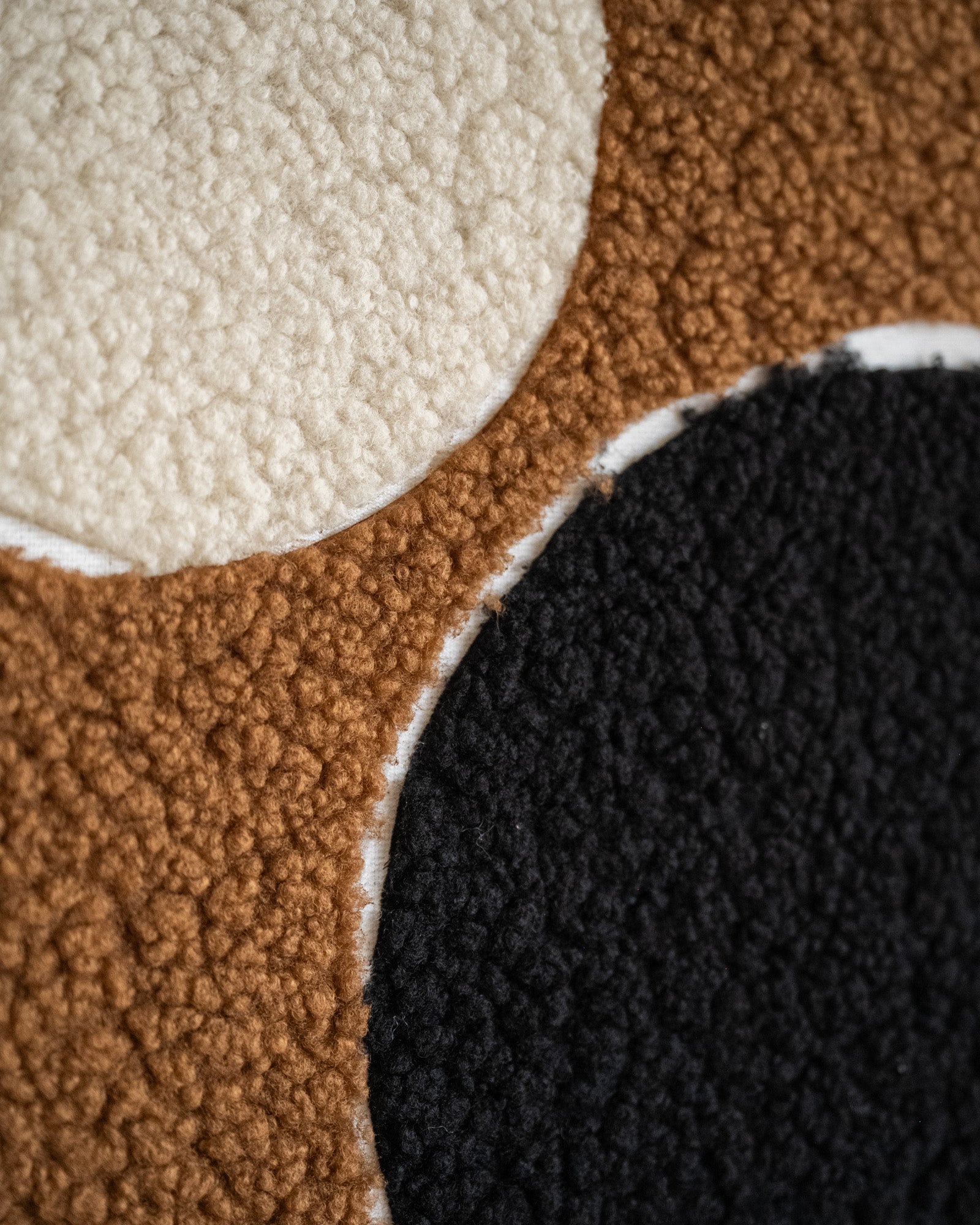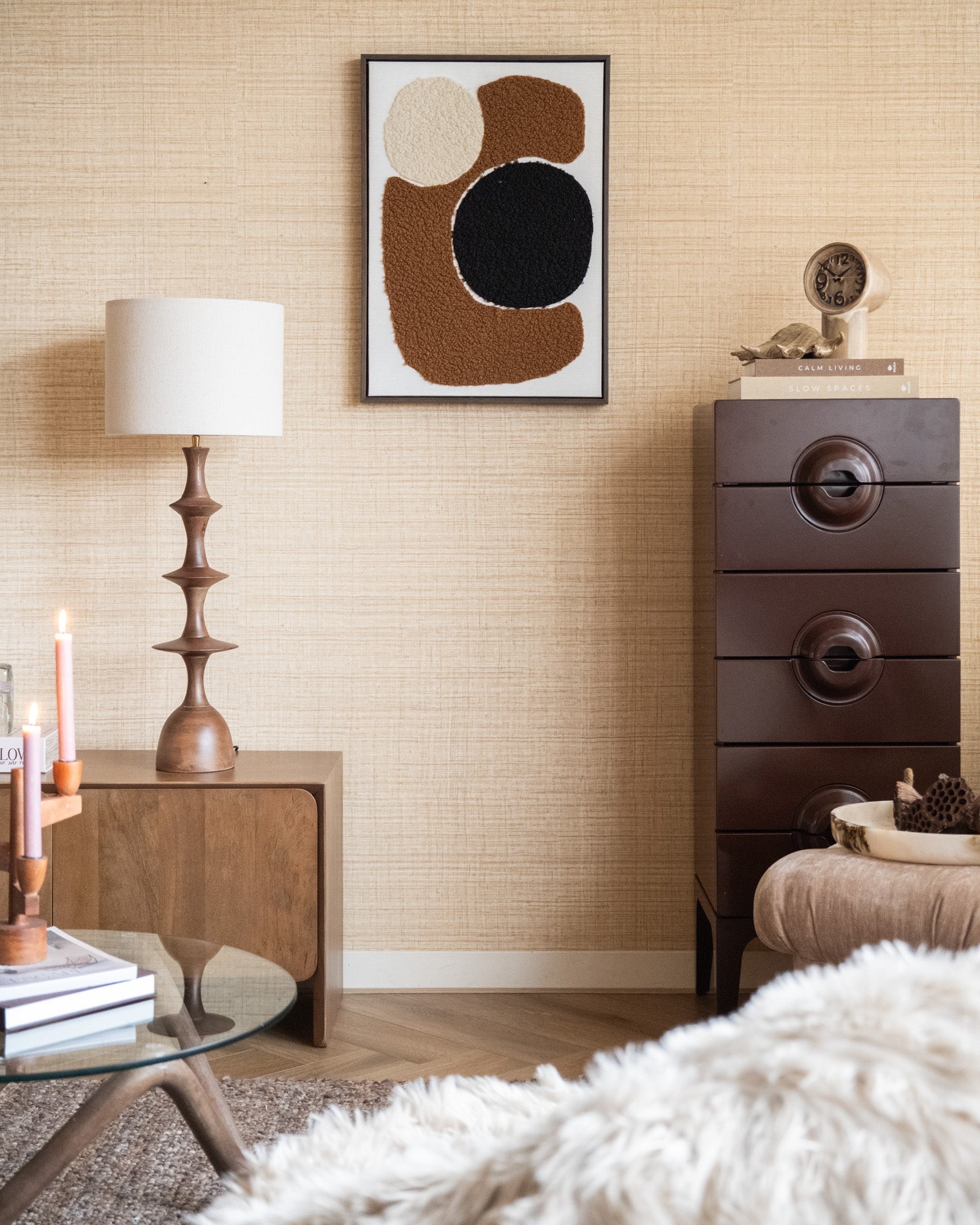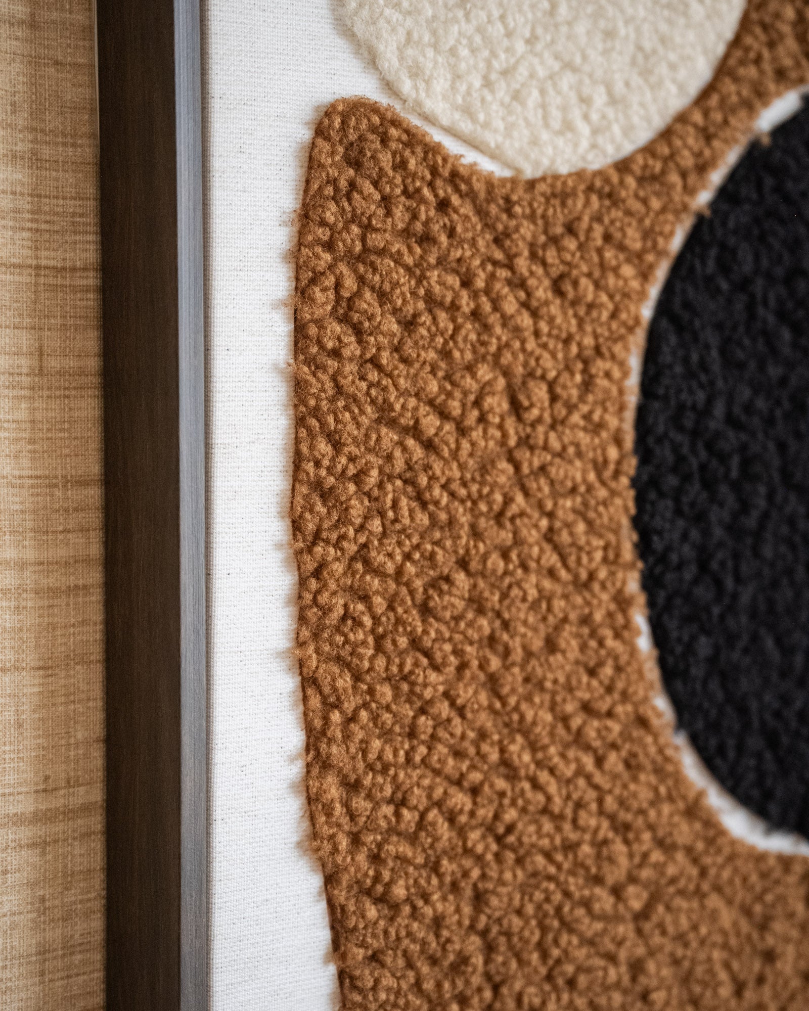 Breng warmte en stijl in je interieur met deze abstracte wall art van wol. De organische vormen in beige, bruin en zwart maken dit kunstwerk een moderne eyecatcher. Perfecte muurdecoratie voor je woonkamer, slaapkamer of hal.