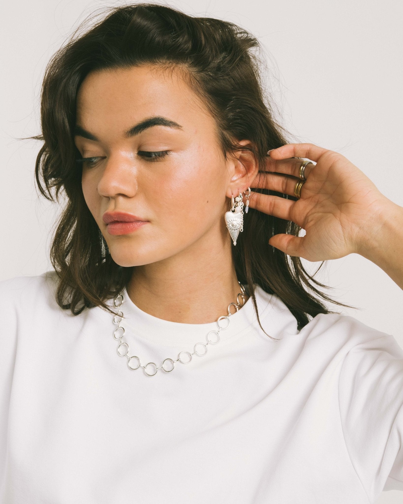 Zilveren oorbellen met een subtiel oogdetail en een speelse vorm. Mooi te combineren met de bijpassende ring en ketting. 🤍