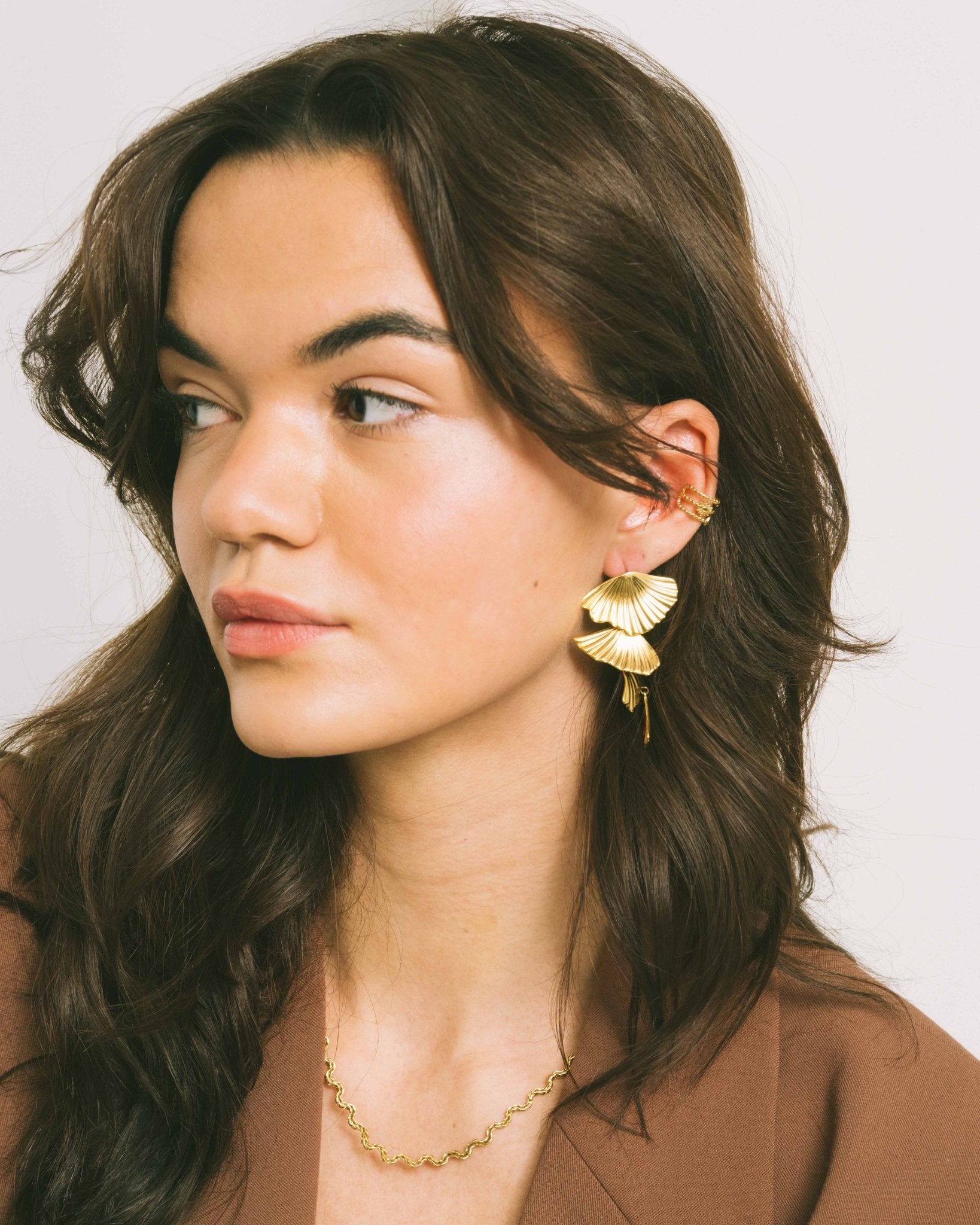 Alsof je een klein kunstwerk draagt. De vloeiende, gouden vormen zorgen voor beweging, licht en precies de juiste dosis drama.
