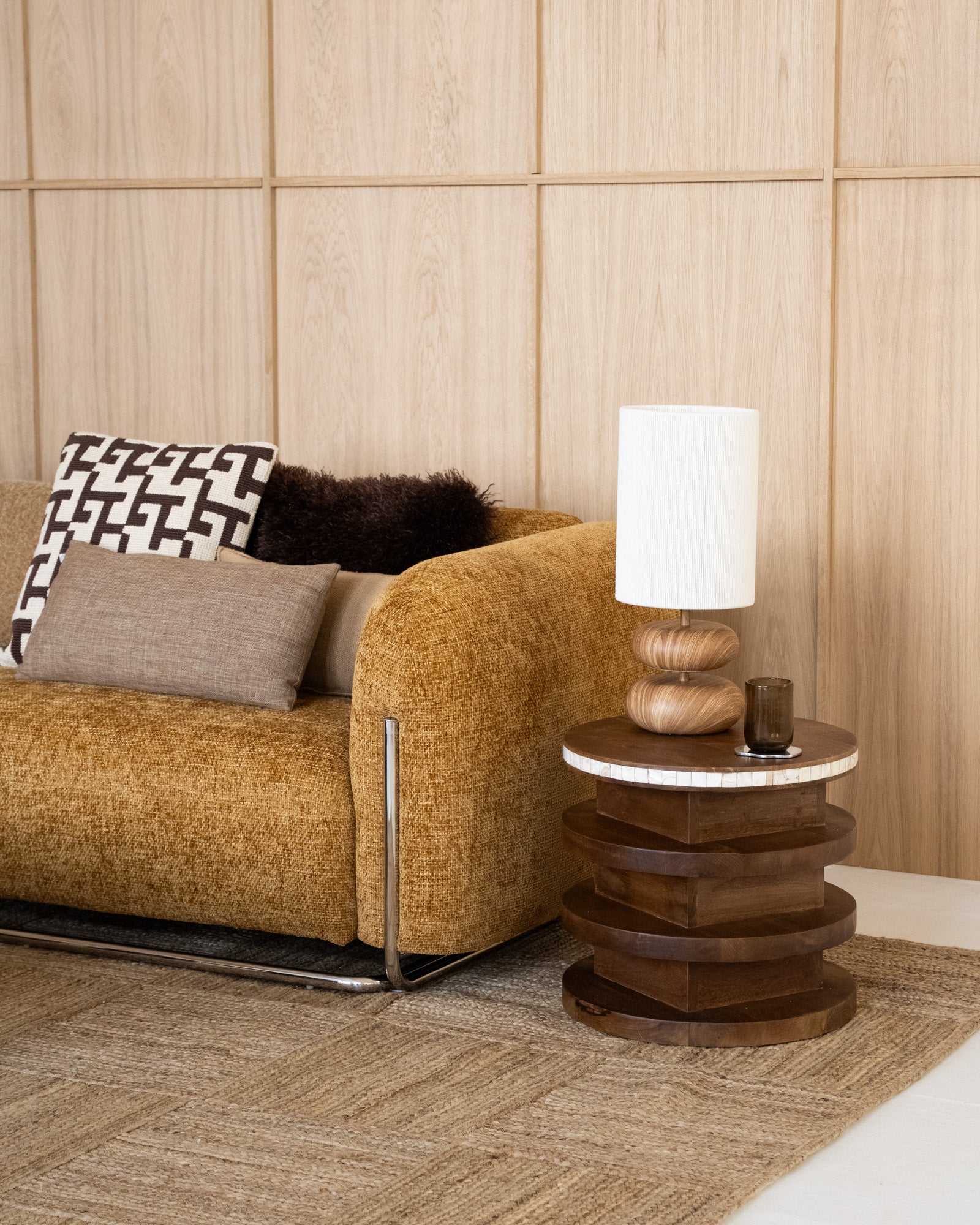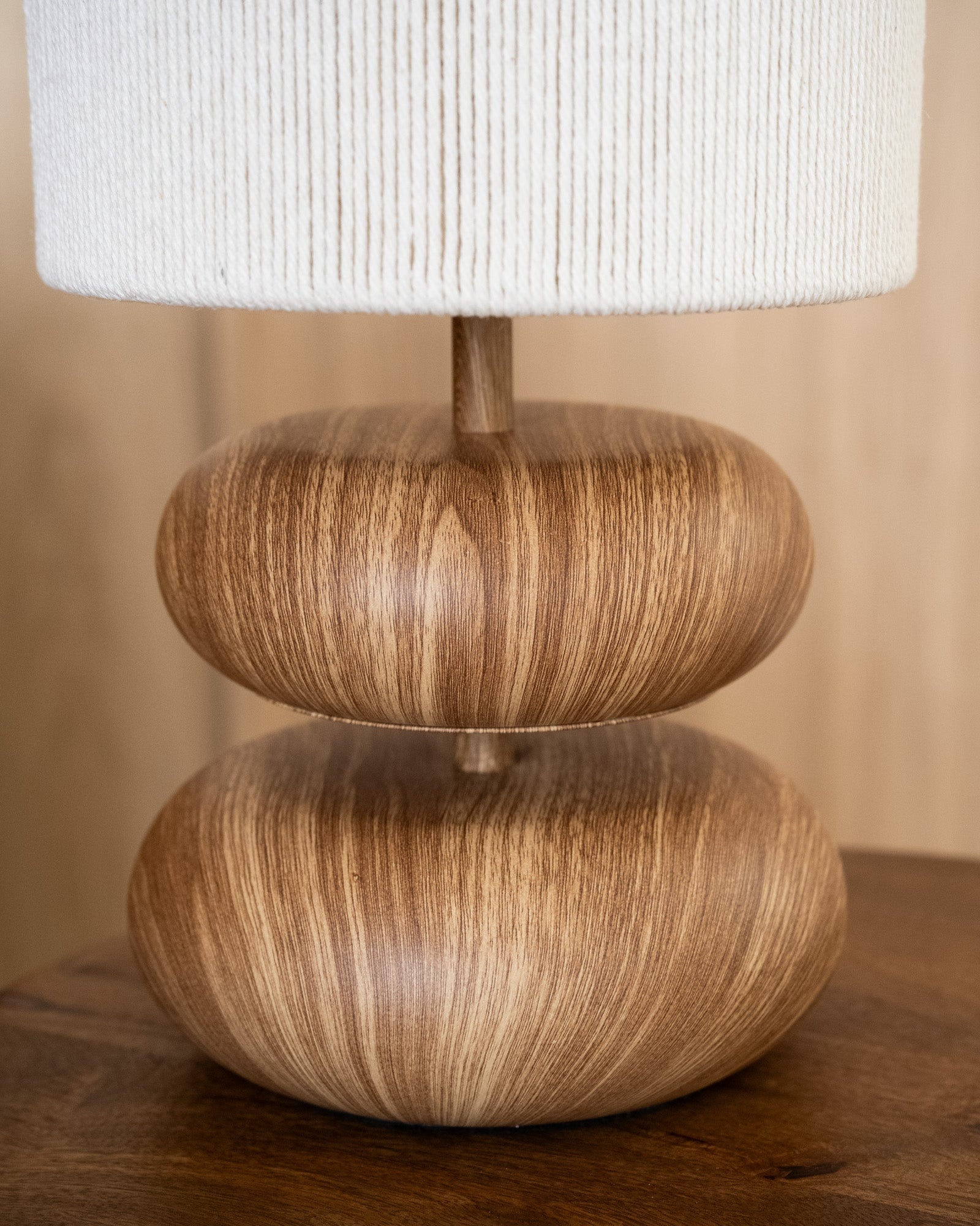 Hoe leuk is dit tafellampje! De voet van de lamp heeft een houtlook maar is daadwerkelijk gemaakt van metaal. De twee bollingen van de voet in combinatie met de kap van touw zorgt voor een mooi contrast. Zet hem op je dressoir of in een mooie kast, op elke plek komt hij mooi uit! Perfecte toevoeging aan jouw Japandi interieur.
