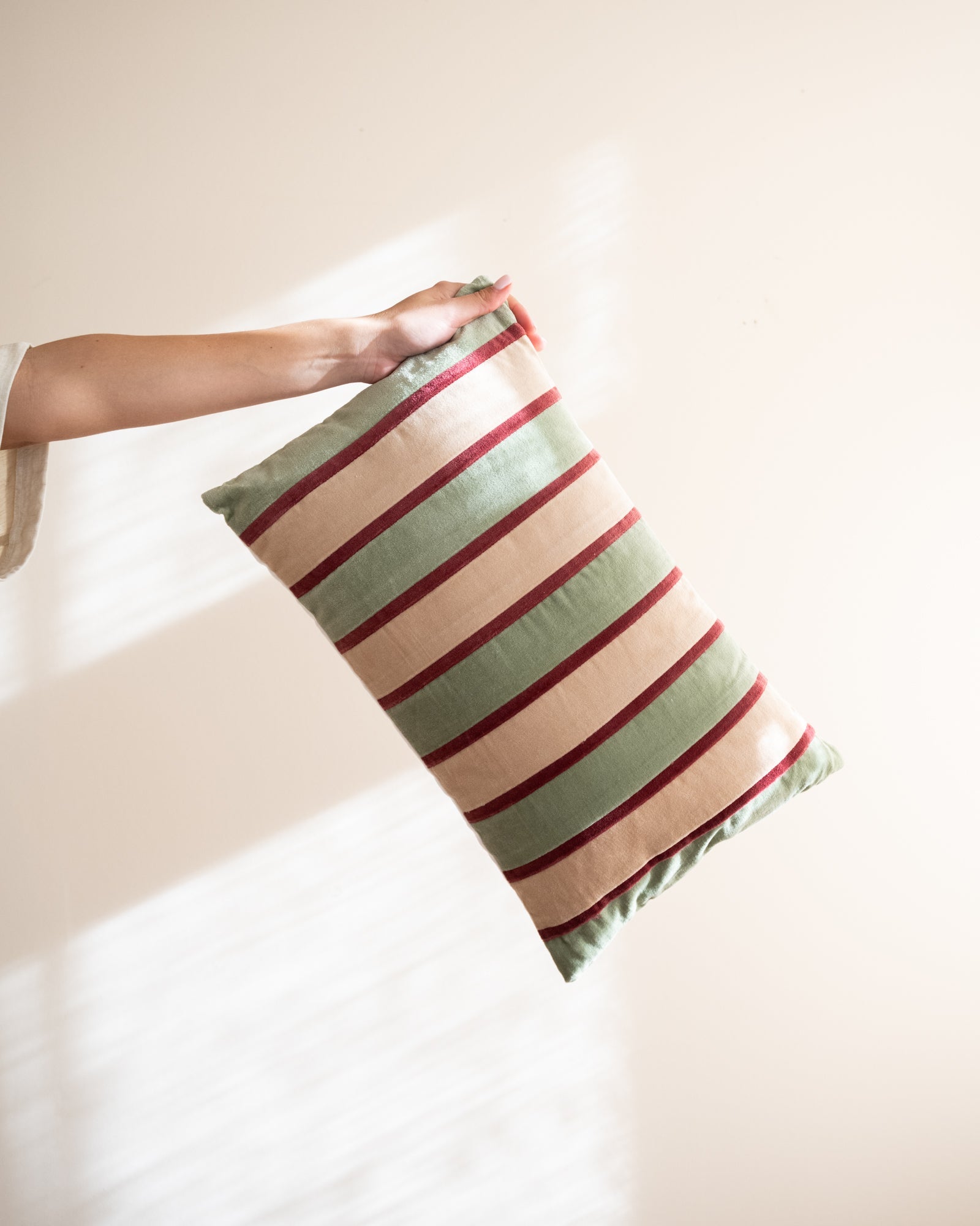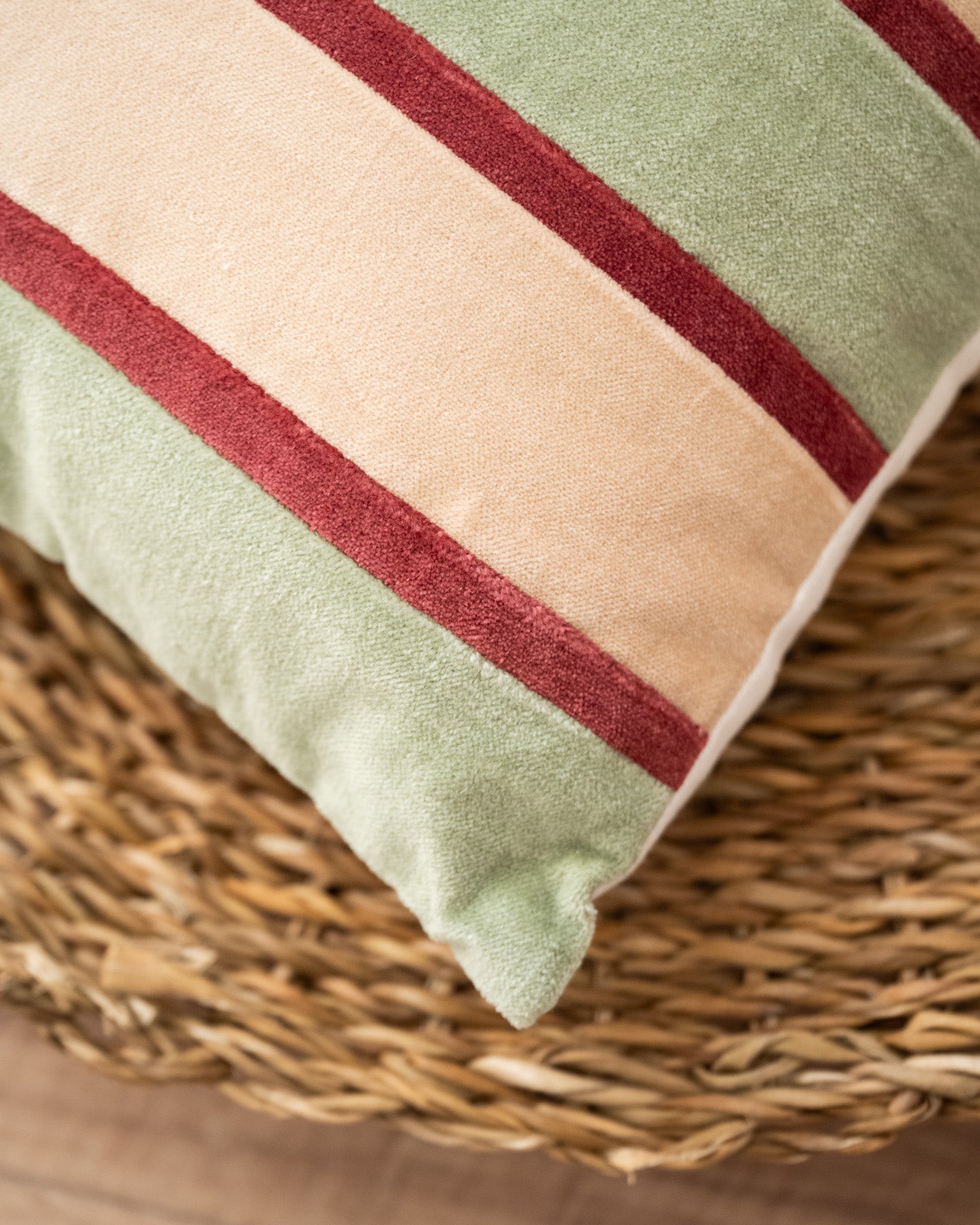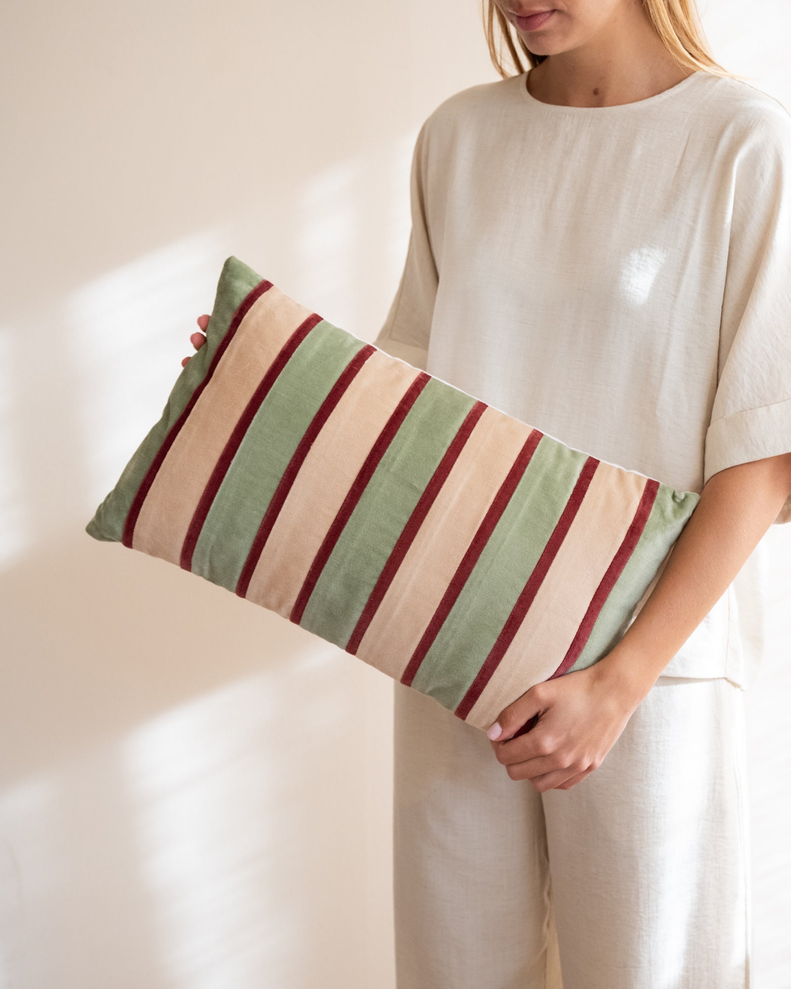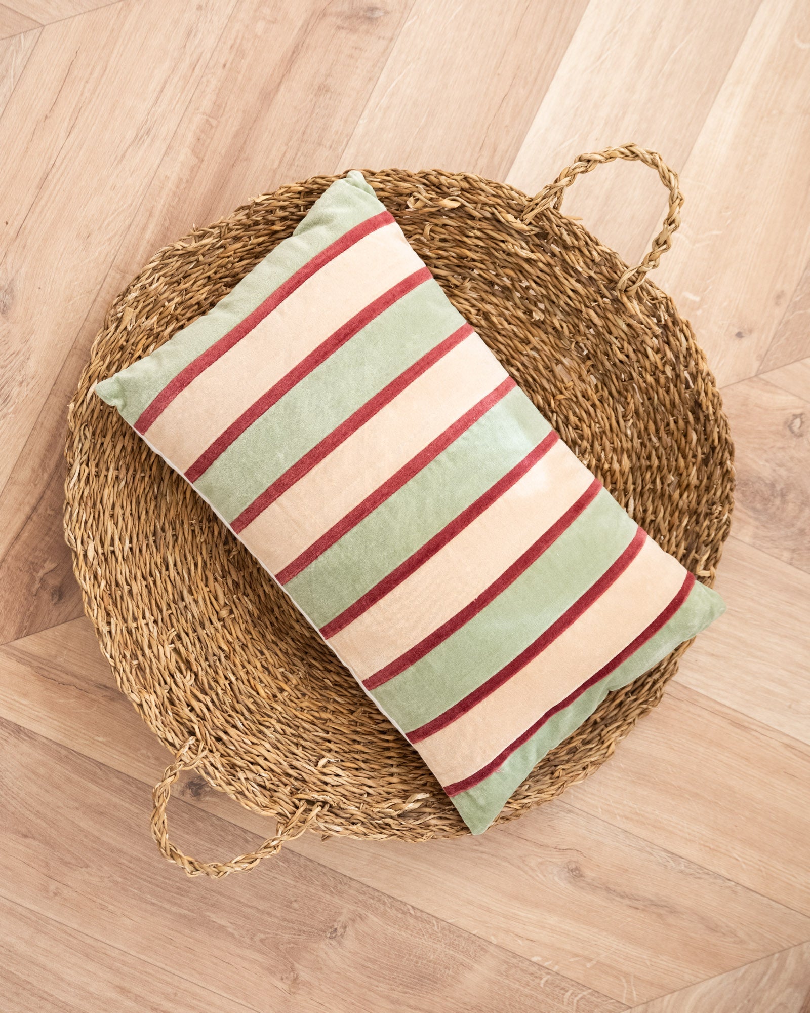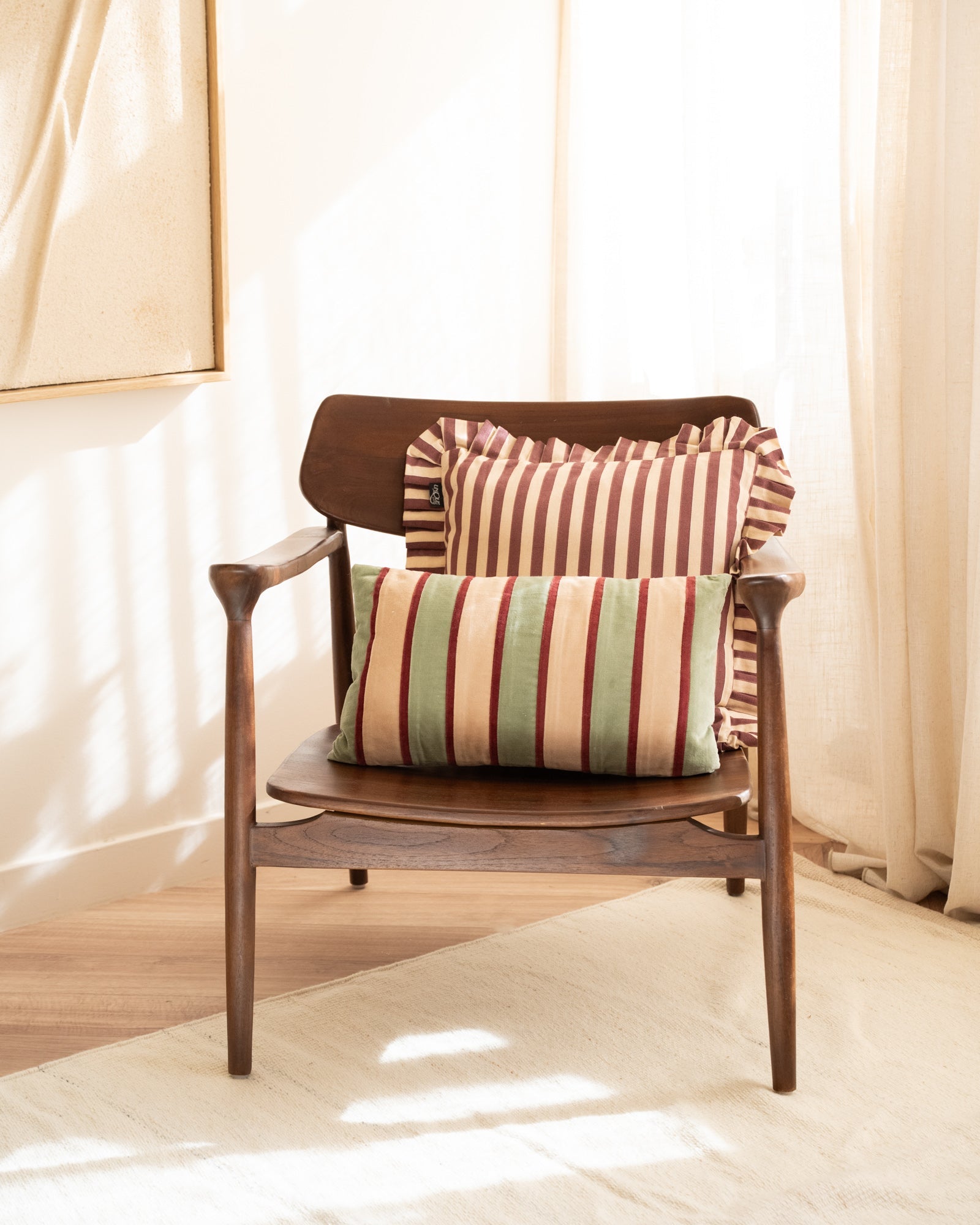 Geef je interieur een frisse en speelse update met Cushion Riga Burgundy/Matcha Green. De zachte strepen in bordeaux, matcha groen en warme beige tinten zorgen voor een unieke, maar easy-to-match look. Perfect voor op de bank, fauteuil of bed en ideaal om te combineren met andere kussens voor een gelaagd geheel. Ook mega leuk als buitenkussen op je balkon of in de tuin tijdens zonnige dagen.