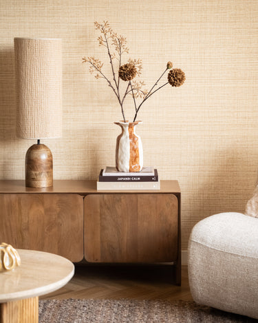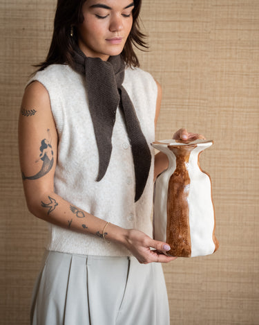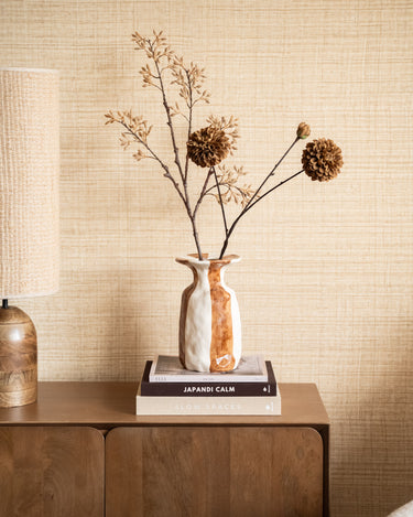 De Deco Vase Larisa is een stijlvolle keramieken vaas met een zachte beige basis en warme roestbruine strepen. De organische vorm en aardse tinten geven de vaas een rustige, natuurlijke uitstraling. Mooi met een paar takken, droogbloemen of als decoratief object op zichzelf op een dressoir, tafel of plank.