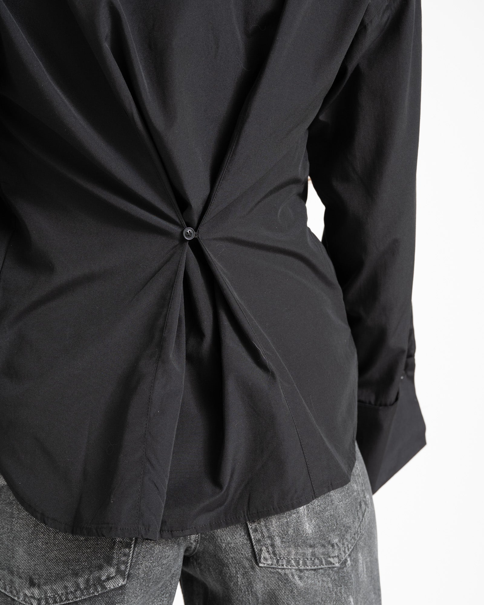 Deze boxy zwarte blouse heeft een chic knoopdetail aan de achterkant. Minimal, maar super stylish.