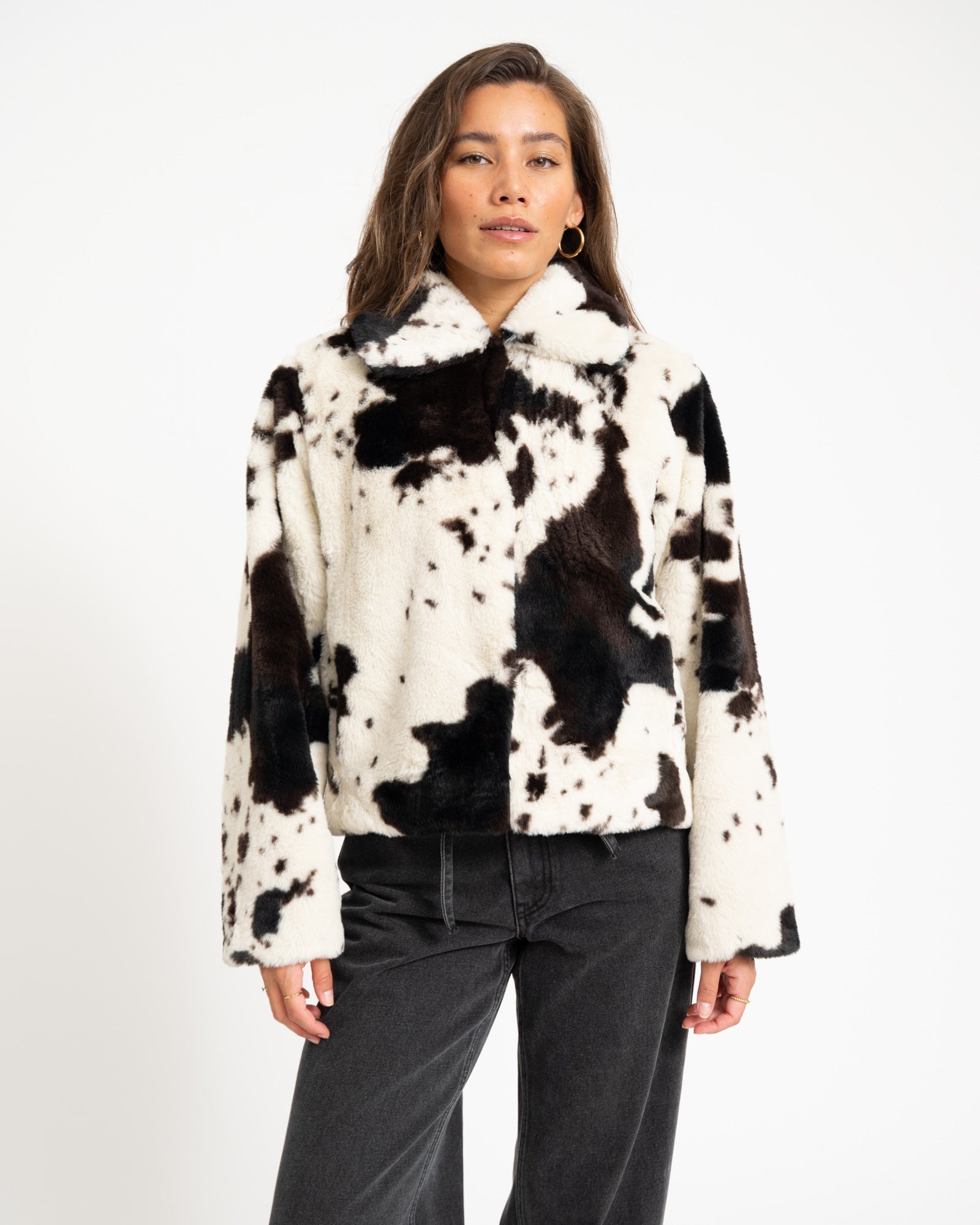 Deze fur jas met koeienprint is allesbehalve basic. De opvallende cow print in zachte faux fur maakt ‘m speels én stylish. Een korte fit die je moeiteloos styled.