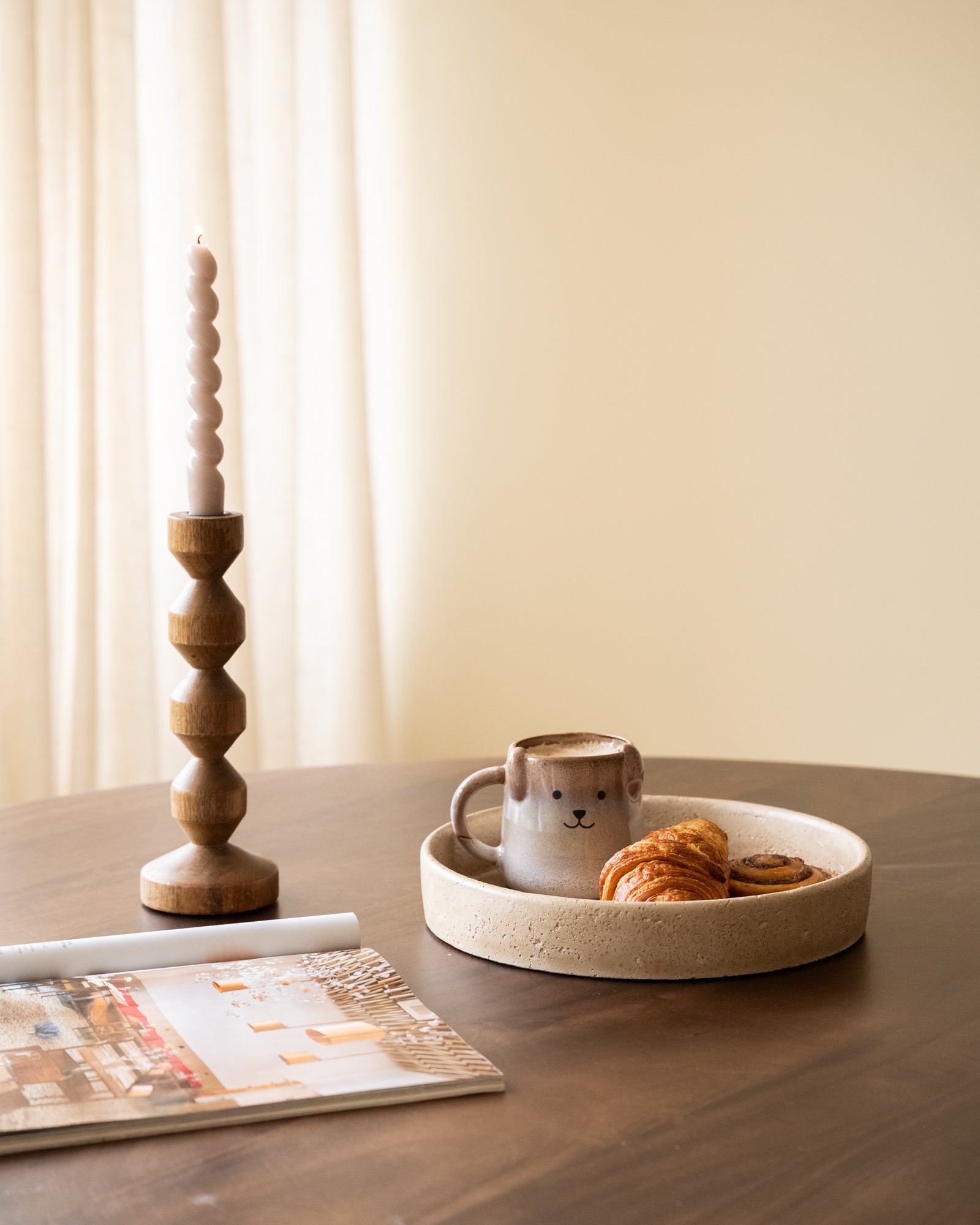 is afgewerkt in warme aardetinten. De rustieke textuur is het resultaat van een reactieve glazuurlaag, waardoor elke mok lichte kleurverschillen vertoont en daardoor uniek is. Het schattige hondje op de voorkant geeft de mok een speelse en charmante uitstraling – perfect voor elke dierenliefhebber.