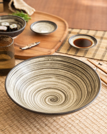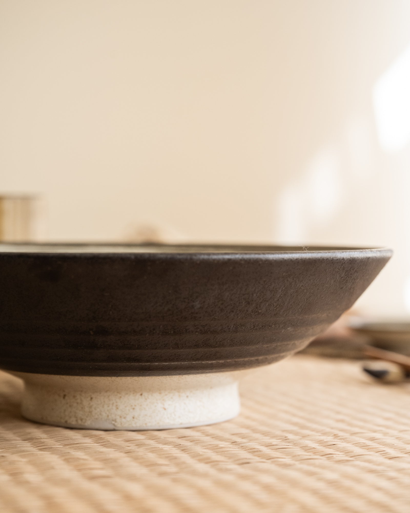 Deze ruime, handgemaakte kom uit de Asashio-serie is perfect voor het serveren van noedels, curry, salades of shared dining. De diepe vorm en het contrasterende ontwerp, met een donkere buitenzijde en lichte, handbewerkte binnenzijde, geven de kom een krachtige maar serene uitstraling.