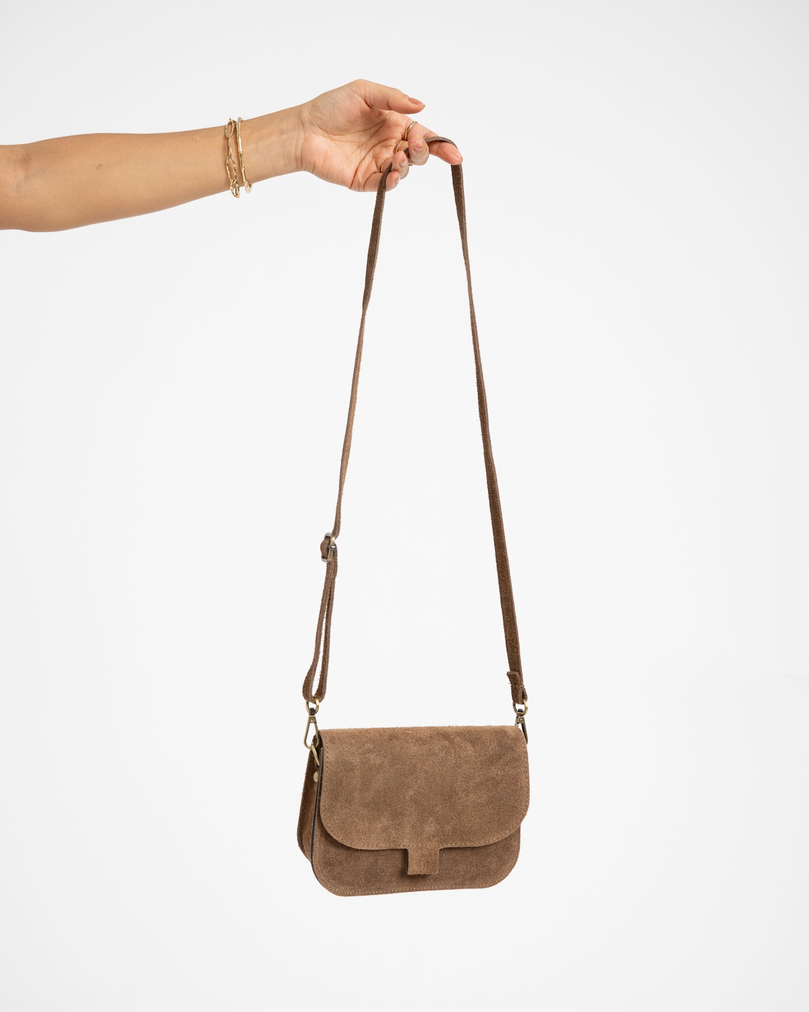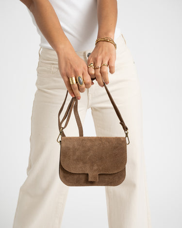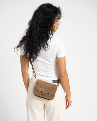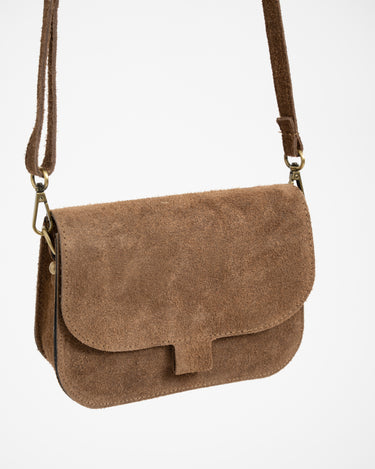 Suede leren crossbodytas met een magneetsluiting en een lang verstelbaar hengsel.