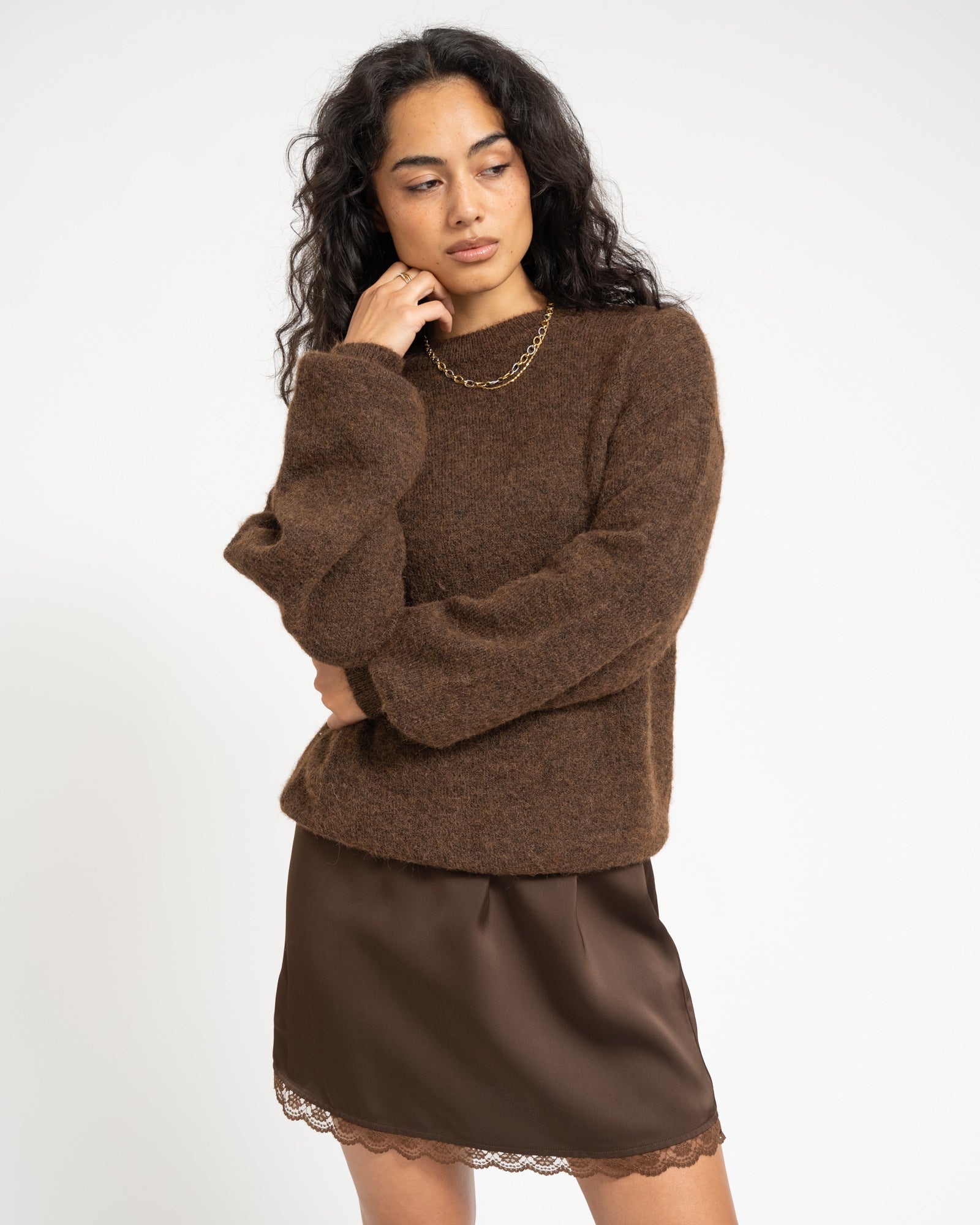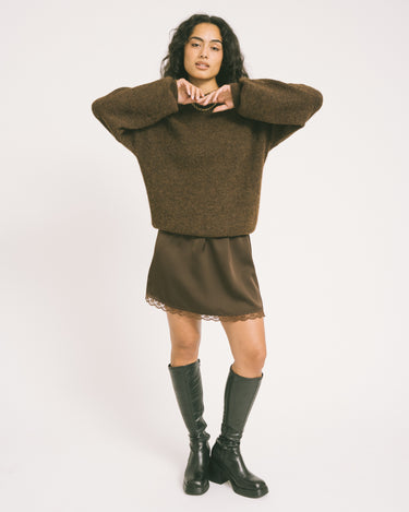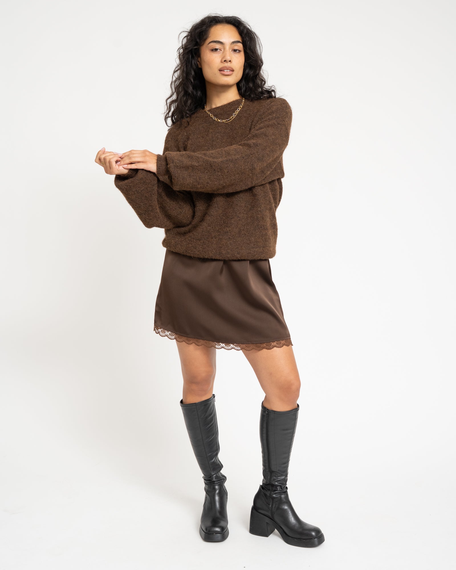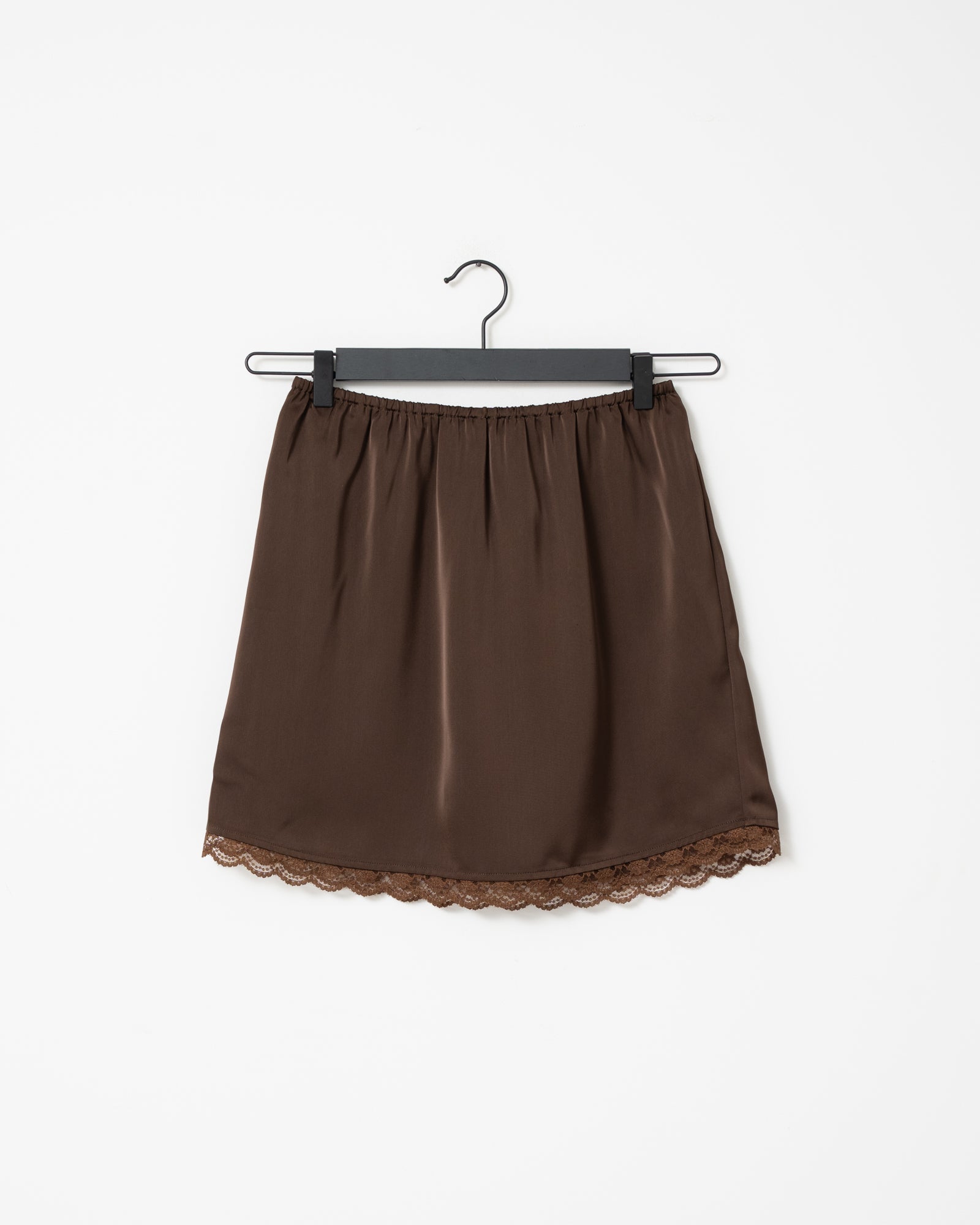 Vrouwelijk en moeiteloos chic. De satijnen glans en kanten details geven deze rok een romantische touch. Perfect met een grote zachte knit.