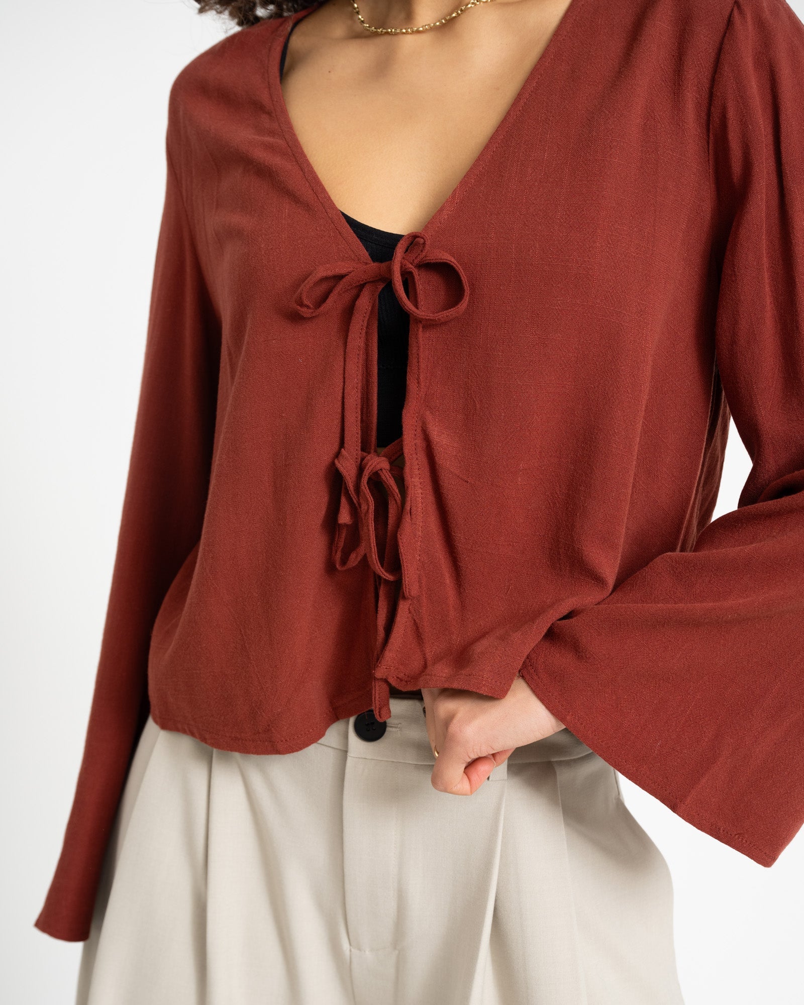 Our new favorite! Een semi-crop top, gemaakt van een linnenmix, met flare mouwen. De top is ook beschikbaar is zwart en burgundy.