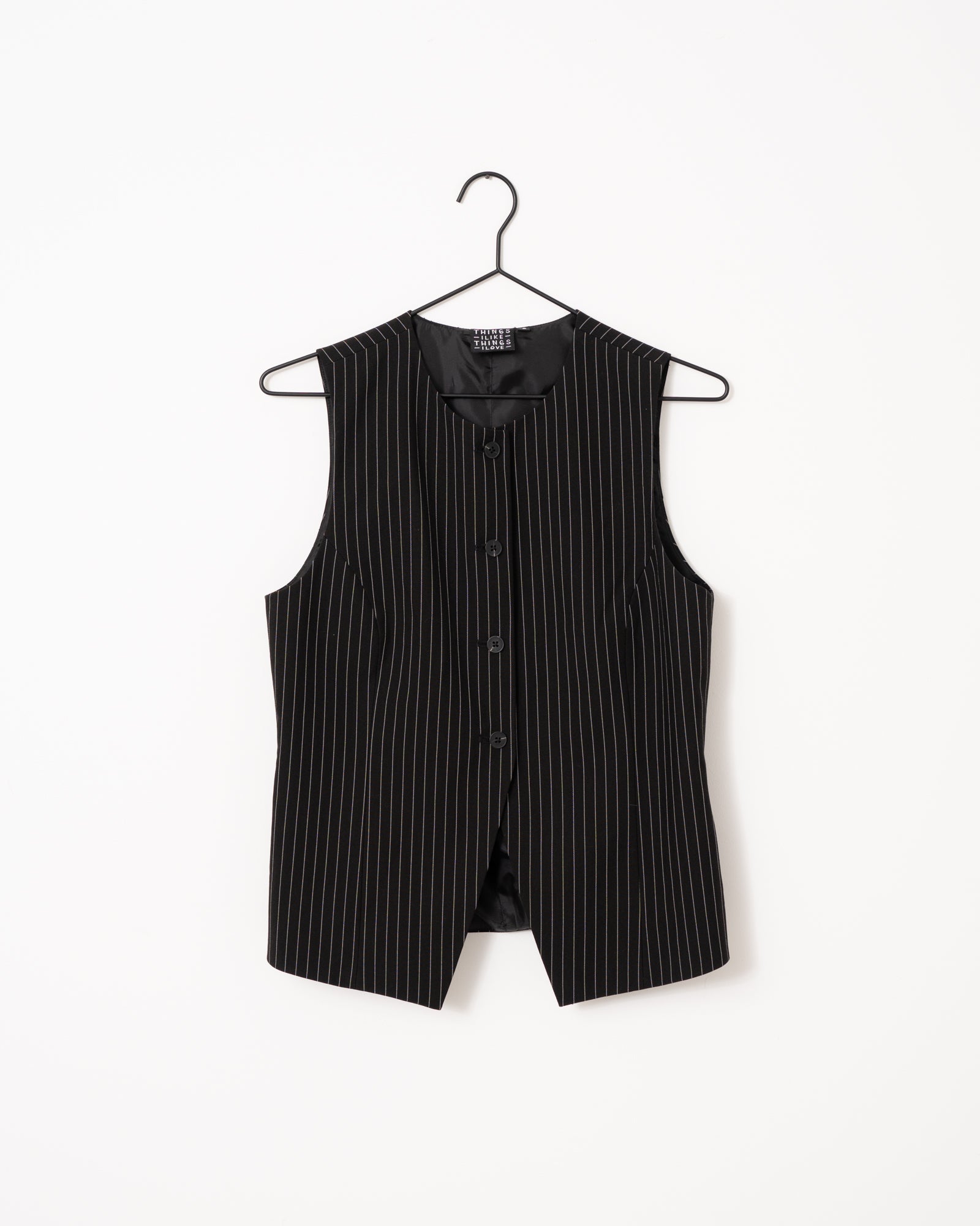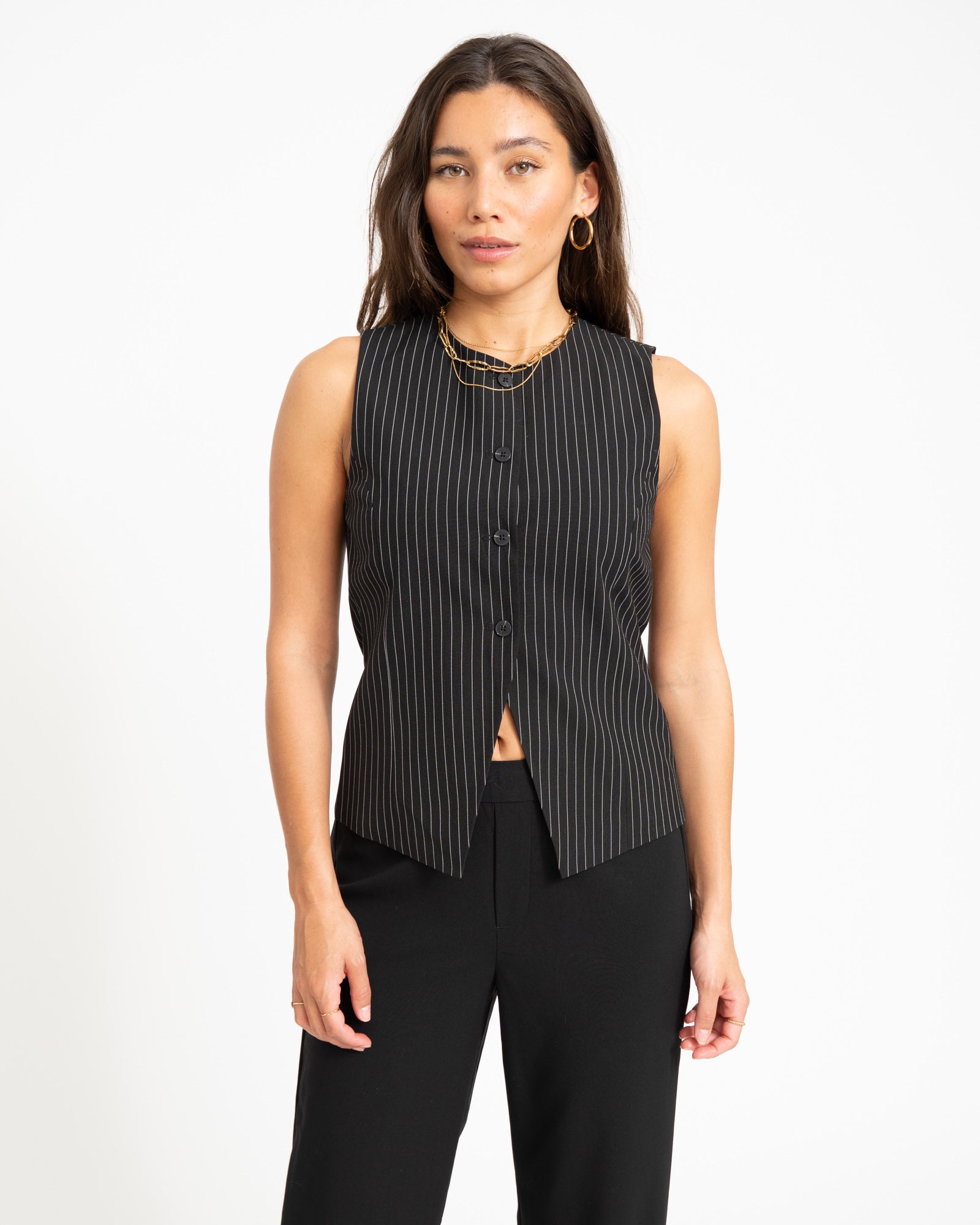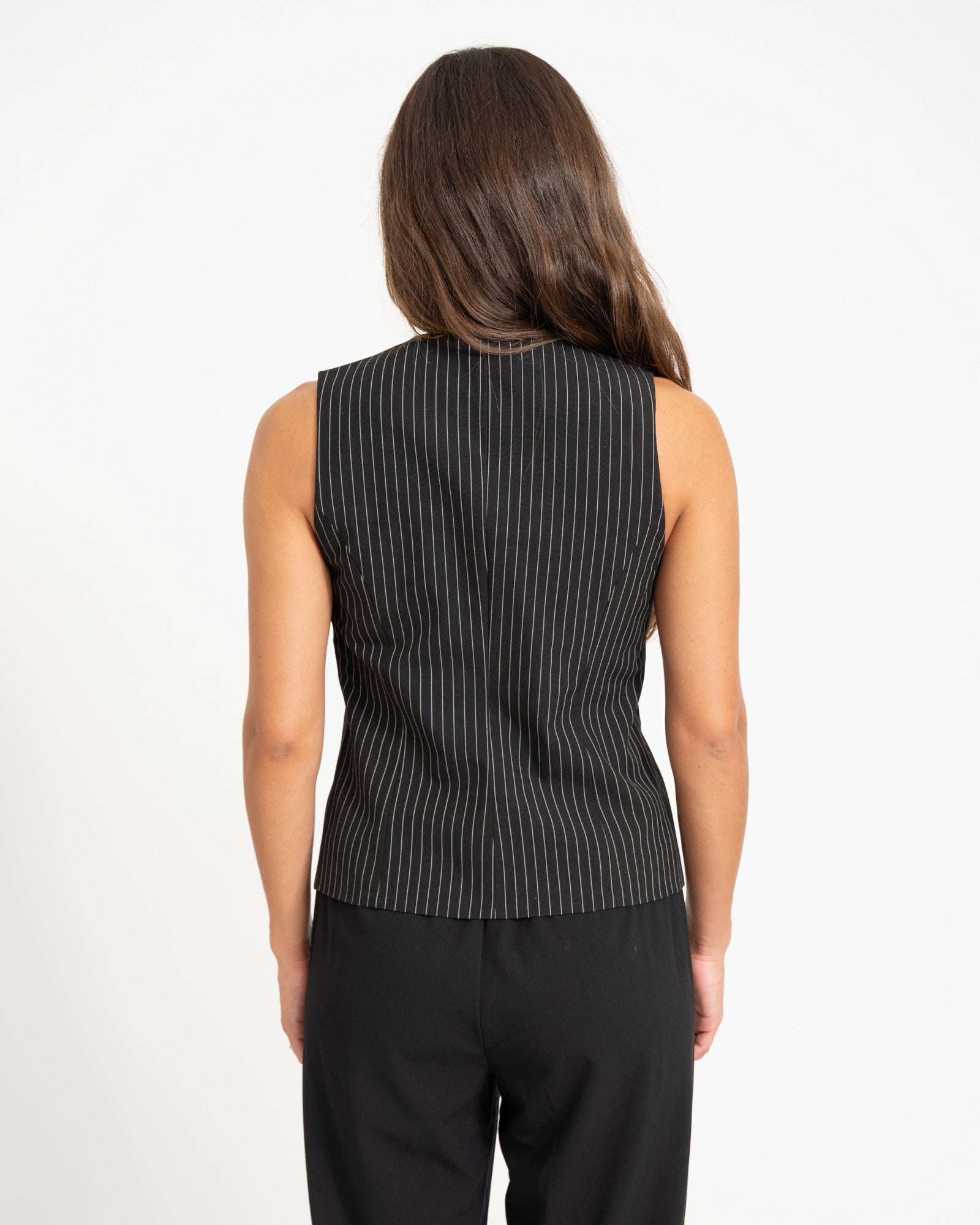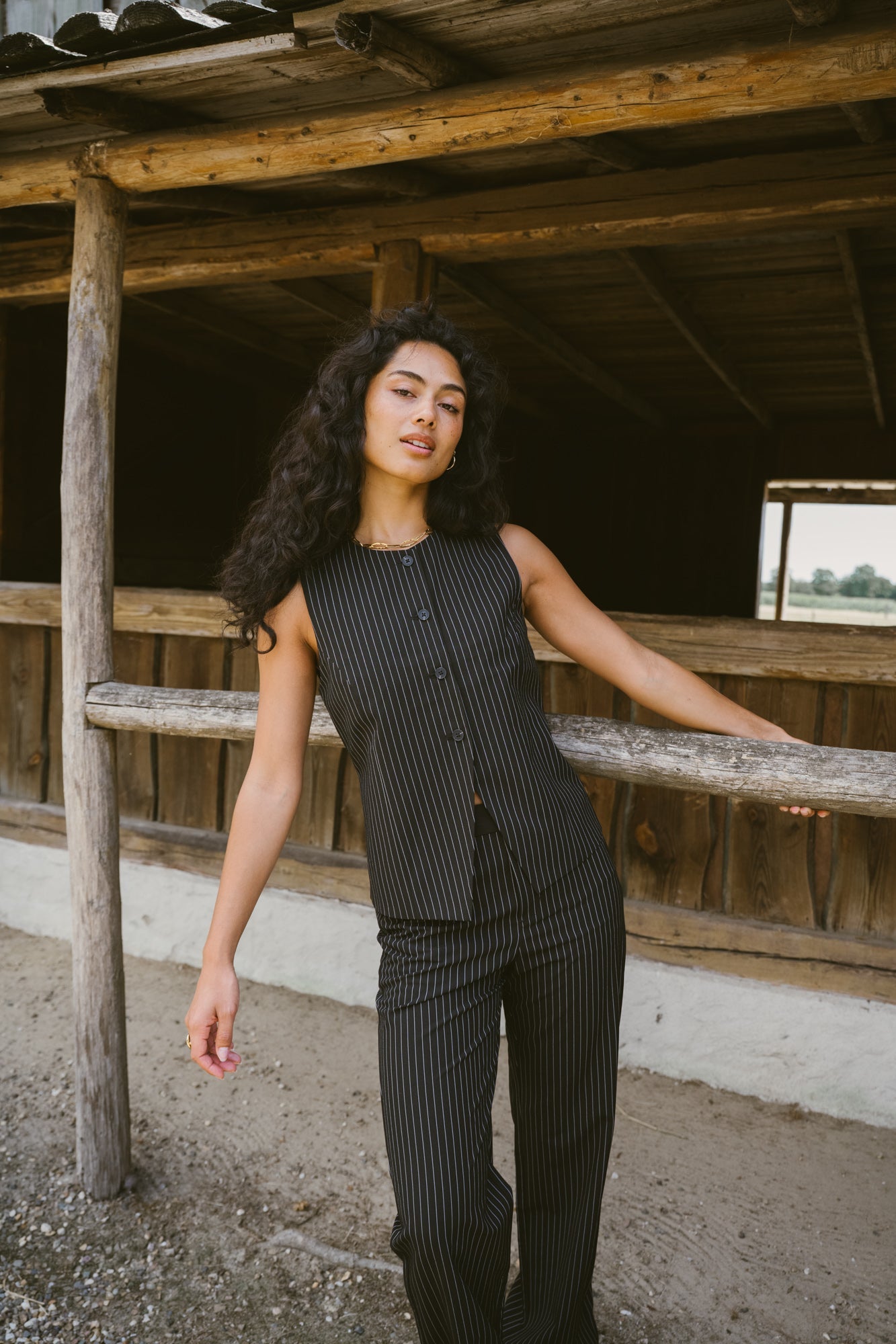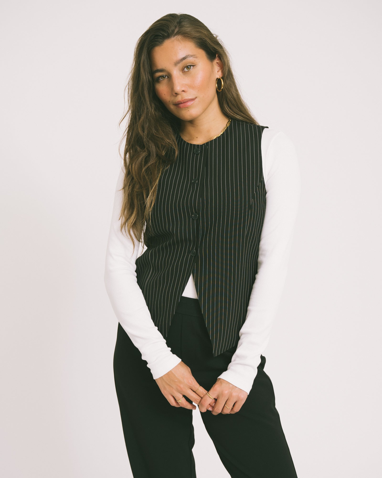 Minimalistisch en vrouwelijk. Dit pinstripe gilet sluit mooi aan op het lichaam en heeft een hoge halslijn voor een clean look. De knoopsluiting aan de voorkant stopt net iets hoger, waardoor er een subtiele split ontstaat voor een speels detail.