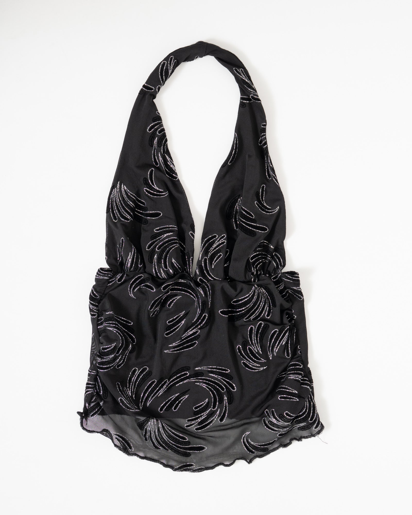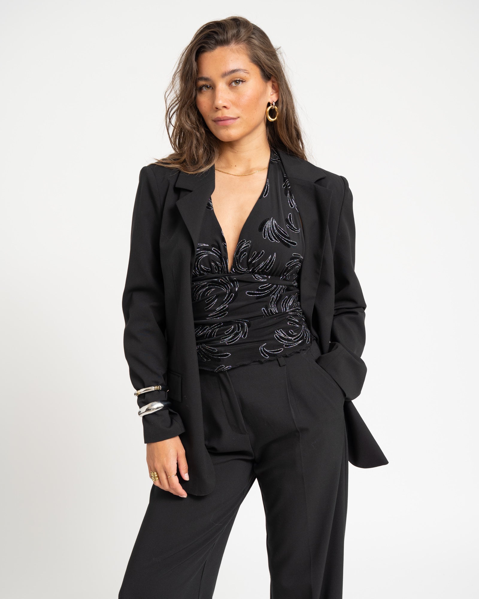Shine all night long! De Dina Top is dé party essential voor dit seizoen. Met haar diepe halter neckline en zilveren glitterpatroon, is dit de perfecte top voor een feestje en elke andere gelegenheid waar je wilt opvallen.