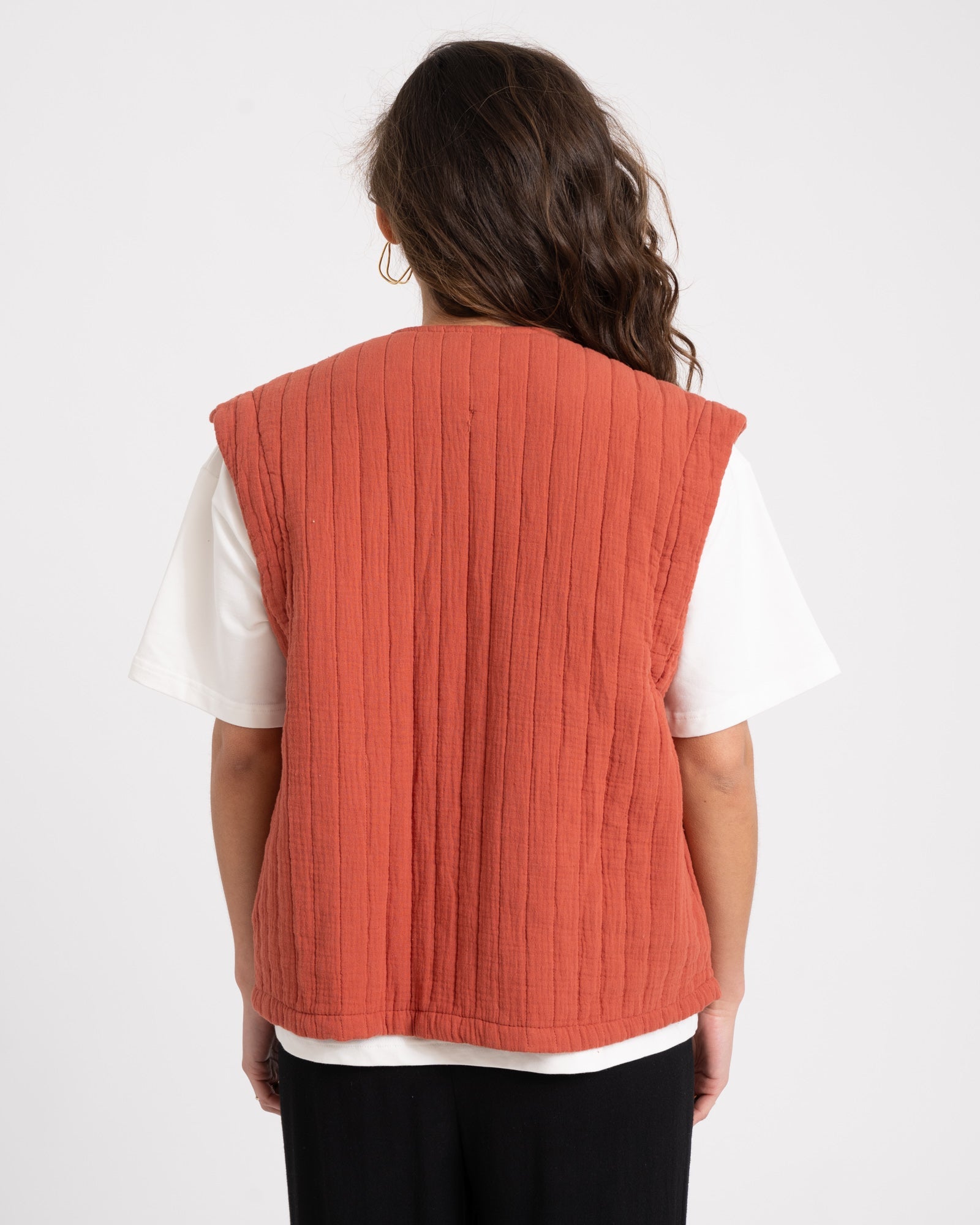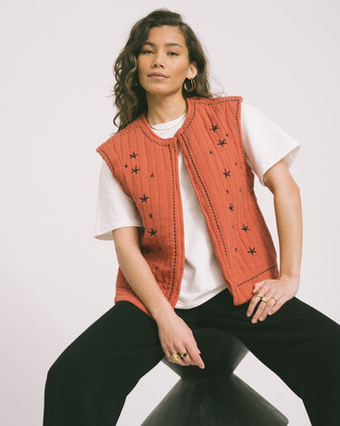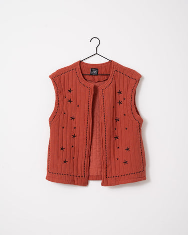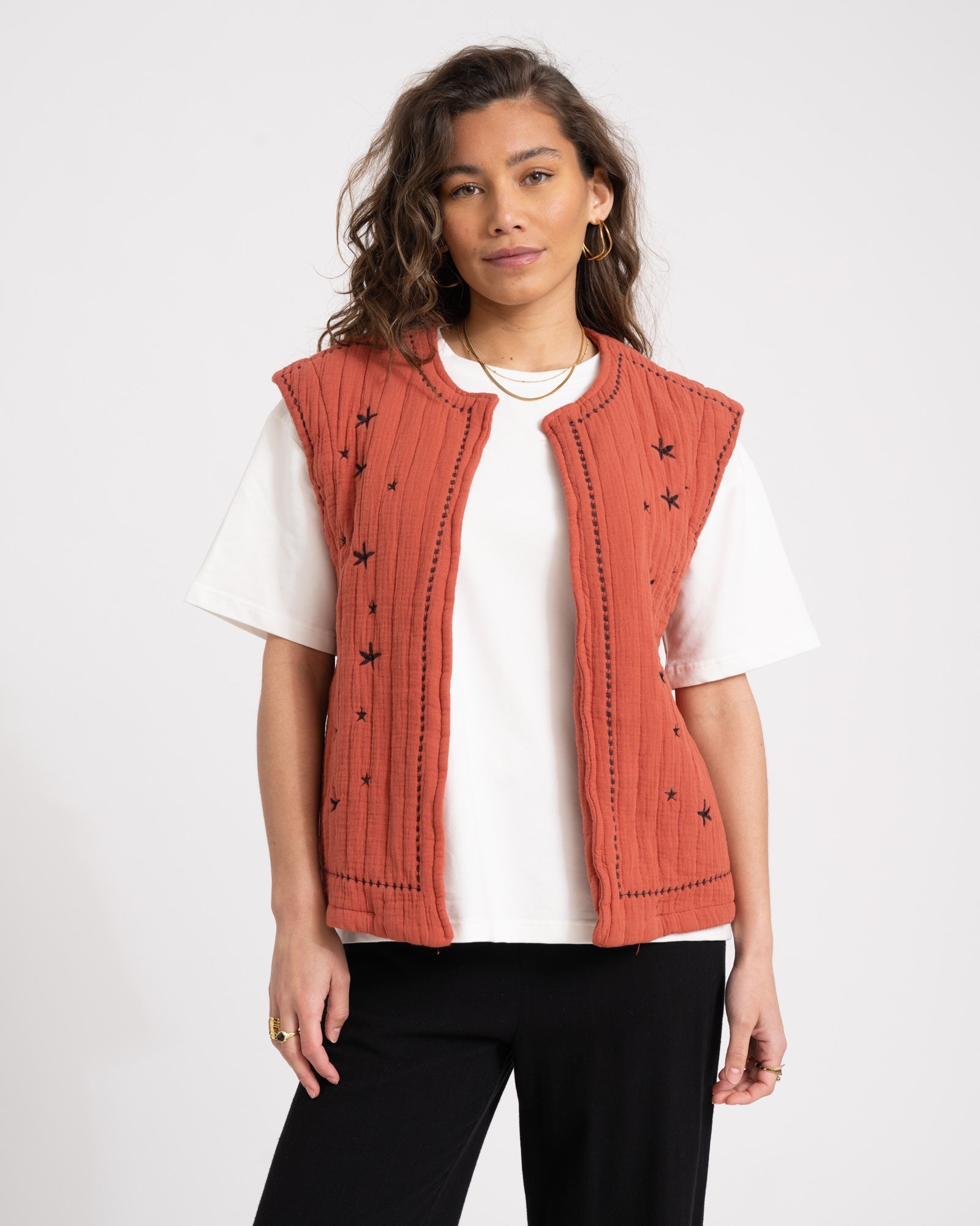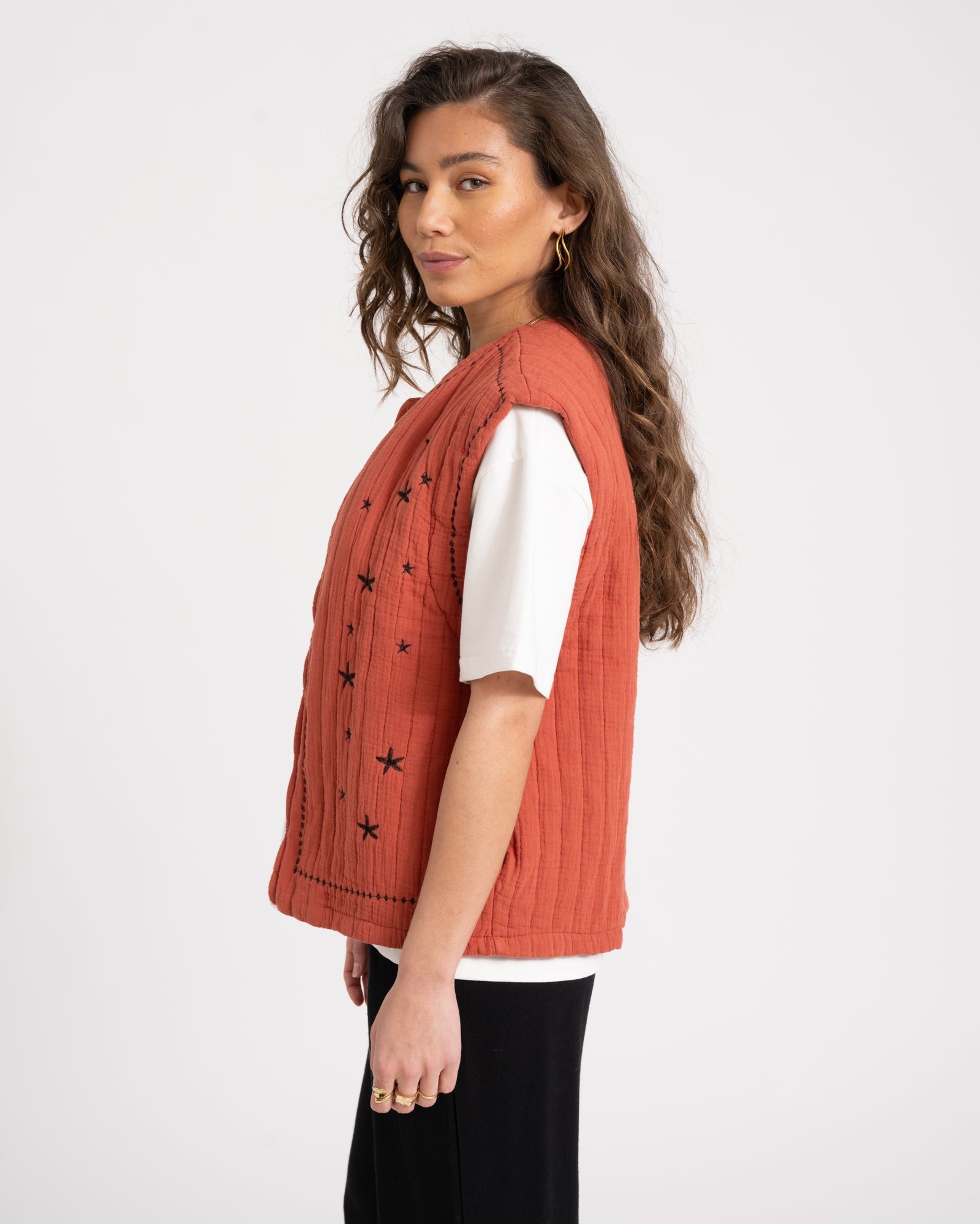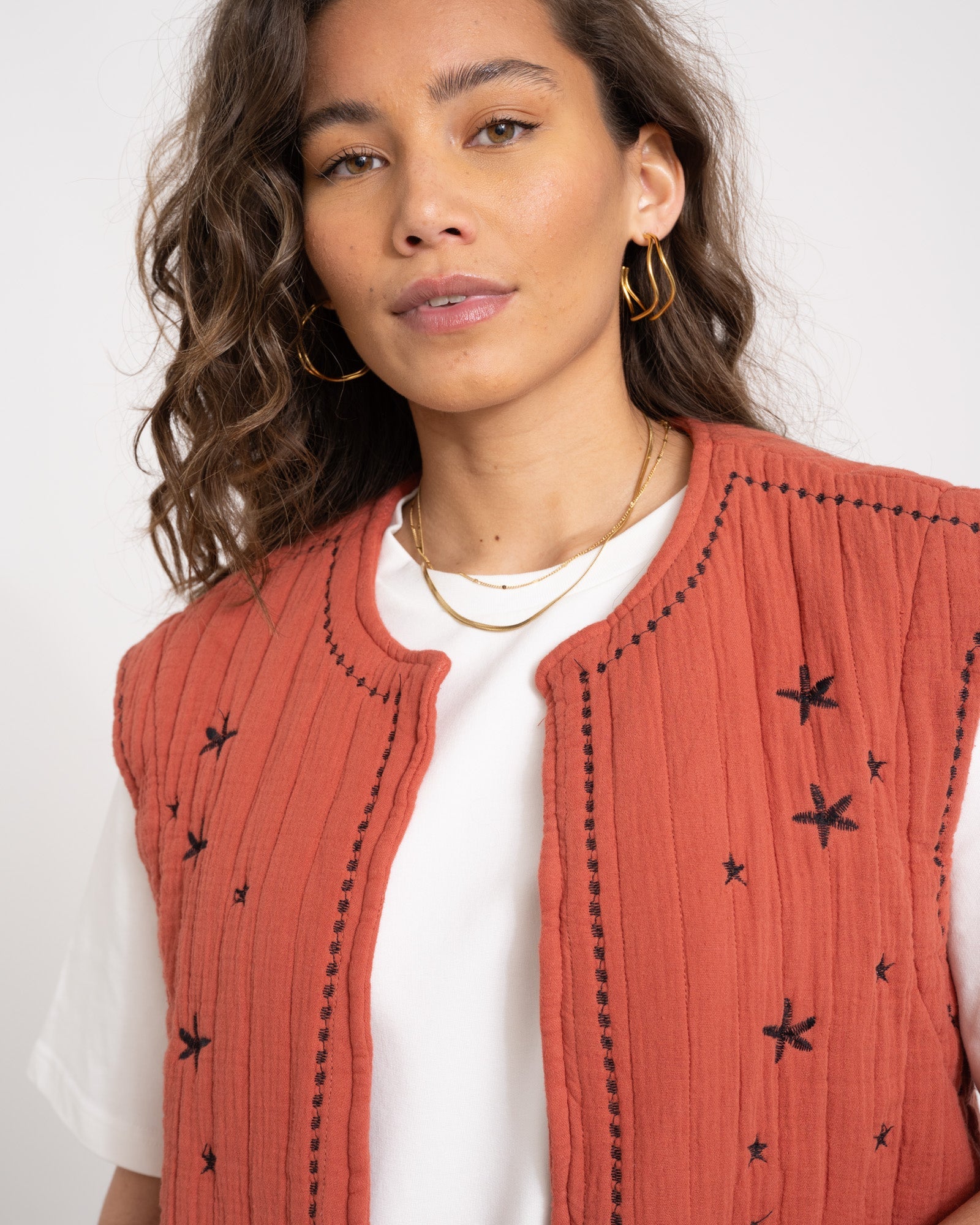 De Evi Embroidery Gilet is een dikkere, oversized gilet die je moeiteloos over je favoriete T-shirt gooit. De rijke pomegranate kleur en geborduurde sterren maken 'm net even anders dan anders.